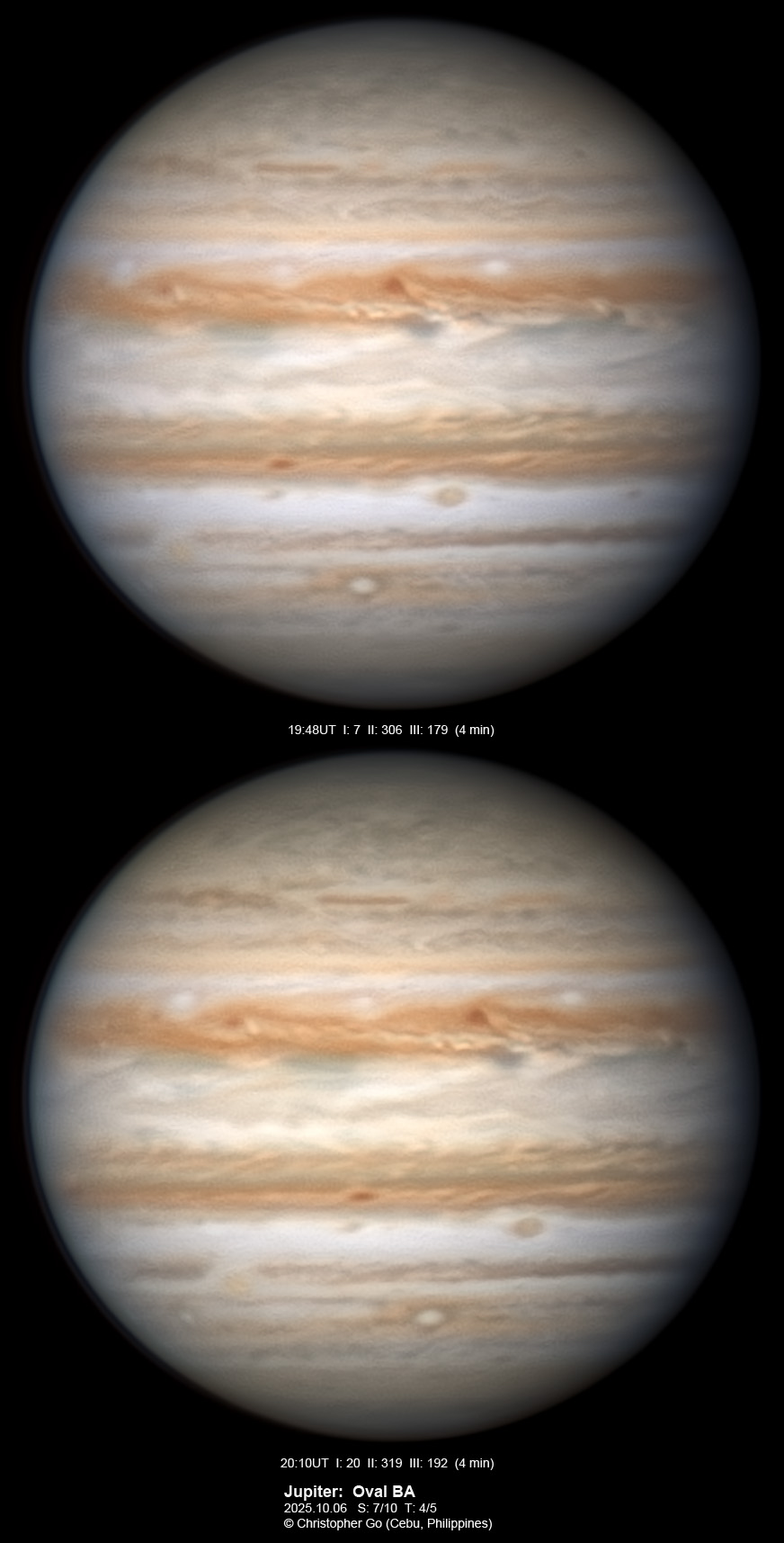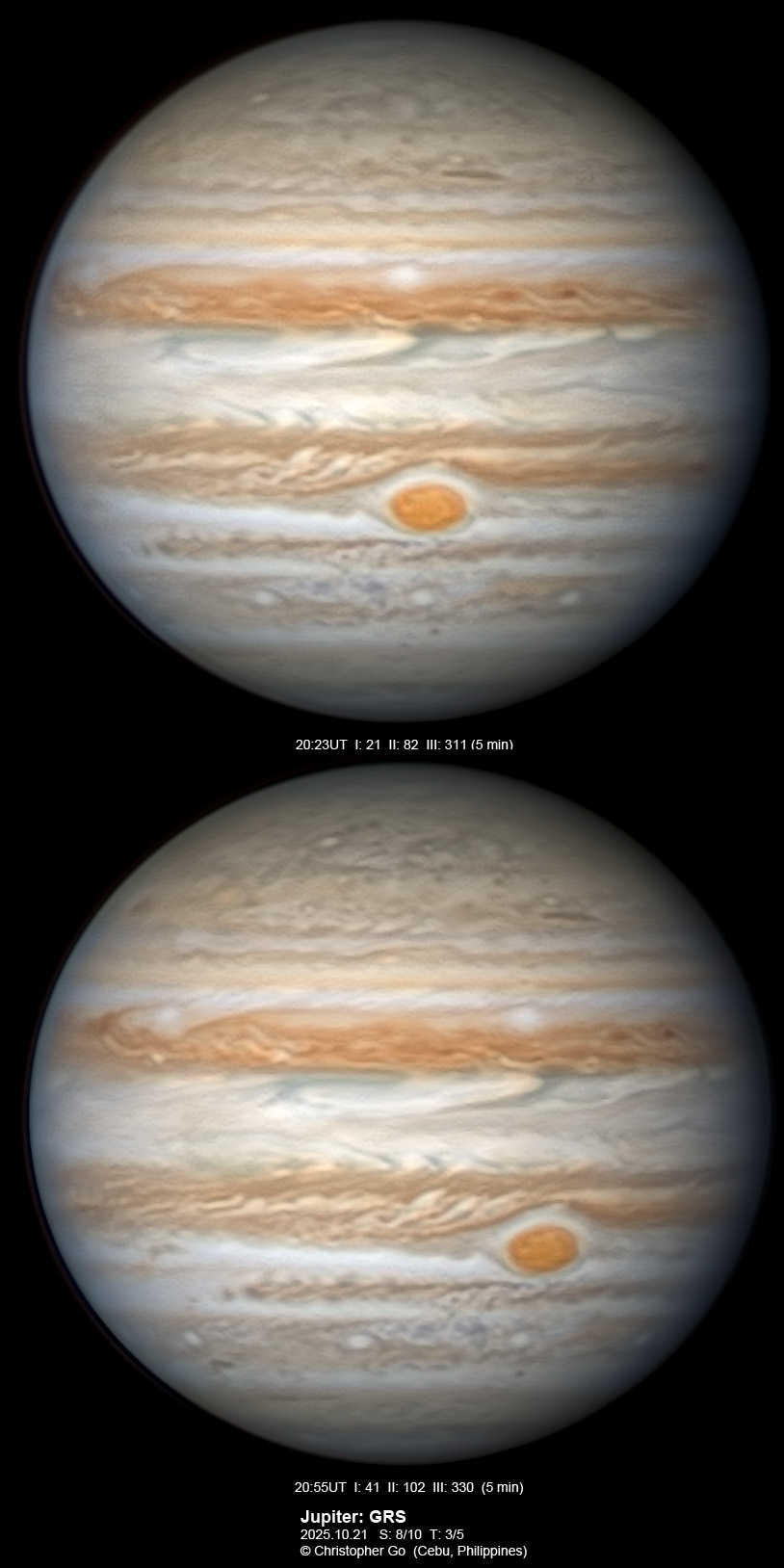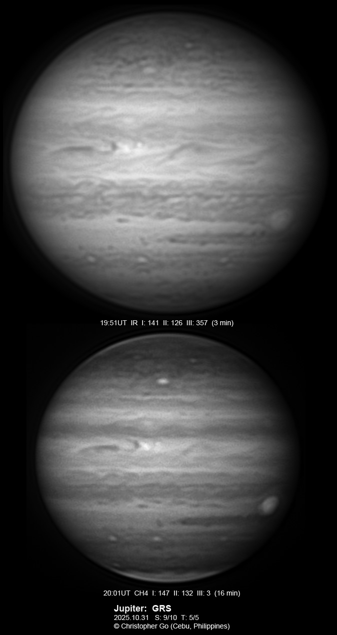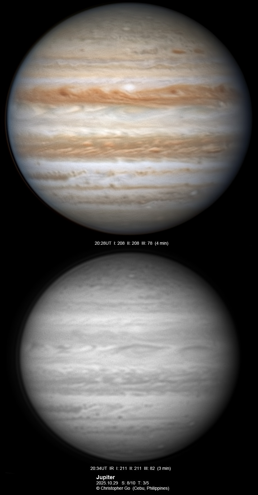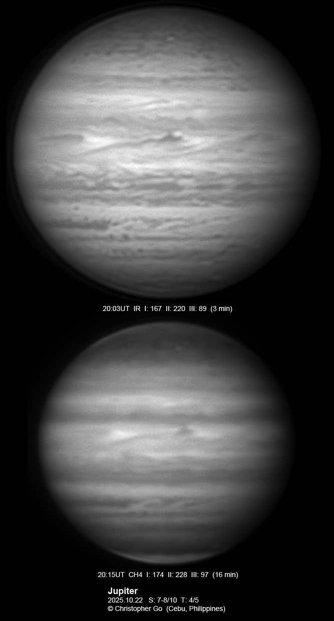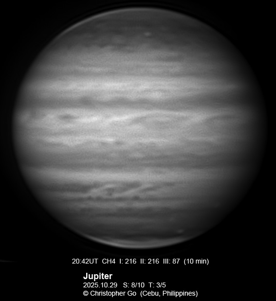 JUPITER 2025 SEASON By Christopher Go All images were taken using a Celestron C14 mounted on an Astrophysics AP900GTO mount. AQHY5III585M/C cameras were used is these images. RGB is done using a set of Chroma Technology RGB filters on a Starlight Xpress Motorized filter wheel. Methane band images are done using a Chroma Methane Band filter (889nm 18nm bandpass). UV images are done using a Astrodon UV filter. Amplification is done using an Astrophysics Advance Convertible Barlow working at 2.0X. Image acquisition was done using Torsten Edelmann's Firecapture 2.7 64bit software. All images are NORTH UP! Processing was done using AutoStakkert! and Registax. These images were taken at Banilad, Cebu City, Philippines. For more information on the names of various belts and zones of Jupiter and the meaning of the abbreviations I use please check the Sky and Telescope Jupiter Observing Guide. All images of this site are my property. If you wish to publish it on your site or print, please email me for permission. |