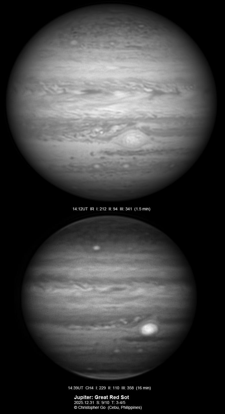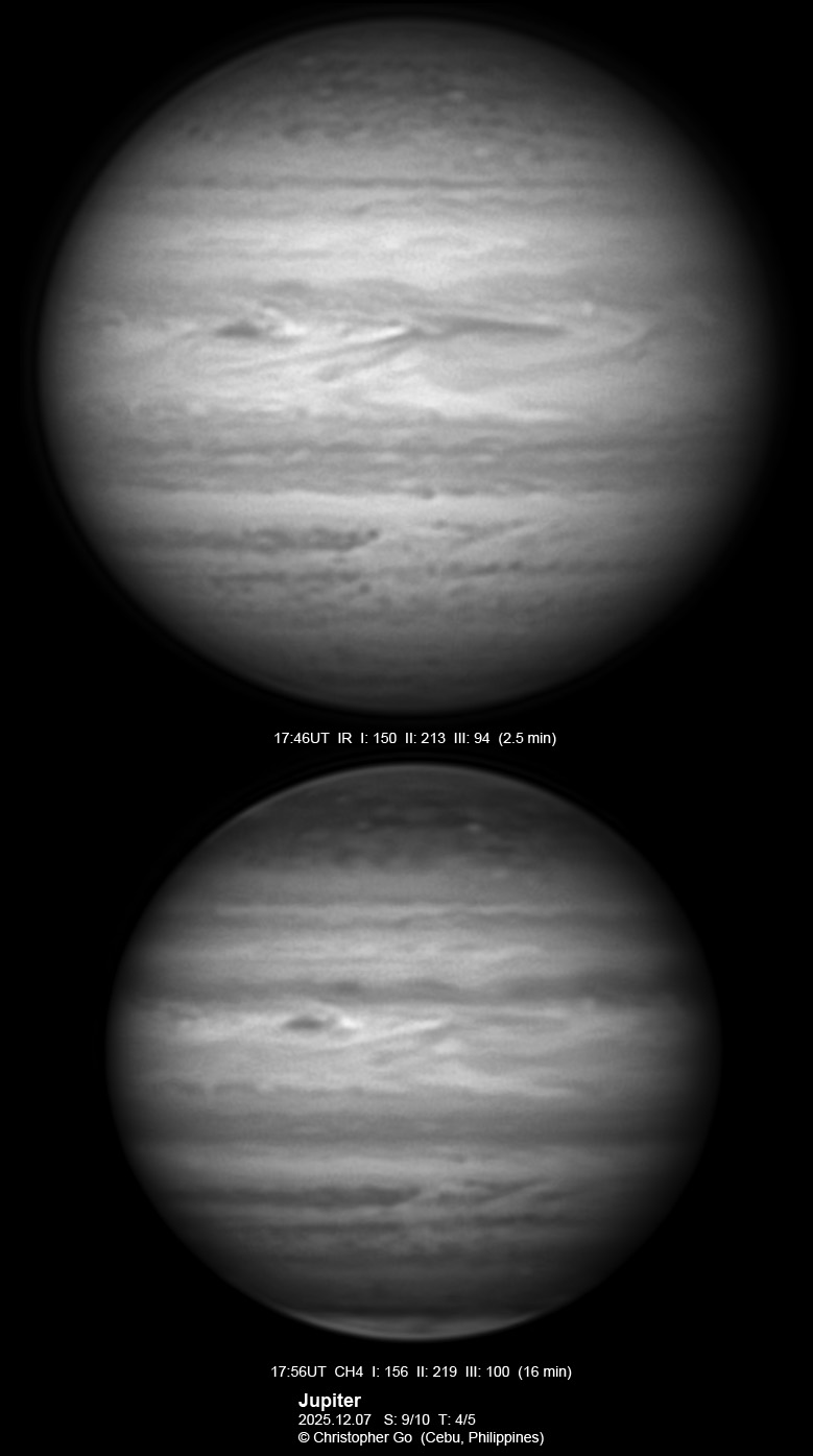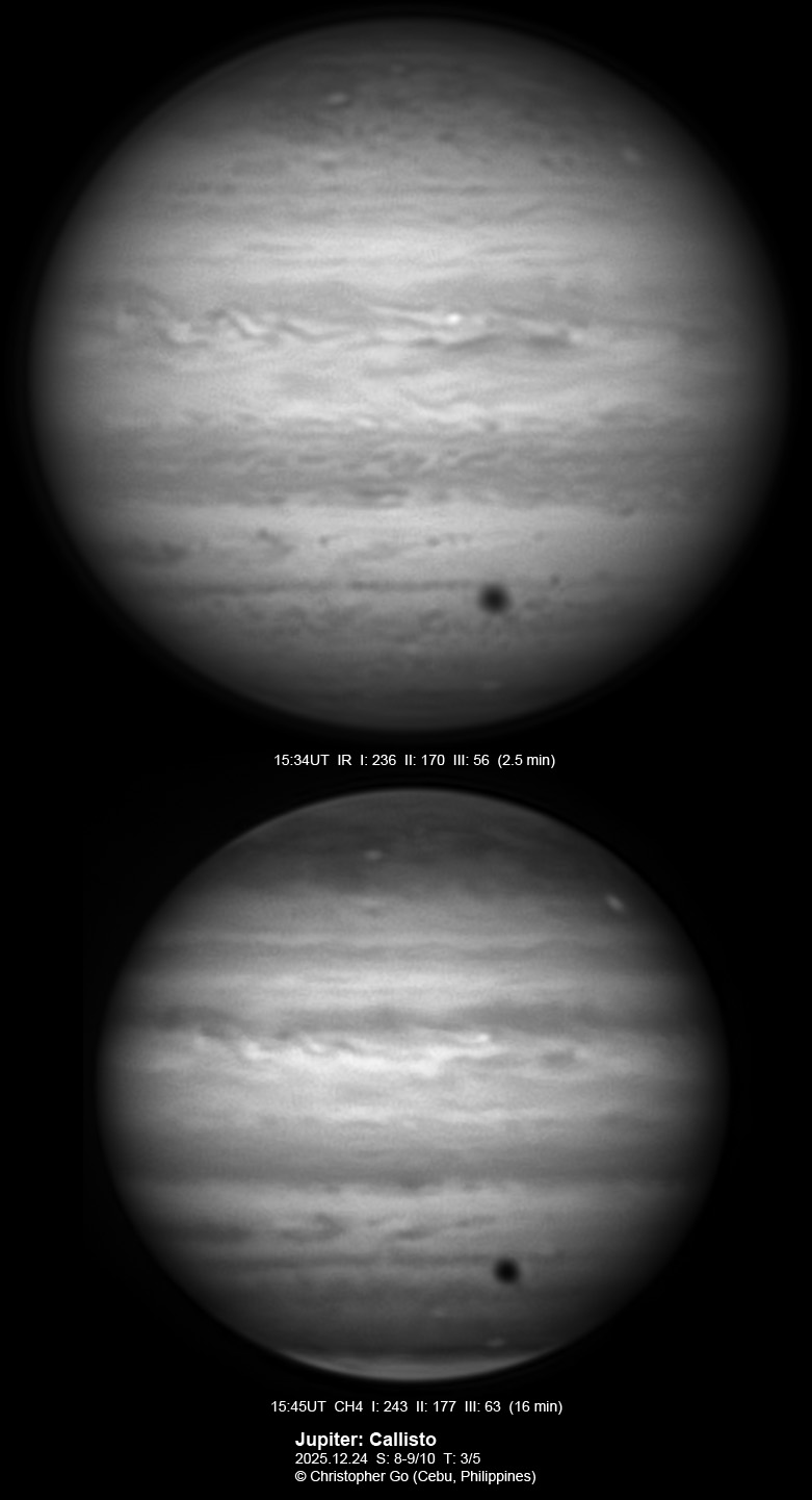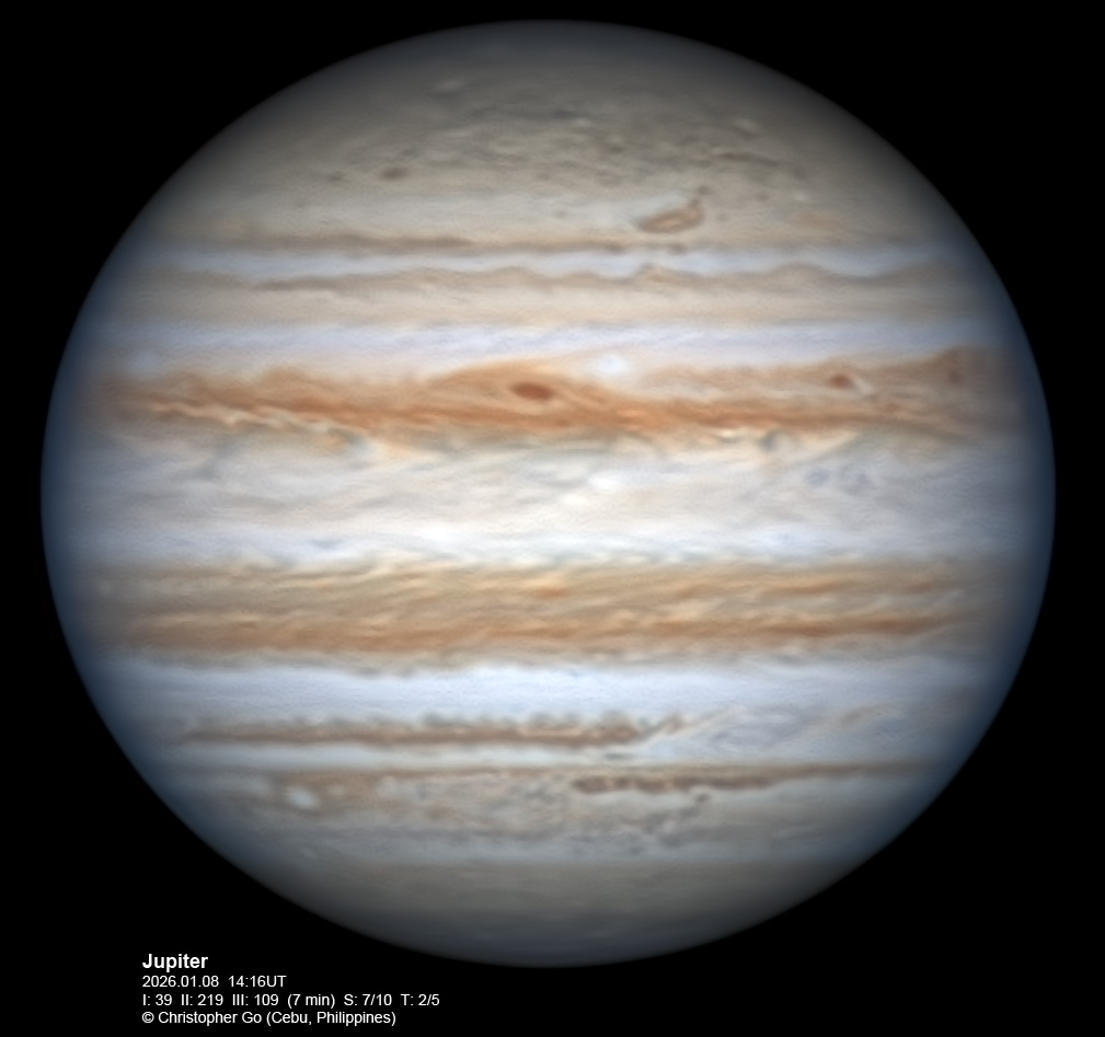 JUPITER 2025 SEASON By Christopher Go All images were taken using a Celestron C14 (with special optics) mounted on an Astrophysics AP900GTO mount. A QHY5III585M/C (either the color and mono version) cameras were used is these images. But most of my images are captured using the color version. Mono-RGB is done using a set of Chroma Technology RGB filters on a Starlight Xpress Motorized filter wheel. Methane band images are done using a Chroma Methane Band filter (889nm 18nm bandpass). UV images are done using an Astrodon UV filter. Amplification is done using an Astrophysics Advance Convertible Barlow working at 2.0X. A PrimaLuce Labs Esatto robotic focuser is attached to my C14 for fine focusing. Image acquisition was done using Torsten Edelmann's Firecapture 2.7 64bit software. All images are NORTH UP! Processing was done using AutoStakkert! and Registax. These images were captured at Banilad, Cebu City, Philippines. For more information on the names of various belts and zones of Jupiter and the meaning of the abbreviations I use please check the Sky and Telescope Jupiter Observing Guide. All images of this site are my property. If you wish to publish it on your site or print, please email me for permission. |