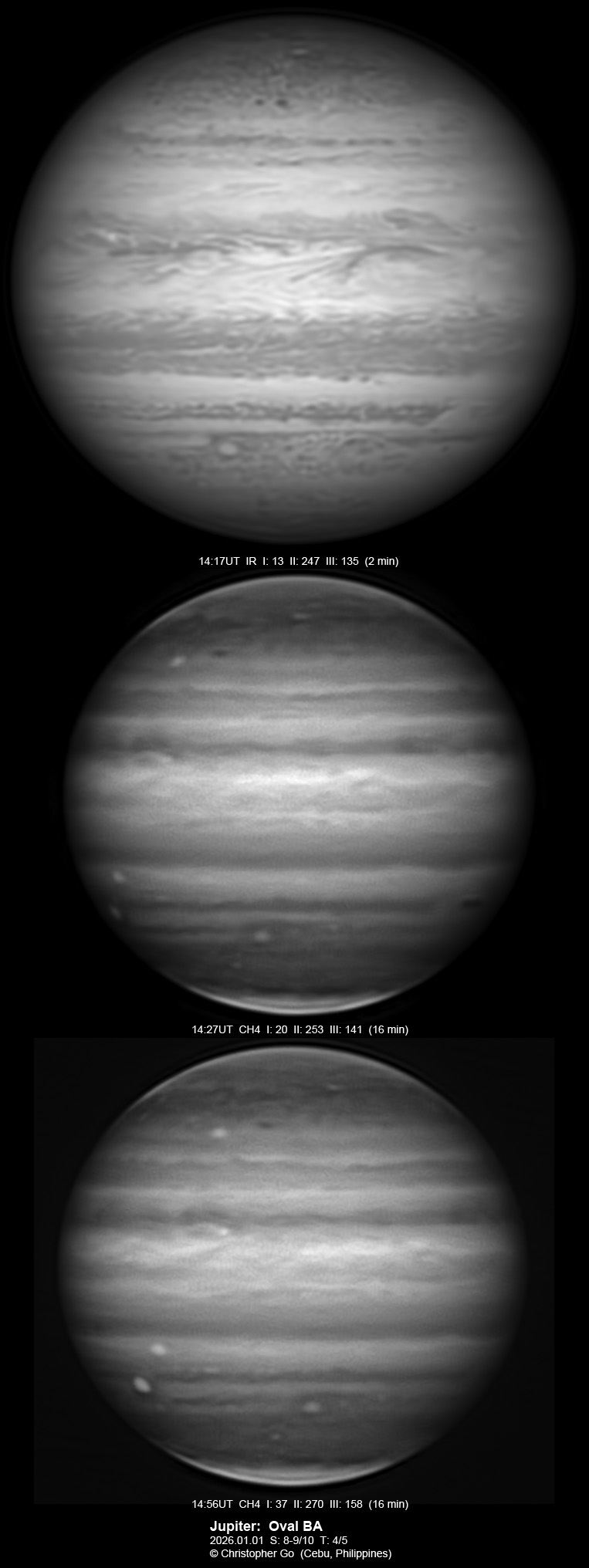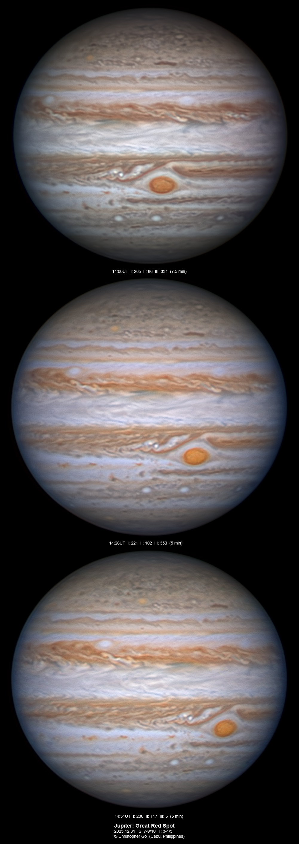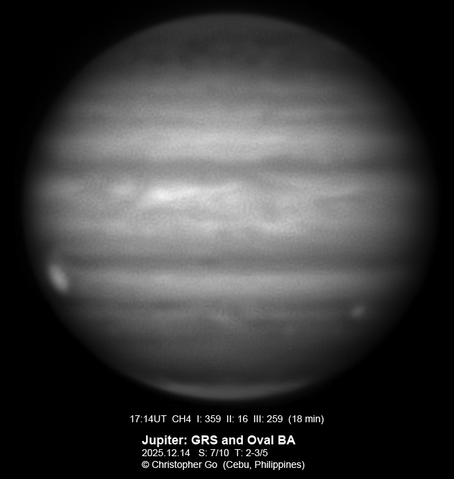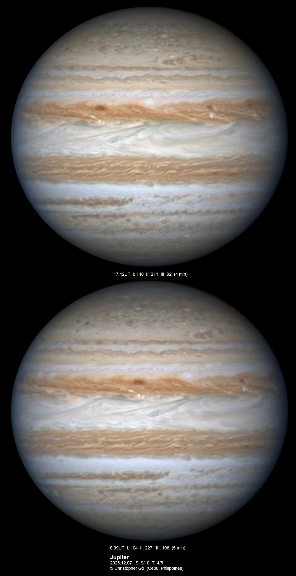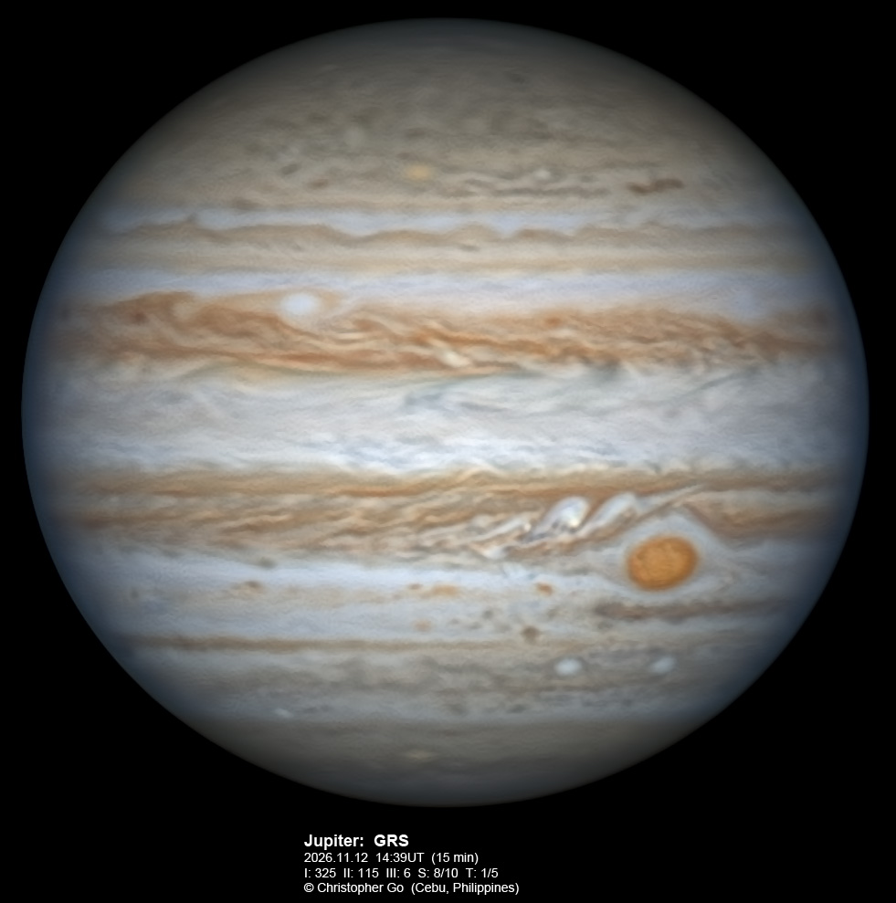 JUPITER 2025 SEASON By Christopher Go All images were taken using a Celestron C14 (with special optics) mounted on an Astrophysics AP900GTO mount. A QHY5III585M/C (either the color and mono version) cameras were used is these images. But most of my images are captured using the color version. Mono-RGB is done using a set of Chroma Technology RGB filters on a Starlight Xpress Motorized filter wheel. Methane band images are done using a Chroma Methane Band filter (889nm 18nm bandpass). UV images are done using an Astrodon UV filter. Amplification is done using an Astrophysics Advance Convertible Barlow working at 2.0X. A PrimaLuce Labs Esatto robotic focuser is attached to my C14 for fine focusing. Image acquisition was done using Torsten Edelmann's Firecapture 2.7 64bit software. All images are NORTH UP! Processing was done using AutoStakkert! and Registax. These images were captured at Banilad, Cebu City, Philippines. For more information on the names of various belts and zones of Jupiter and the meaning of the abbreviations I use please check the Sky and Telescope Jupiter Observing Guide. All images of this site are my property. If you wish to publish it on your site or print, please email me for permission. |