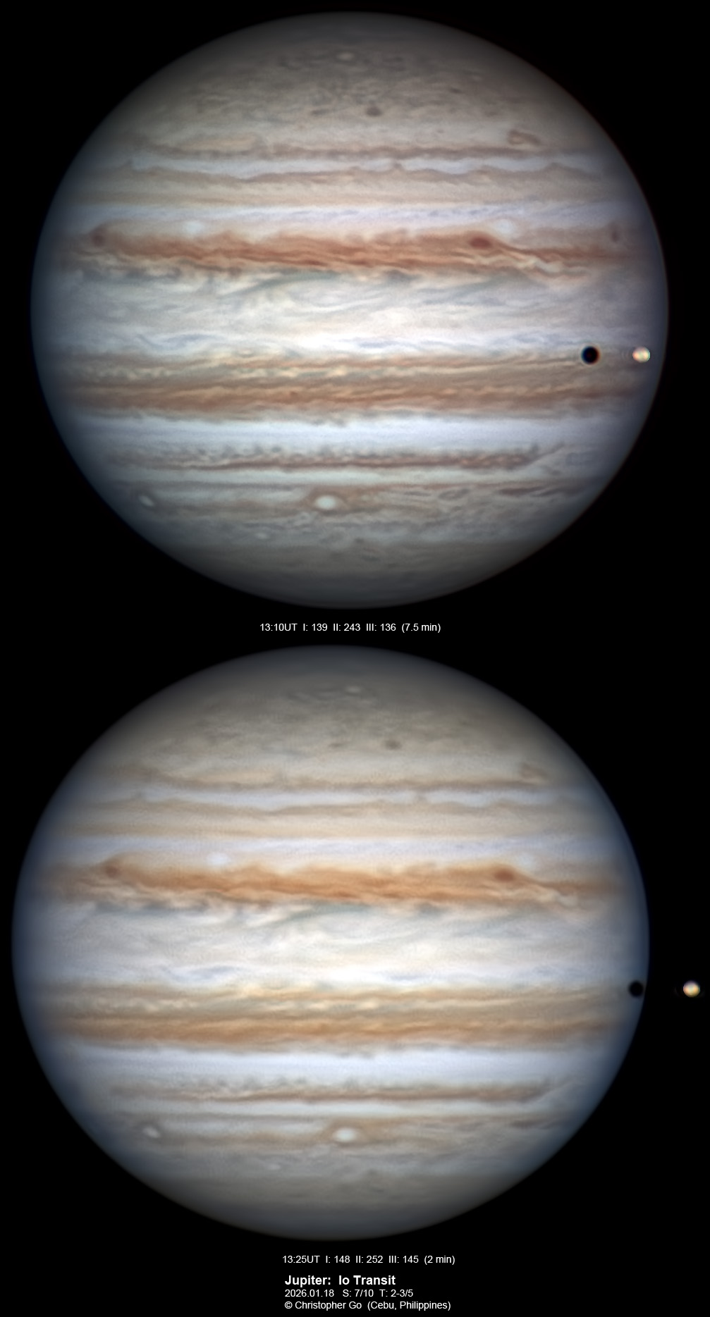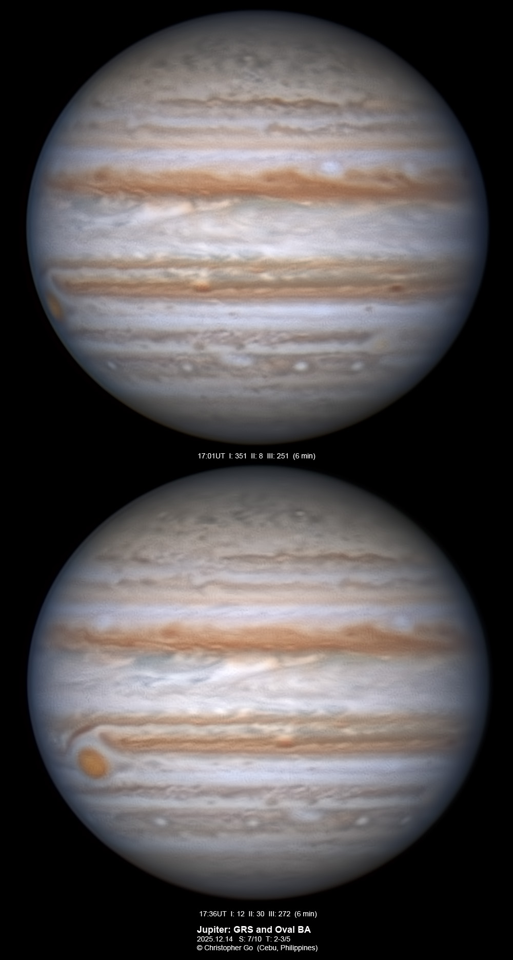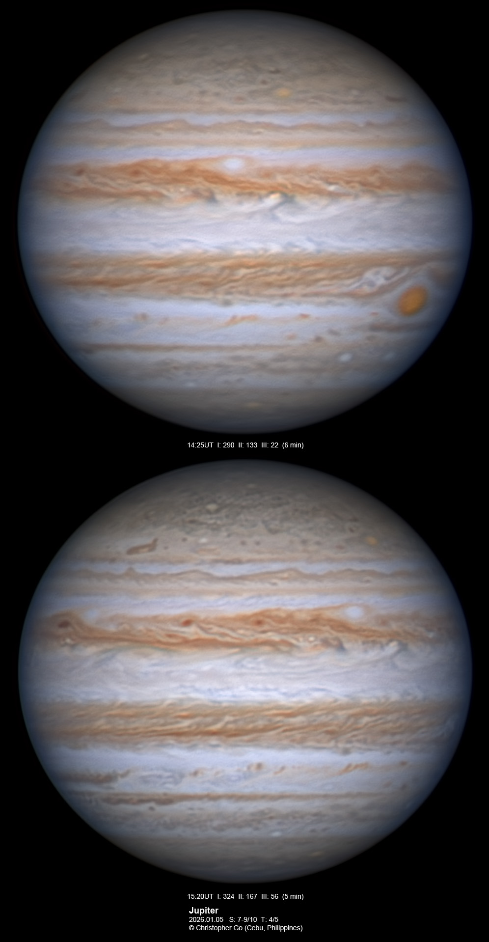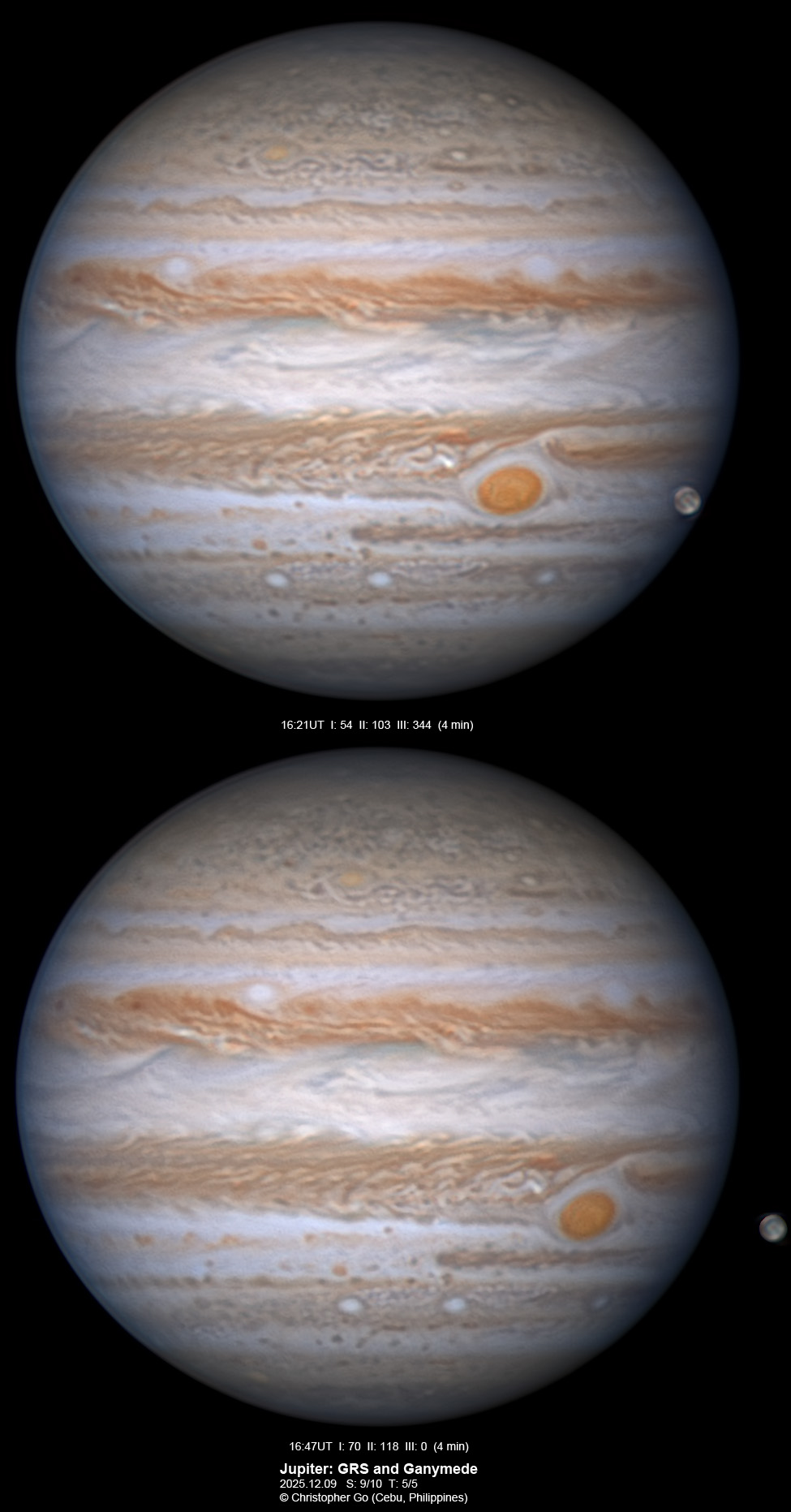 JUPITER 2025 SEASON By Christopher Go All images were taken using a Celestron C14 (with special optics) mounted on an Astrophysics AP900GTO mount. A QHY5III585M/C (either the color and mono version) cameras were used is these images. But most of my images are captured using the color version. Mono-RGB is done using a set of Chroma Technology RGB filters on a Starlight Xpress Motorized filter wheel. Methane band images are done using a Chroma Methane Band filter (889nm 18nm bandpass). UV images are done using an Astrodon UV filter. Amplification is done using an Astrophysics Advance Convertible Barlow working at 2.0X. A PrimaLuce Labs Esatto robotic focuser is attached to my C14 for fine focusing. Image acquisition was done using Torsten Edelmann's Firecapture 2.7 64bit software. All images are NORTH UP! Processing was done using AutoStakkert! and Registax. These images were captured at Banilad, Cebu City, Philippines. For more information on the names of various belts and zones of Jupiter and the meaning of the abbreviations I use please check the Sky and Telescope Jupiter Observing Guide. All images of this site are my property. If you wish to publish it on your site or print, please email me for permission. |