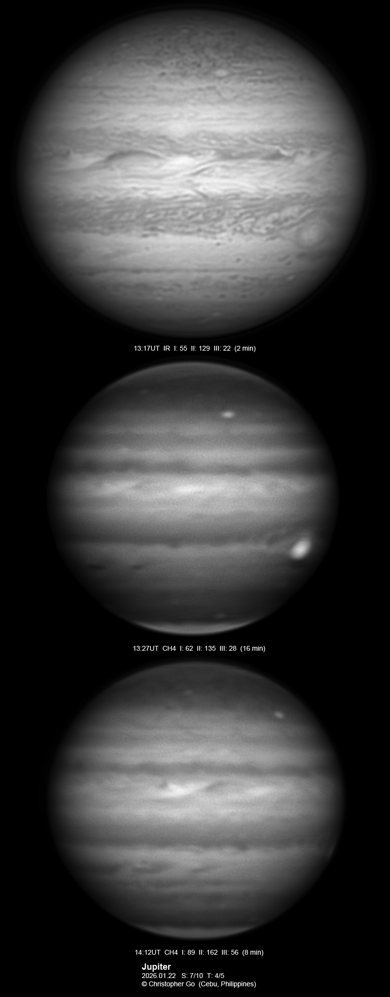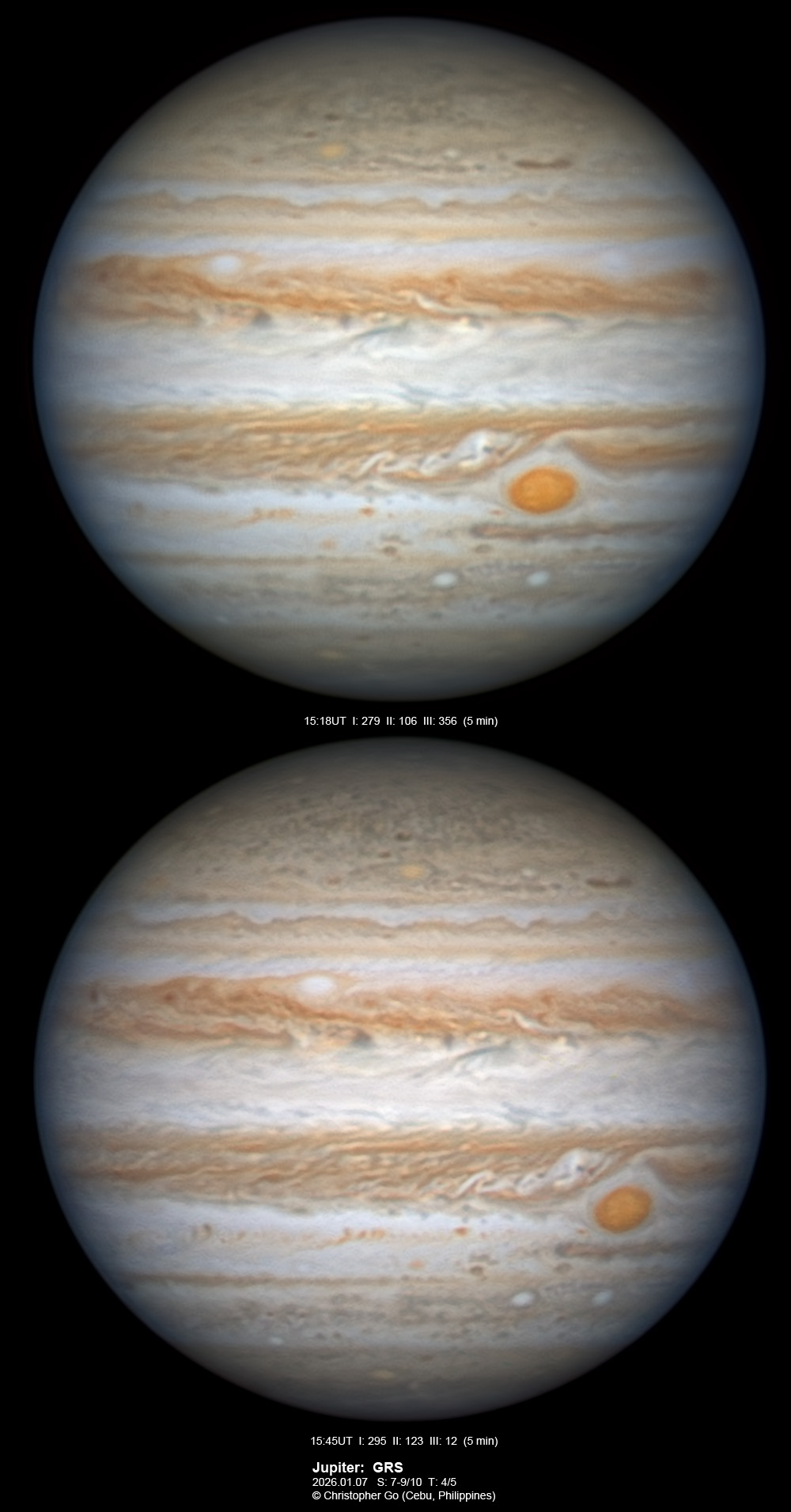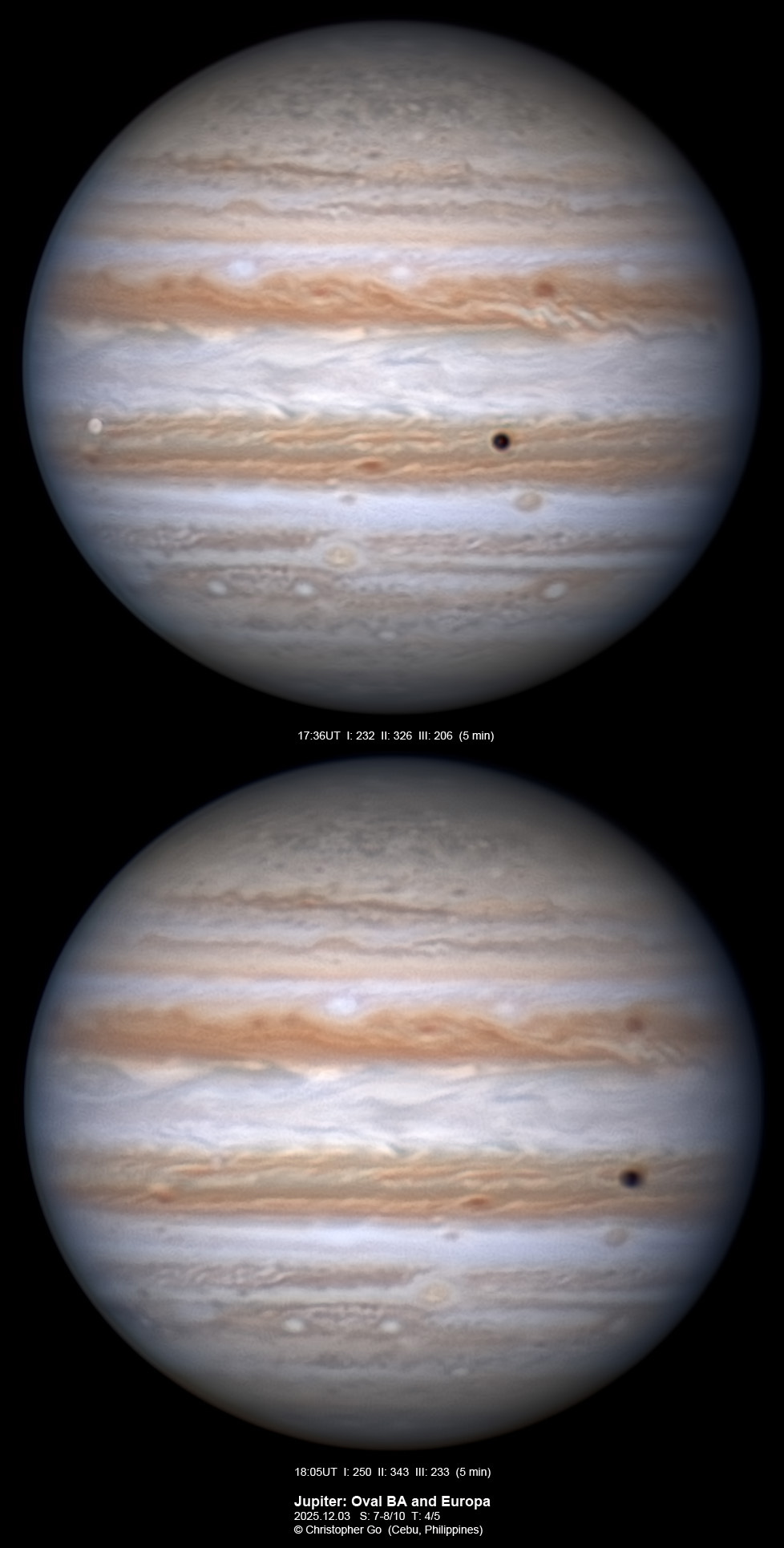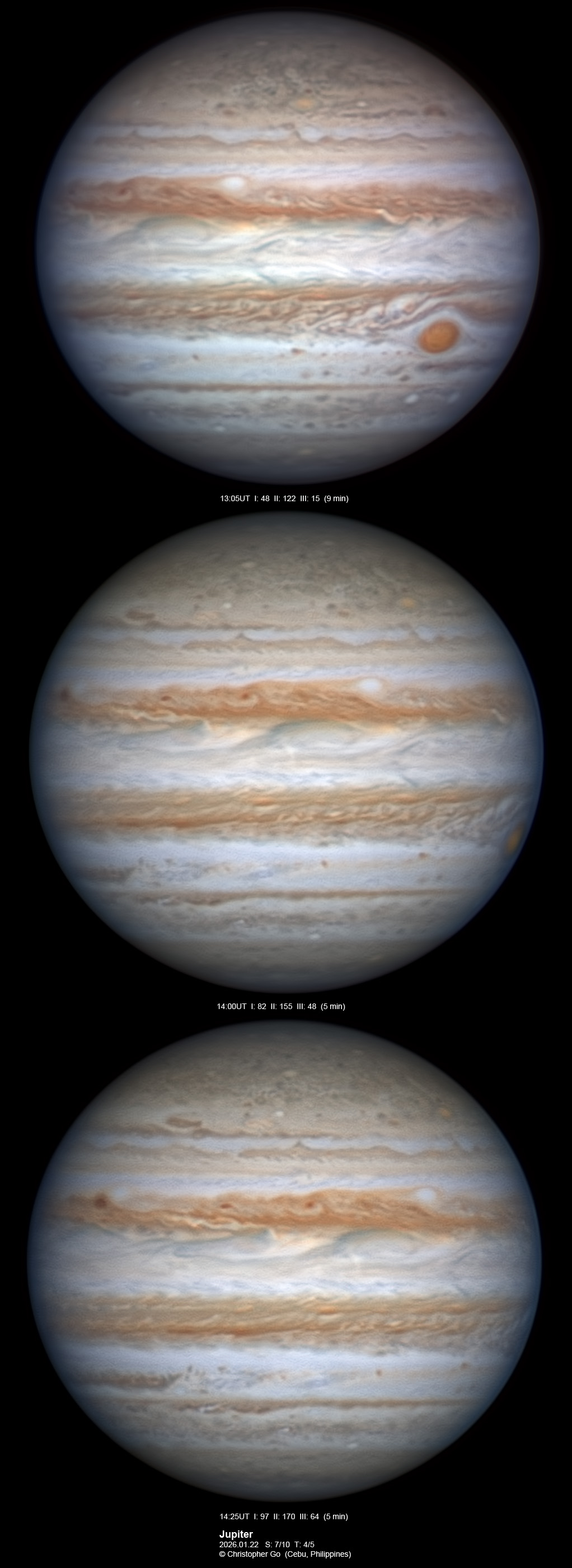 JUPITER 2025 SEASON By Christopher Go All images were taken using a Celestron C14 (with special optics) mounted on an Astrophysics AP900GTO mount. A QHY5III585M/C (either the color and mono version) cameras were used is these images. But most of my images are captured using the color version. Mono-RGB is done using a set of Chroma Technology RGB filters on a Starlight Xpress Motorized filter wheel. Methane band images are done using a Chroma Methane Band filter (889nm 18nm bandpass). UV images are done using an Astrodon UV filter. Amplification is done using an Astrophysics Advance Convertible Barlow working at 2.0X. A PrimaLuce Labs Esatto robotic focuser is attached to my C14 for fine focusing. Image acquisition was done using Torsten Edelmann's Firecapture 2.7 64bit software. All images are NORTH UP! Processing was done using AutoStakkert! and Registax. These images were captured at Banilad, Cebu City, Philippines. For more information on the names of various belts and zones of Jupiter and the meaning of the abbreviations I use please check the Sky and Telescope Jupiter Observing Guide. All images of this site are my property. If you wish to publish it on your site or print, please email me for permission. |