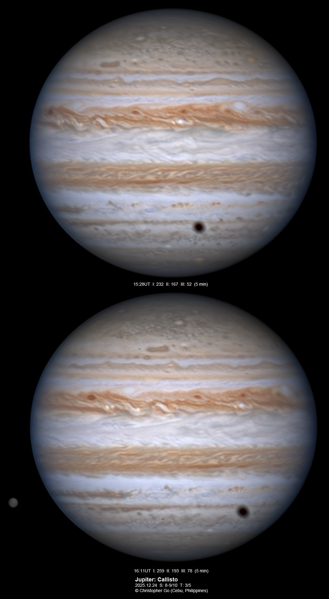 Callisto's shadow is in transit. It is interesting to see that it's shadow has a penumbra! There is a bright outbreak in the NEBs at the CM of the first image. There are small red ovals on the NTBn. The STB shows the STB Ghost. The south polar red spot can be seen on the first image.