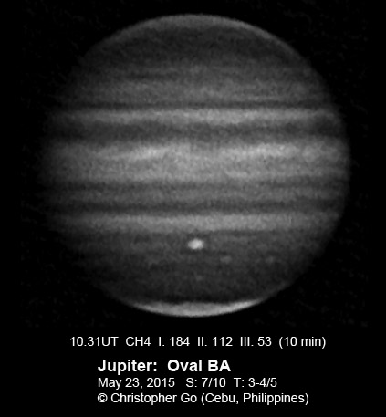 Condition was very bad here during the last 3 days because of Super Typhoon Noul. Fortunately things were very good this evening! Seeing was excellent! Oval BA is well resolved in these images. Note the center white ring has a dark border! This dark feature is also visible in the IR image. Note that the SPR has a darkish on visible light. There is a very dark band on the SEBs. Note the small white spot on the mid-SEB! The SEBn has a lot of complex activity! There are light rifts on the NEB. There seem to be some dark features on the NEBn.