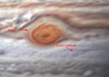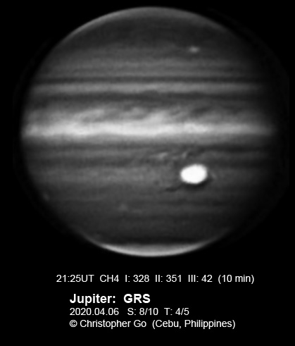2020 Except for some slight haze, seeing was perfect today. There are exceptional details resolved inside the GRS. Aside from the dark core, note the bright white streak on the p side of the GRS core. Note also the red streak on the p side of the GRS. This feature is bright in methane band. Is this a flake remnant. There is also a very bright outbreak on the wake of the GRS. The NEB is very chaotic. There are two outbreaks that can be seen. The NNTZ LRS is prominent. Note the small spot above the NNTZ LRS, it also looks red but not very bright in methane band.