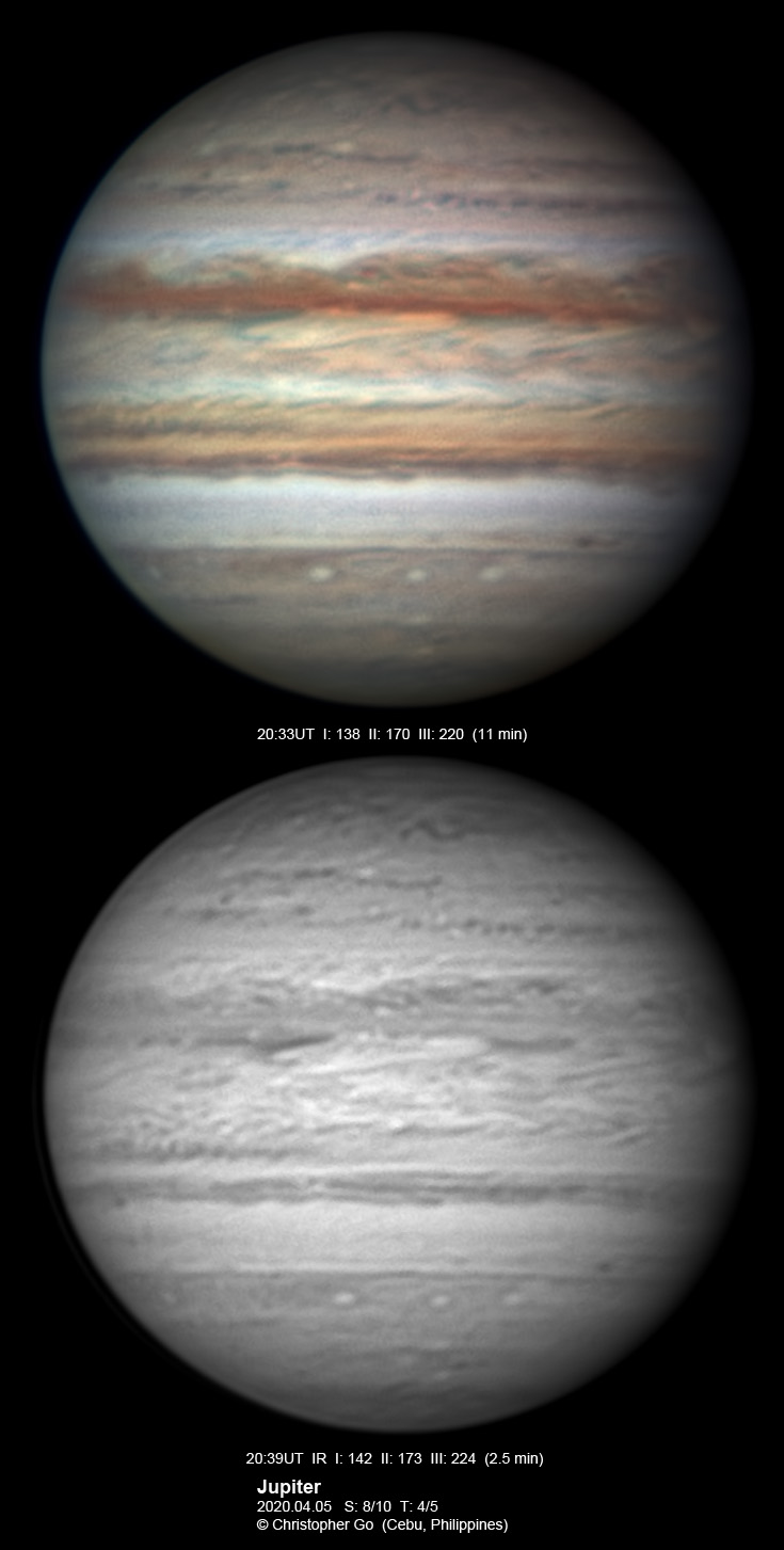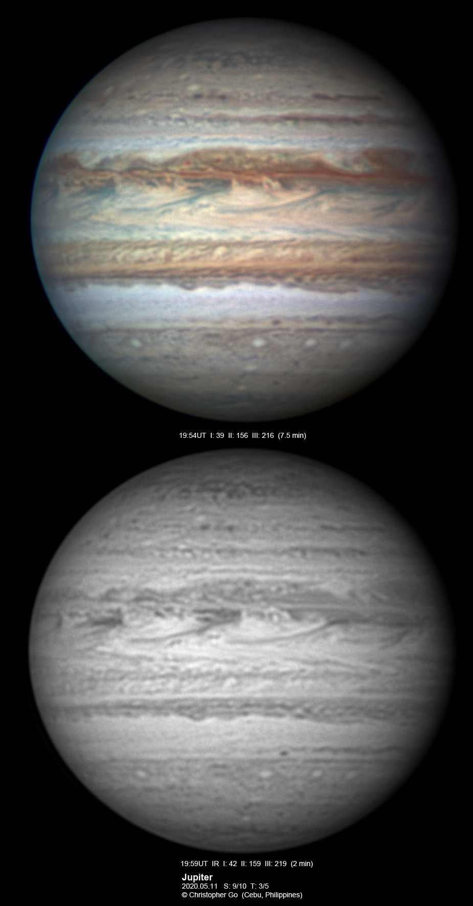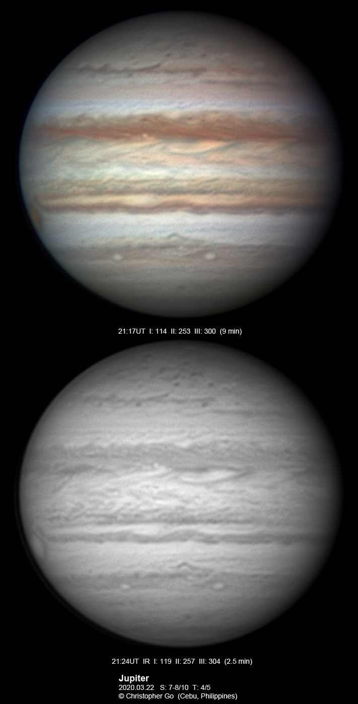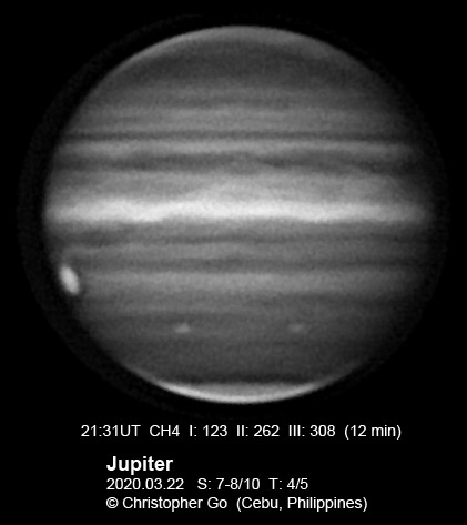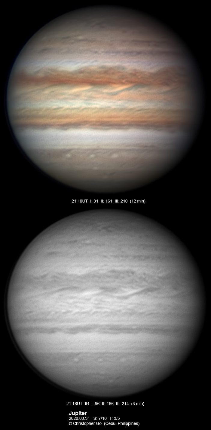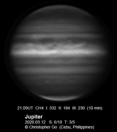 JUPITER 2020 SEASON By Christopher Go All images were taken using a Celestron C14 mounted on an Astrophysics AP900GTO mount. A QHY 290M camera was used is these images. RGB is done using a set of Chroma Technology RGB filters on a Starlight Xpress Motorized filter wheel. Methane band images are done using a Chroma Methane Band filter (889nm 18nm bandpass). UV images are done using a Astrodon UV filter. Amplification is done using an Astrophysics Advance Convertible Barlow working at 2.0X. Image acquisition was done using Torsten Edelmann's Firecapture 2.5beta 64bit software. All images are NORTH UP! Processing was done using AutoStakkert! and Registax. These images were taken at Banilad, Cebu City, Philippines. For more information on the names of various belts and zones of Jupiter and the meaning of the abbreviations I use please check the Sky and Telescope Jupiter Observing Guide. All images of this site are my property. If you wish to publish it on your site or print, please email me for permission. |