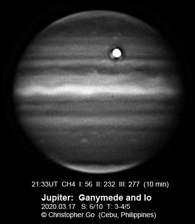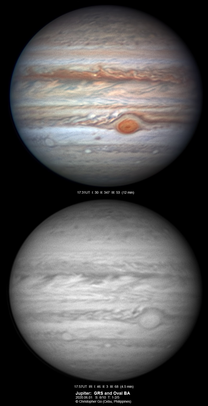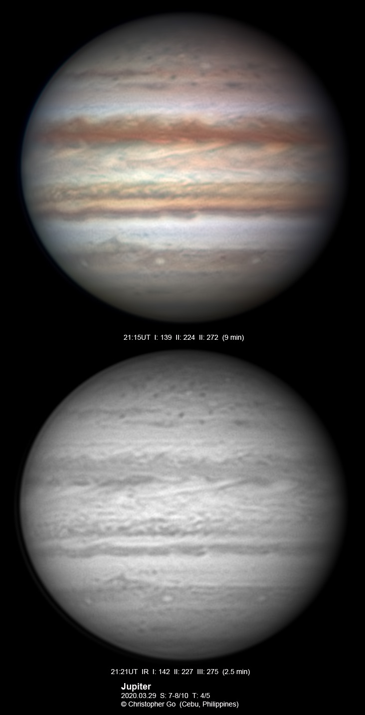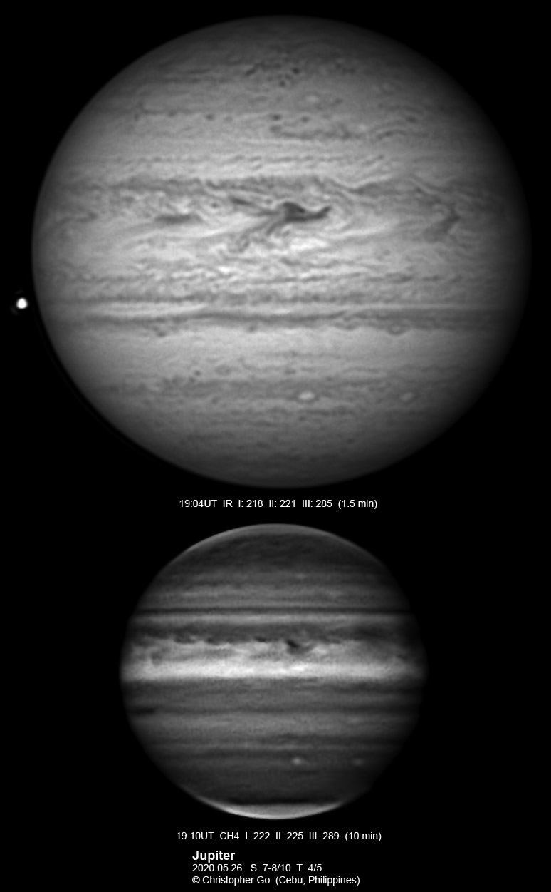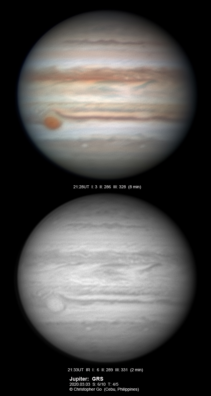 JUPITER 2020 SEASON By Christopher Go All images were taken using a Celestron C14 mounted on an Astrophysics AP900GTO mount. A QHY 290M camera was used is these images. RGB is done using a set of Chroma Technology RGB filters on a Starlight Xpress Motorized filter wheel. Methane band images are done using a Chroma Methane Band filter (889nm 18nm bandpass). UV images are done using a Astrodon UV filter. Amplification is done using an Astrophysics Advance Convertible Barlow working at 2.0X. Image acquisition was done using Torsten Edelmann's Firecapture 2.5beta 64bit software. All images are NORTH UP! Processing was done using AutoStakkert! and Registax. These images were taken at Banilad, Cebu City, Philippines. For more information on the names of various belts and zones of Jupiter and the meaning of the abbreviations I use please check the Sky and Telescope Jupiter Observing Guide. All images of this site are my property. If you wish to publish it on your site or print, please email me for permission. |