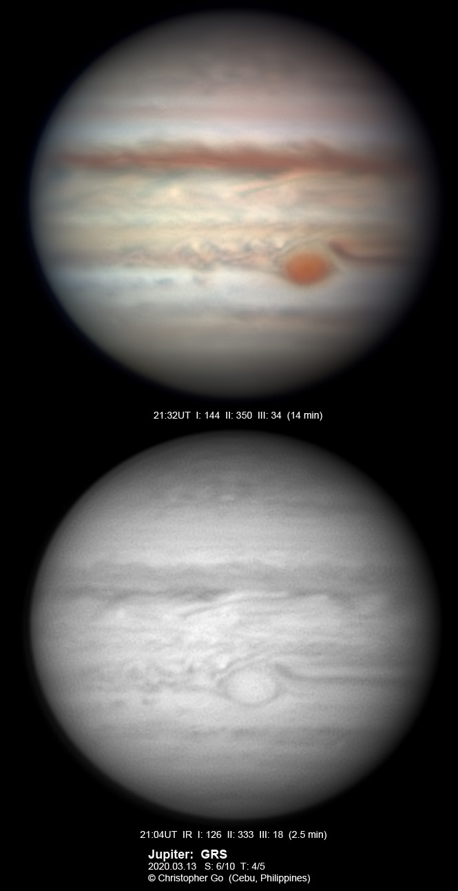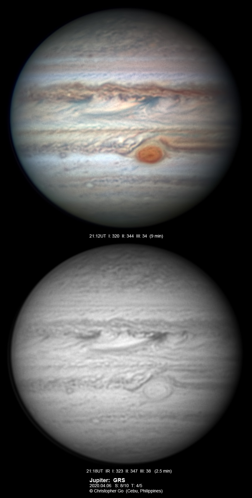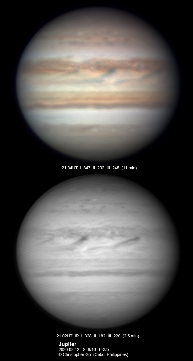 2020 Now I understand why they call a gap in the clouds "sucker holes". It was mostly cloudy today but there was a big clearing around Jupiter. I setup my imaging system. After taking 2 sets of RGB, the clouds rolled in the and the sky was overcast! I took down my system. After taking down my system completely, the sky around Jupiter cleared again! So I set up again only to be overcast right after I finish setting up. Grrrr! I went back to sleep! Fortunately seeing was excellent when I took the two images although transparency was deteriorated as the clouds rolled in. I am happy that I took those 2 sets as the result is acceptable. The GRS can be seen here. Note the bright ovals on the p side of the GRS. There is a hint of a flake on the f side of the GRS. Some outbreaks can be seen on the wake of the GRS. The NEB is very turbulent and shows complex riftings. The NNTZ LRS is prominent and very red!