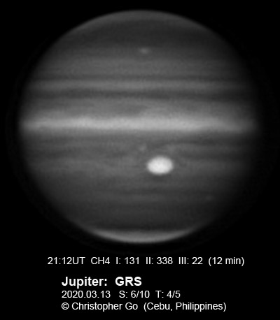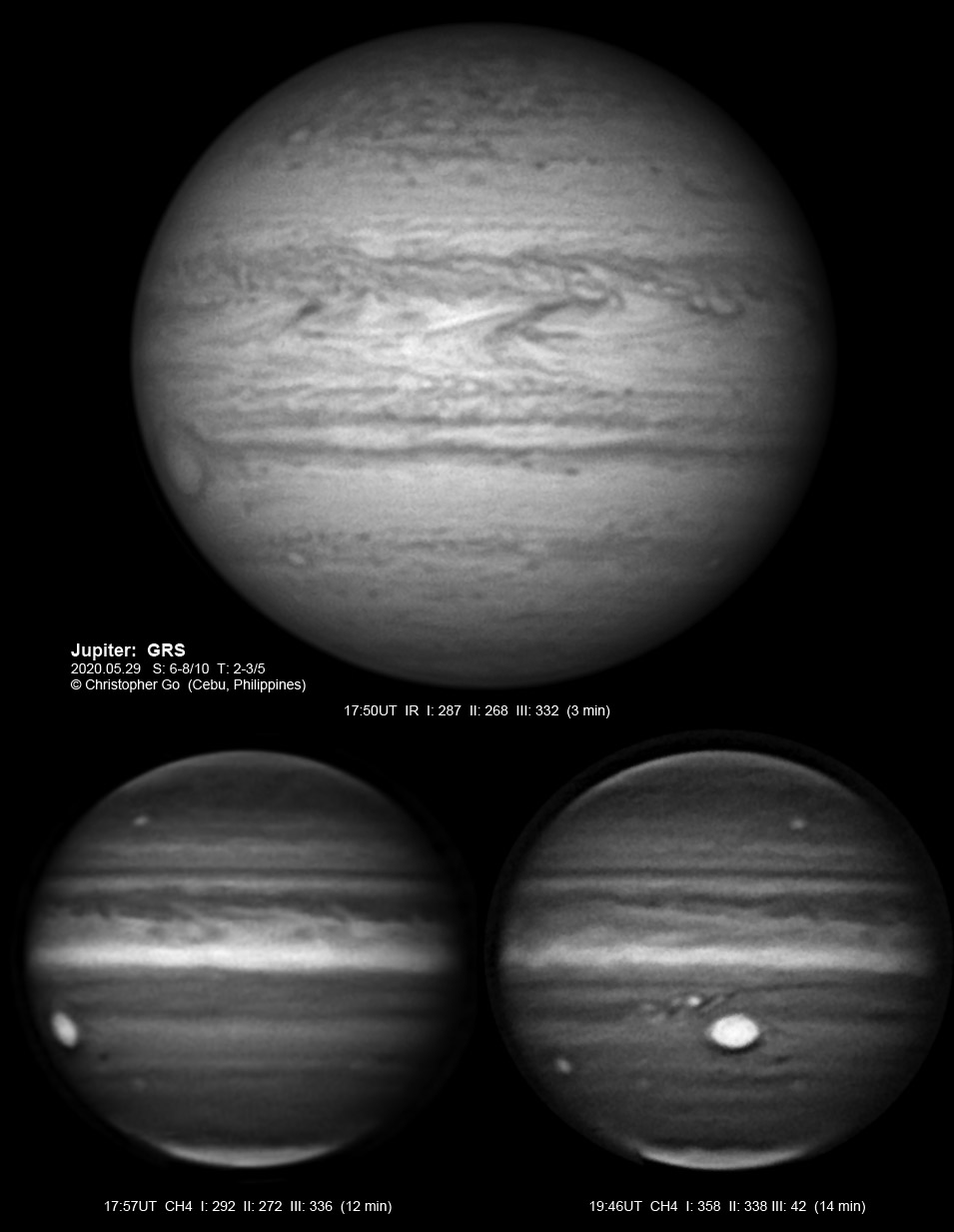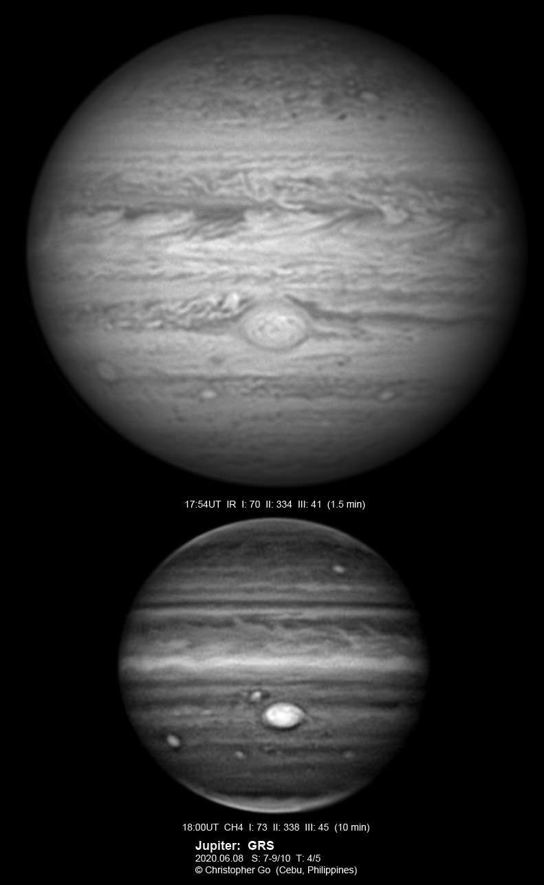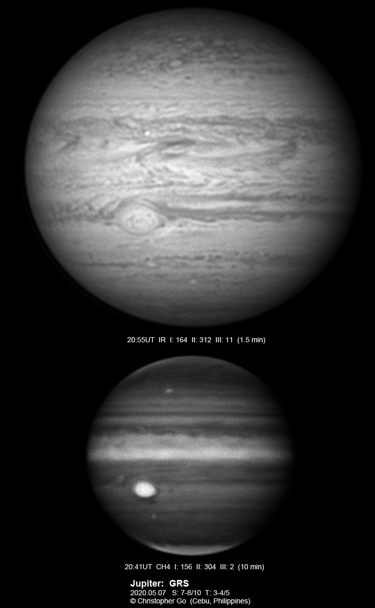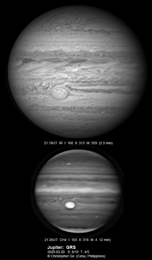 2020 Seeing was good today. I finally have some decent images of Jupiter! The GRS is prominent on these images. Seeing was so good that details inside the GRS are well resolved! As Niall has mentioned in his observations, the chimney above the GRS is open! The GRS halo and chimney are bright in methane band! The wake of the GRS is very turbulent and bright outbreaks can be seen developing! Note the reddish streak on the STrZ on the immediate SW of the GRS. The southern NEB is very dark red. The northern part of the NEB is seem to be fading. The NNTZ LRS is prominent. A hint of the red ring can be seen.