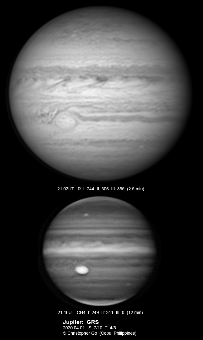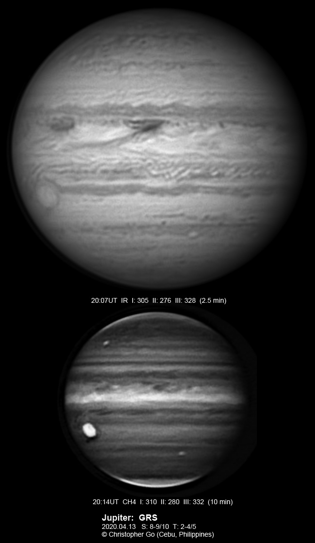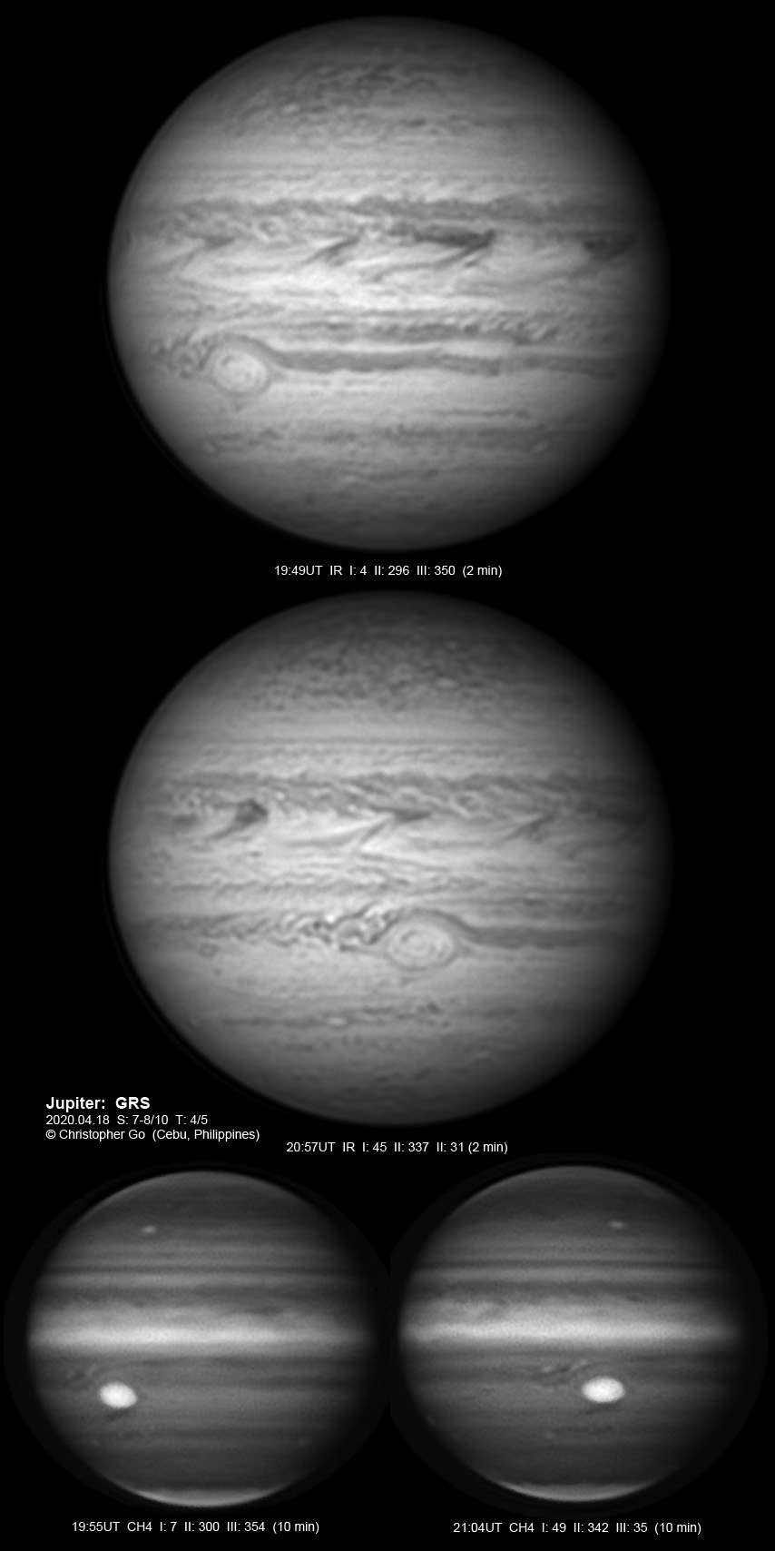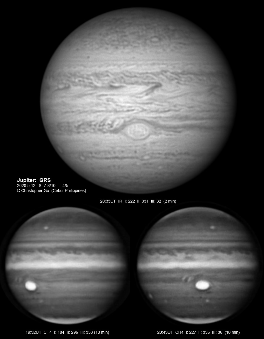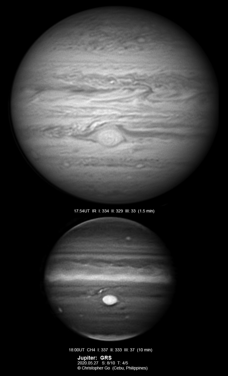 2020 Seeing was good today. I finally have some decent images of Jupiter! The GRS is prominent on these images. Seeing was so good that details inside the GRS are well resolved! As Niall has mentioned in his observations, the chimney above the GRS is open! The GRS halo and chimney are bright in methane band! The wake of the GRS is very turbulent and bright outbreaks can be seen developing! Note the reddish streak on the STrZ on the immediate SW of the GRS. The southern NEB is very dark red. The northern part of the NEB is seem to be fading. The NNTZ LRS is prominent. A hint of the red ring can be seen.