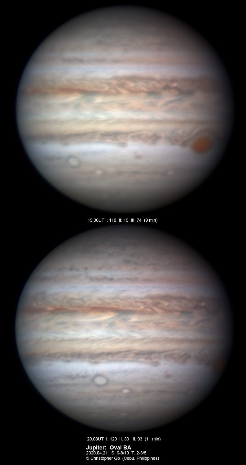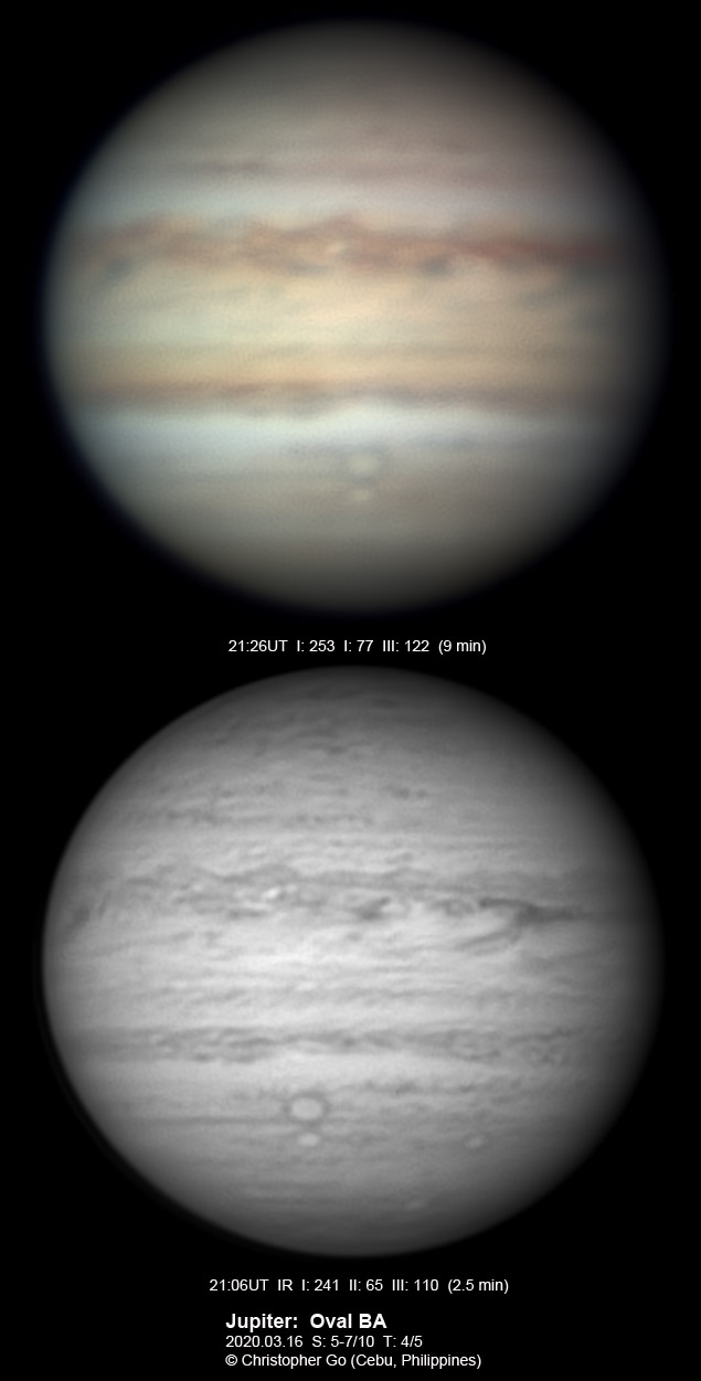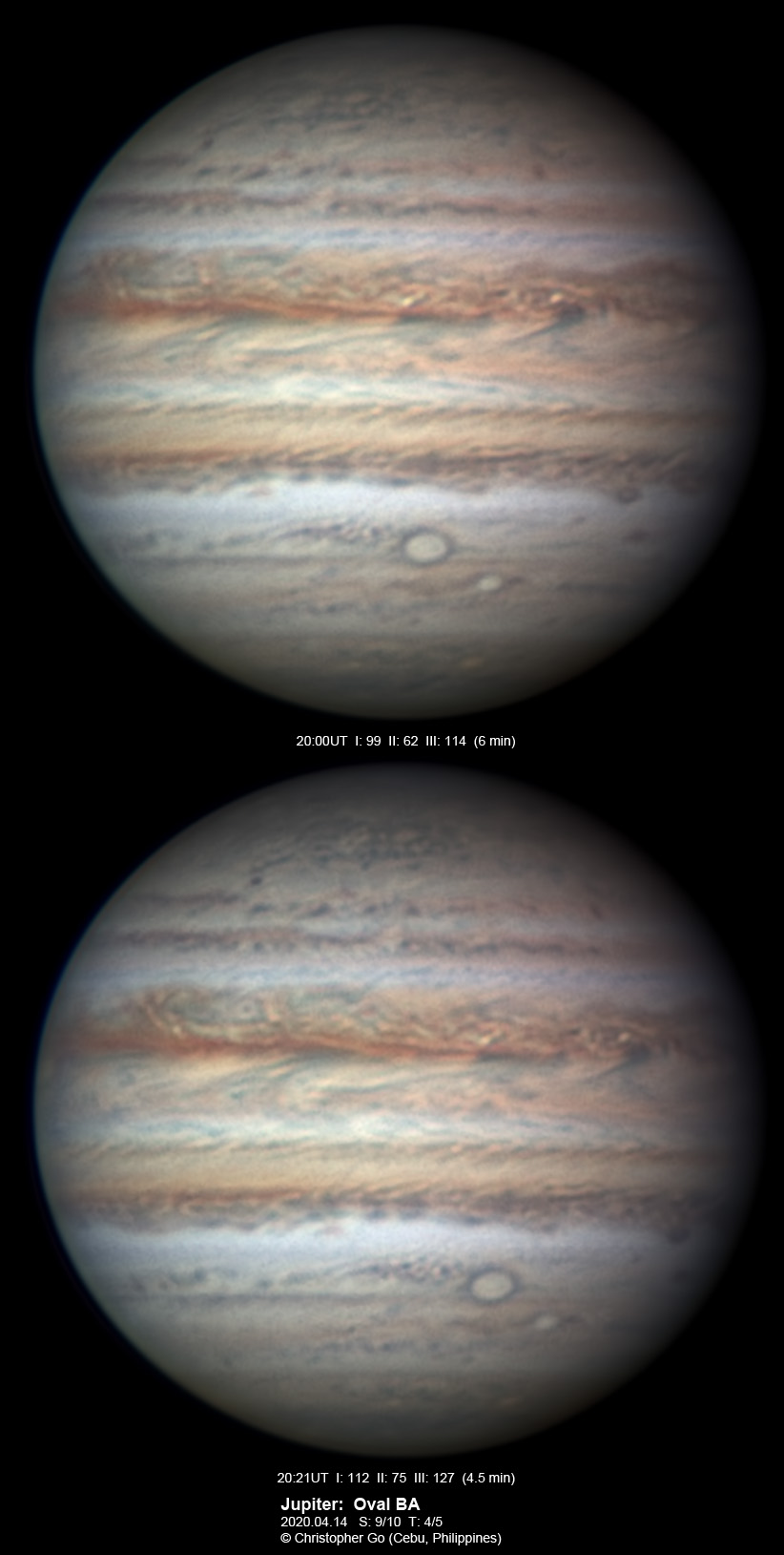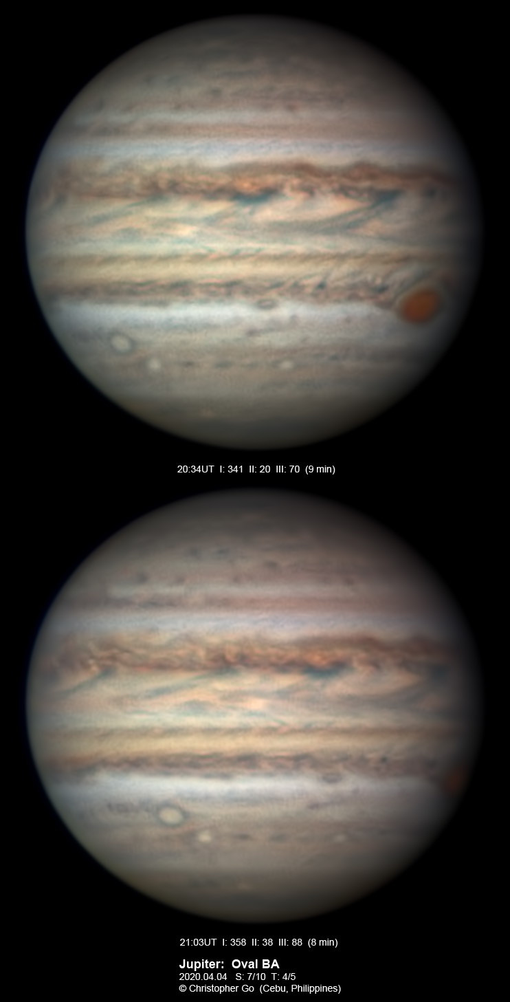 2020 Condition was very poor today. Seeing was unstable and I had to image through clouds! Oval BA can be see on these images. The SSTB spot is now moving away from Oval BA. The SEBs is turbulent while the mid-SEB is very pale. The NEB has a lot of rift activities.