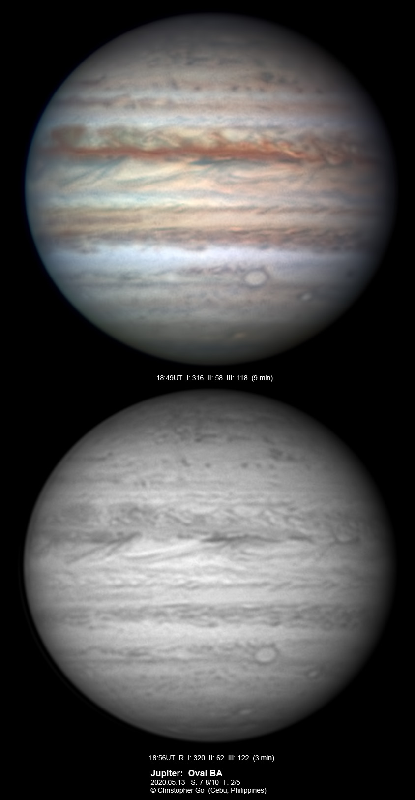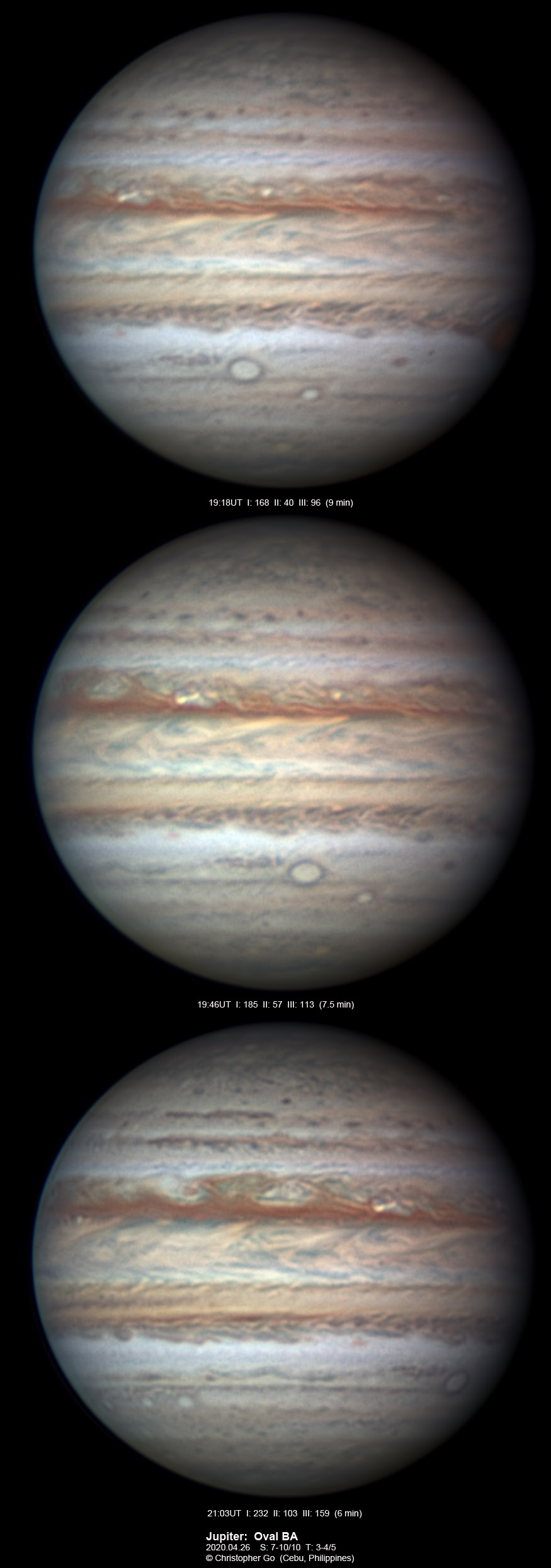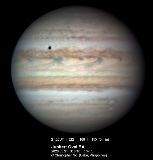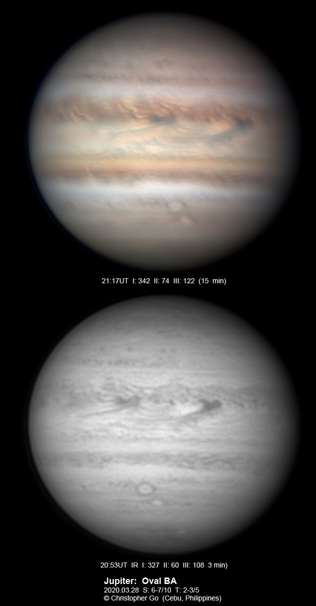2020 Condition was very poor today. Seeing was unstable and I had to image through clouds! Oval BA can be see on these images. The SSTB spot is now moving away from Oval BA. The SEBs is turbulent while the mid-SEB is very pale. The NEB has a lot of rift activities.