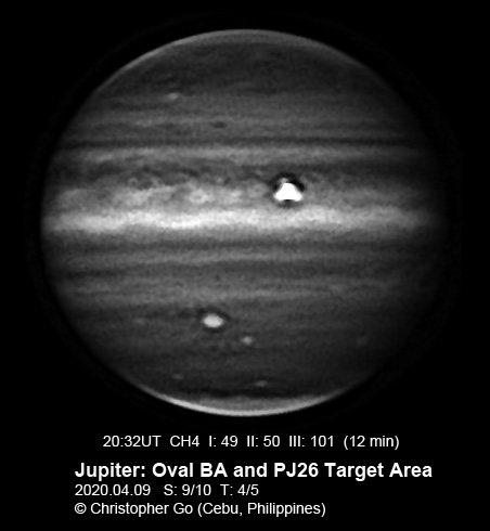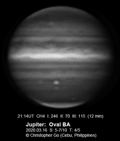 2020 TS Nuri (Butchoy) ruined the weather here. Although it never got close to us, it brought rain for the last few days. I was happy that there was some clearing today. Condition was not ideal as I had to image through clouds and seeing was average. The images show the GRS and Oval BA. The GRS shows flaking at the f side. This flake is visible in the methane band image. It also looks like the chimney above the GRS is now open! In methane band, one can see a bright spot entering the chimney! The outbreak on the wake of the GRS is still active. The area of Clyde's spot is at the edge and there seems to be darkening in that feature. Oval BA is still very pale. There is an interesting feature on the mid-SEB above Oval BA. Is that a cyclone? This seems to be disrupting that area on the SEBs. The South Polar Red spot can be seen below Oval BA. The NEB continues to look strange. The NEBn has faded.