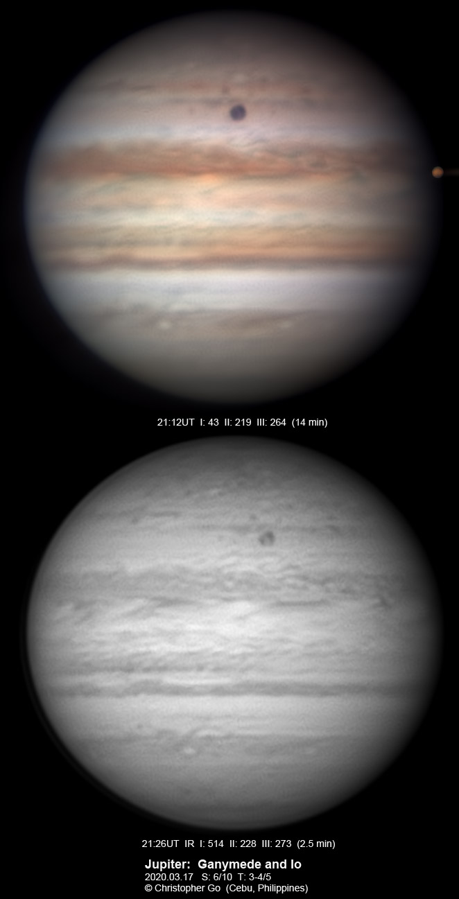 2020 Condition was a bit challenging today. Seeing was not great and I had to deal with imaging between clouds. Two moon of Jupiter can be seen on these images. Ganymede is in transit while Io just exited on the right. The SEBn is very dark while the rest of the SEB is pale. Note the ochre haze on the EZ. The NEB is dark. Note the dark streaks on the NEB below Ganymede.