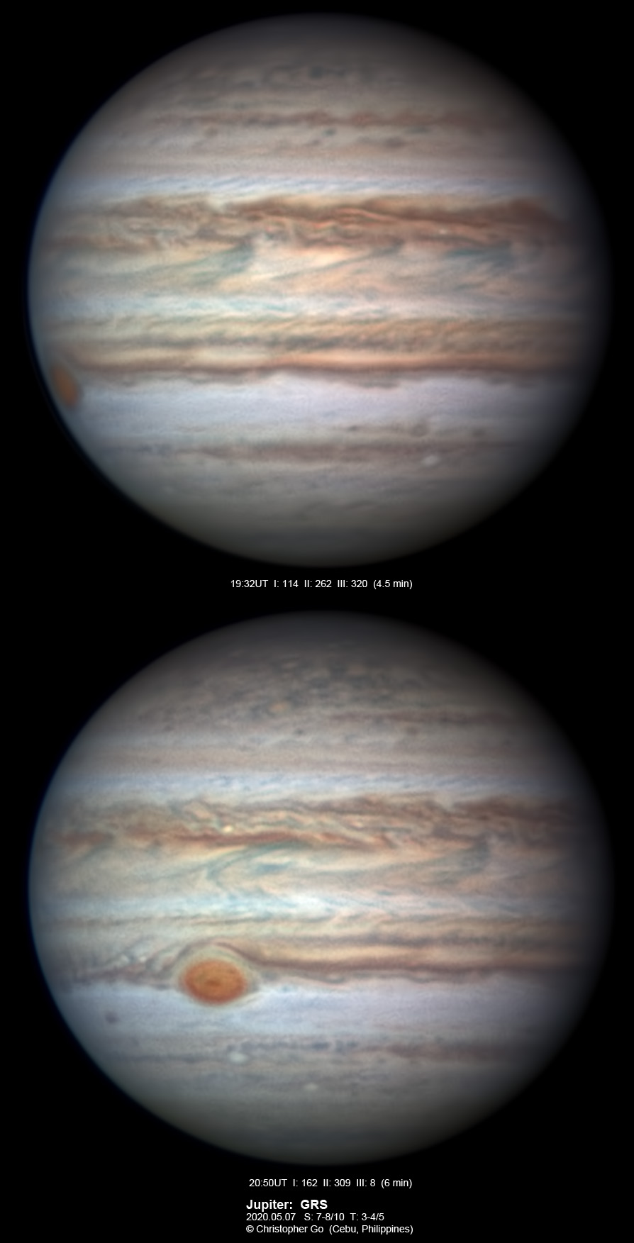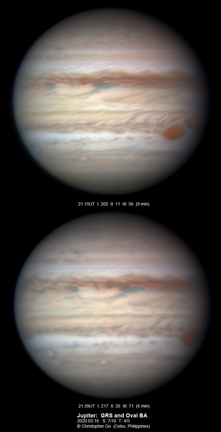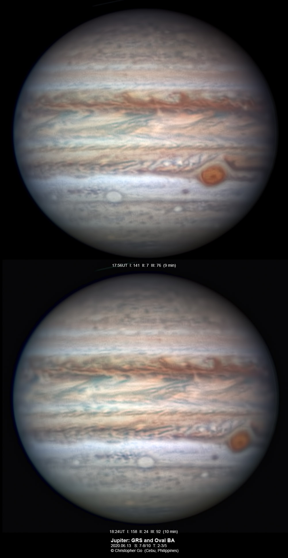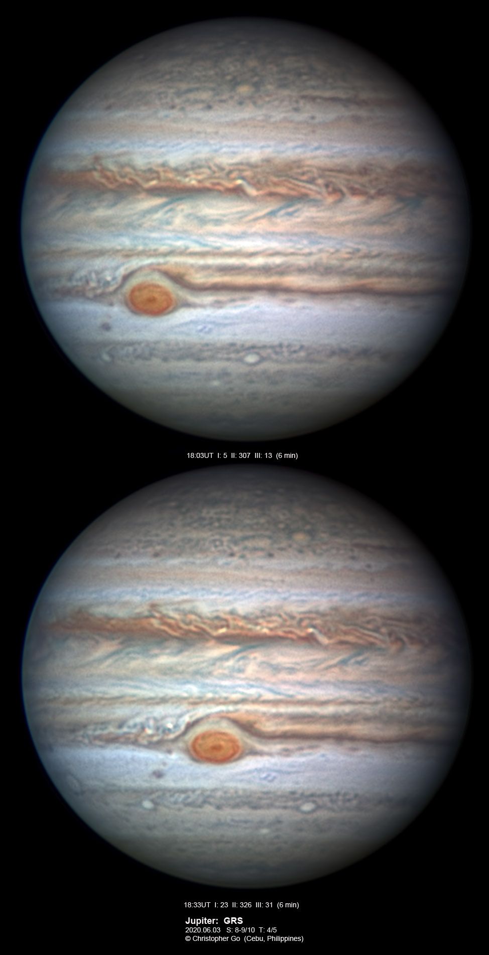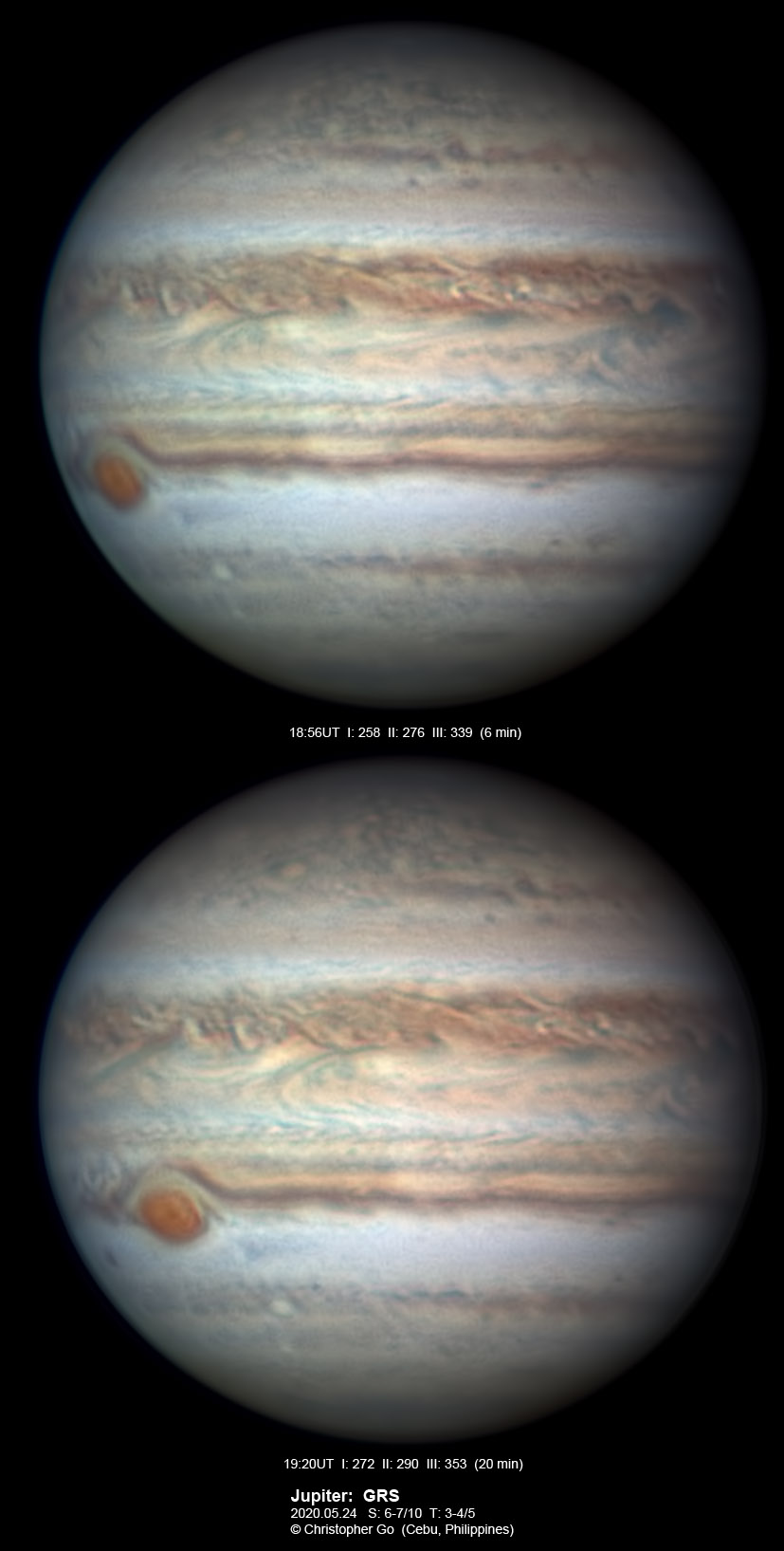2020 I woke up early today with a game plan. Take a quick imaging run with Jupiter. Then take a complete run with Saturn. Then back to Jupiter to capture the GRS. Unfortunately things did not go as planned. Seeing was perfect. But in the middle of my Saturn capture, clouds rolled in. I had to rush to image Jupiter in between clouds but was only able to capture 2 sets under low transparency. Fortunately, I was able to salvage the image despite the less that ideal conditions. During the first run, the image shows a pale SEB with the GRS rising on the left. Note the bright white feature on the mid SEB at the CM of the first image. I wonder what that feature is? The NEB is dark and narrow. Note the very dark festoon at the CM! On the second image, some flaking can be seen on the f side of the GRS. The small white oval above the GRS seem to be stuck at the "chimney".