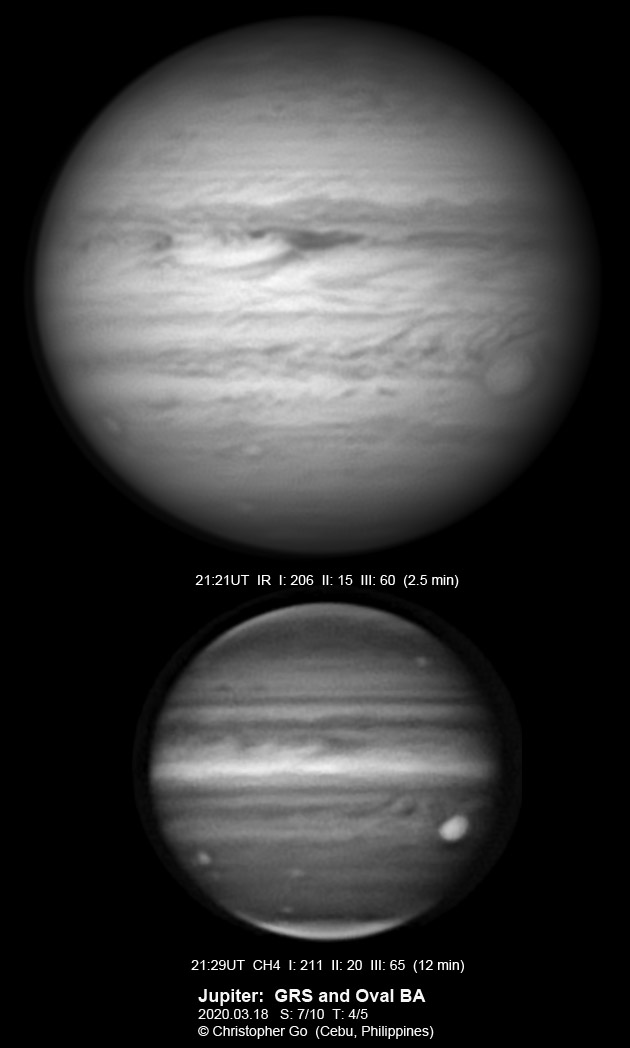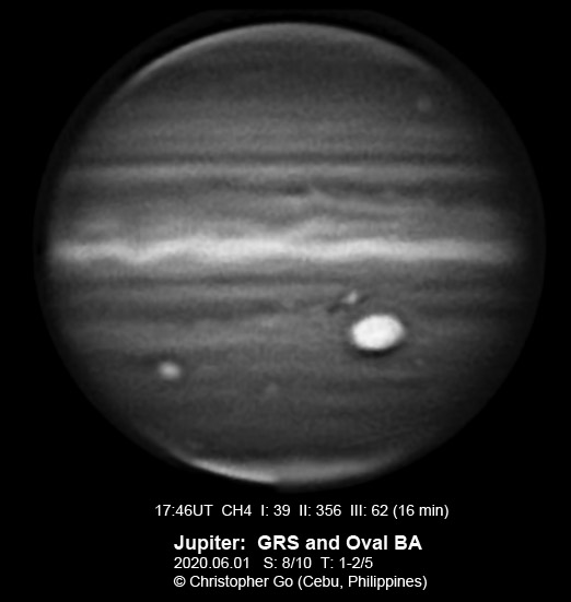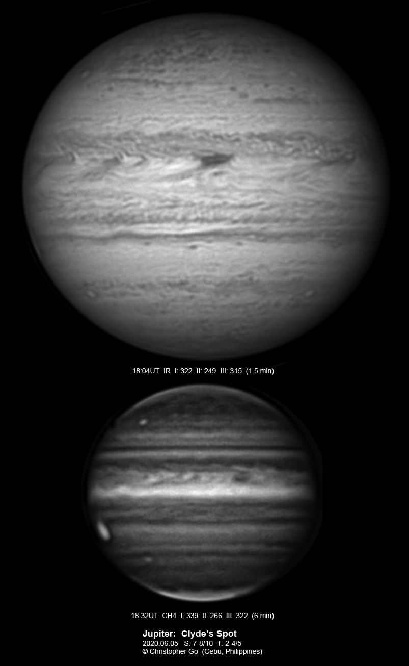 2020 Condition was a bit challenging today. Transparency was poor due to clouds and seeing was variable. The GRS is well resolved in these images. There seems to be a flake on the f side of the GRS. The Chimney above the GRS is now open! This feature is bright in methane band. The outbreak on the wake of the GRS is very bright both in visible and methane band. Note the SE of the GRS on the STrZ is very bright. Note the small dark spots that are about to enter the GRS halo on the p side of the GRS. Clyde's spot can still be resolved especially on the second RGB image although it is not bright in methane band. There is a dark spot that is right next to it. Oval BA can be seen rising on the left. It is getting closer to the GRS and should have a conjunction with the GRS in the coming months. The NEBn shows some fading. The NNTZ LRS is prominent.