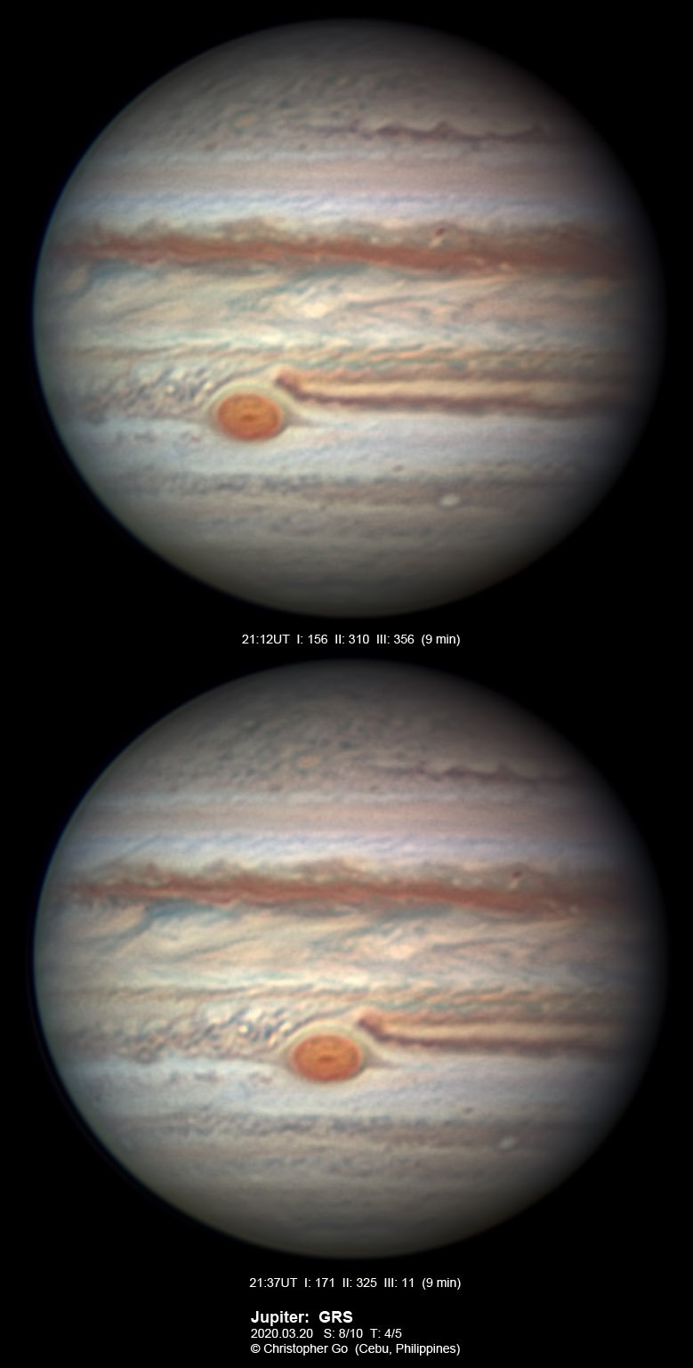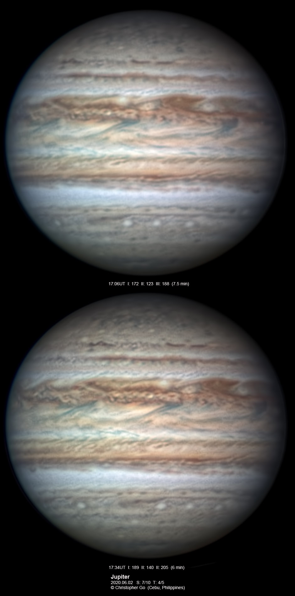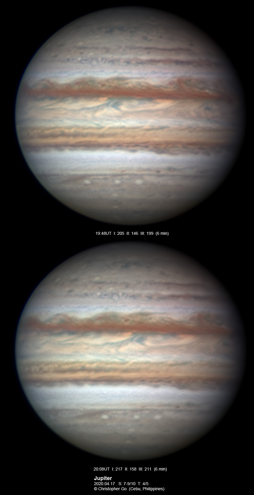 2020 Condition was good this morning. The GRS can be seen rising on these images. The SEBn is very turbulent due to interaction of the GRS with the SEB. There is a reddish haze on the EZ. The NEB is dark. Note the bluish streaks on the STB. Is this the STB Ghost or Spectre?