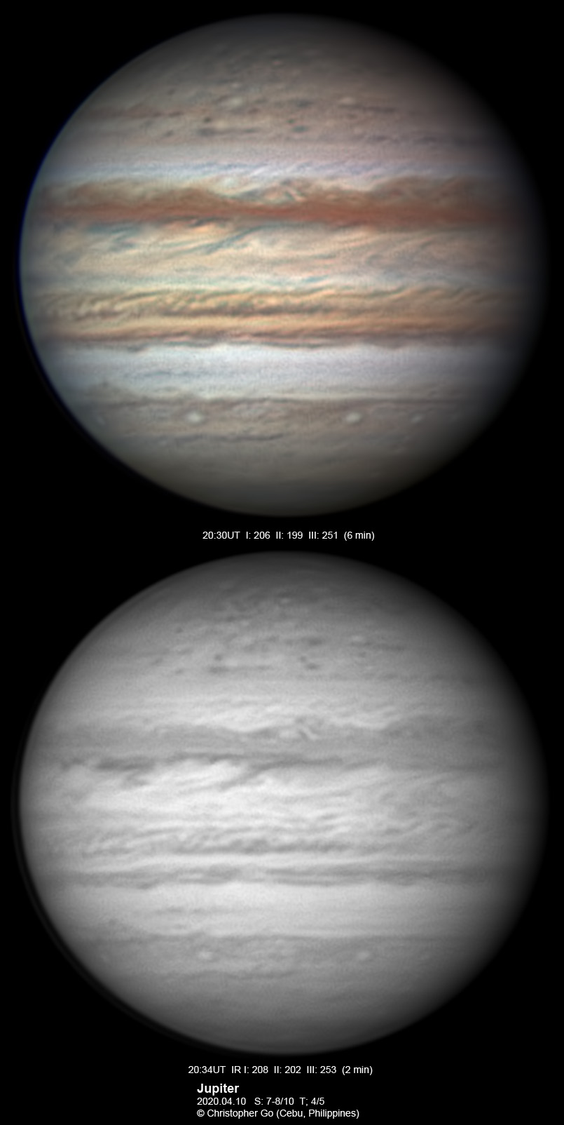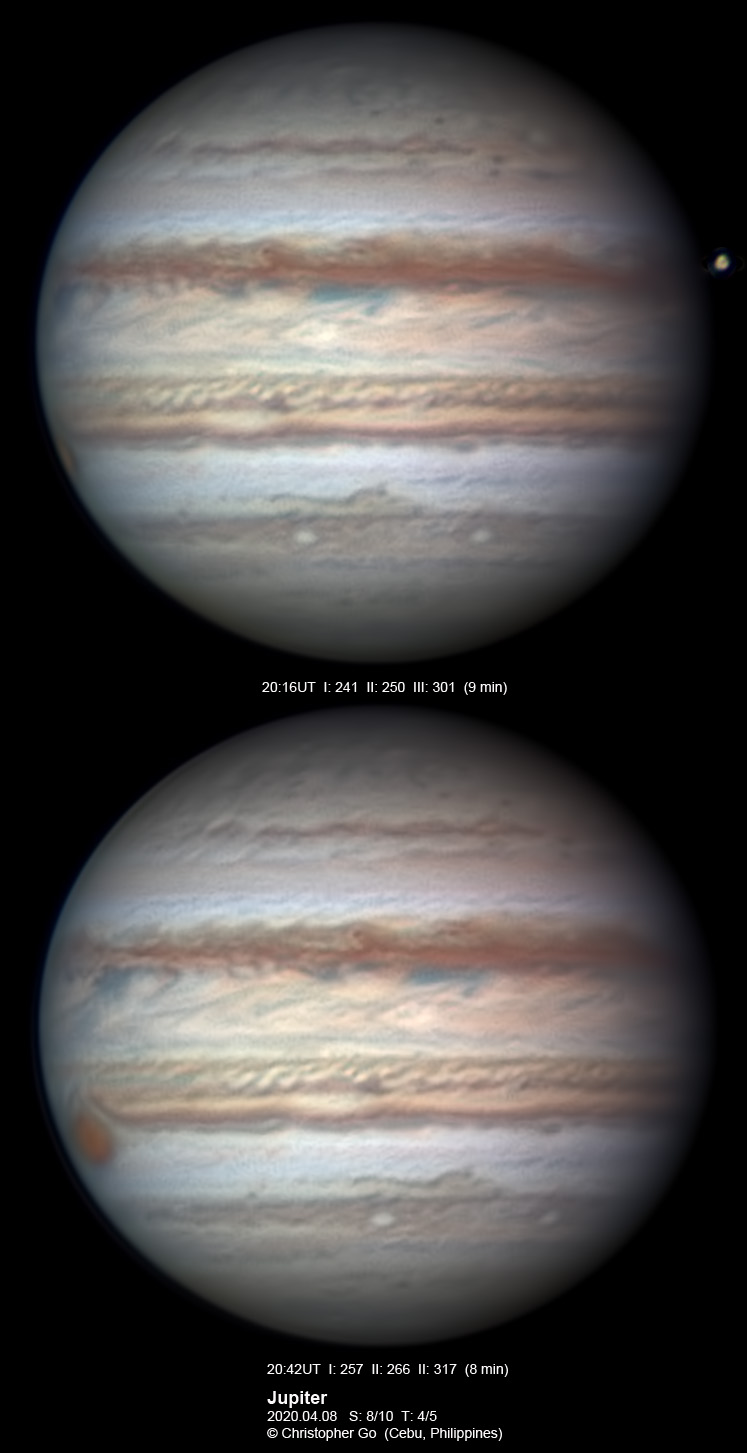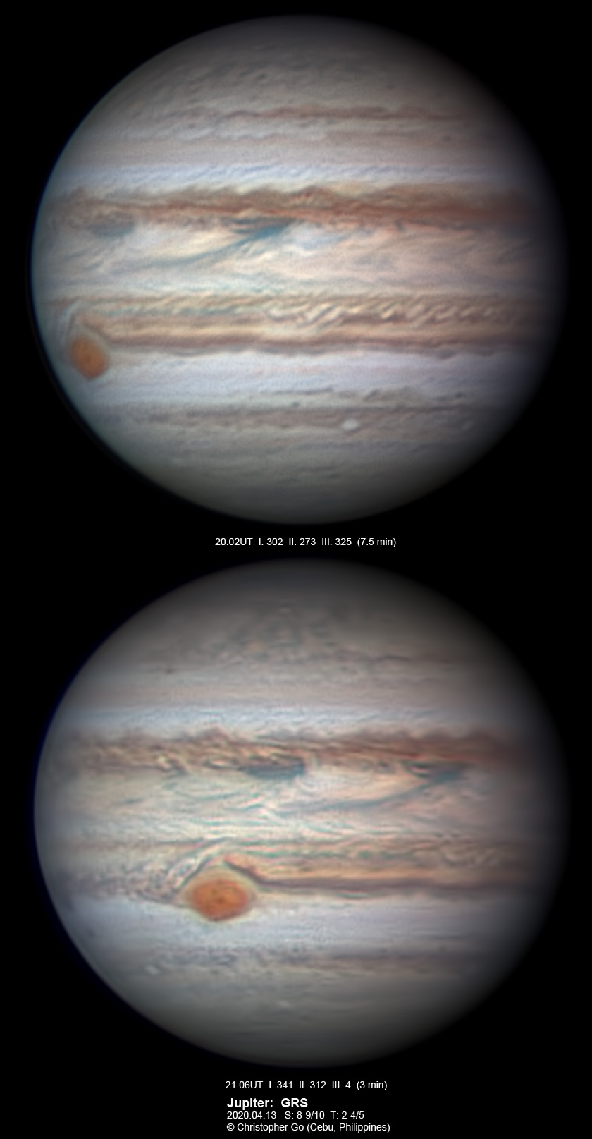 2020 Condition was good this morning. The GRS can be seen rising on these images. The SEBn is very turbulent due to interaction of the GRS with the SEB. There is a reddish haze on the EZ. The NEB is dark. Note the bluish streaks on the STB. Is this the STB Ghost or Spectre?