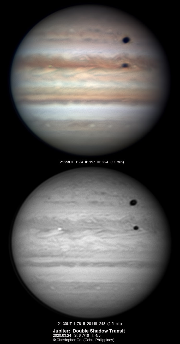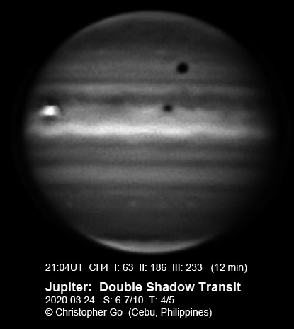 2020 Condition was very unstable today due to N winds. There is a double shadow transit today. The larger shadow is that of Ganymede while the shadow on the NEBs is that of Io. Io can be seen on the left. The SEB is pale in this region while the NEB looks turbulent. Note the strange feature on the NEBn at the CM.