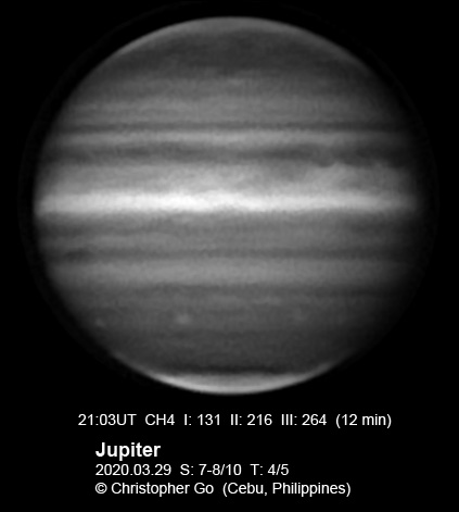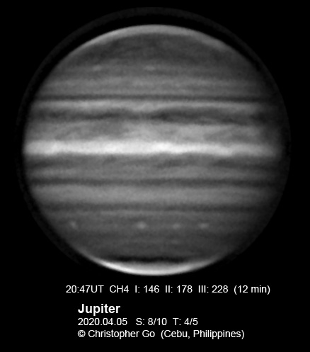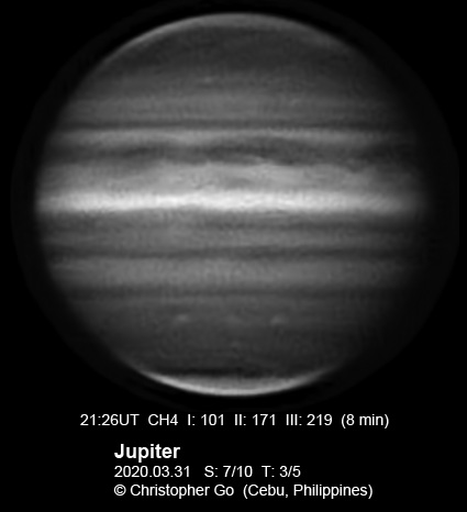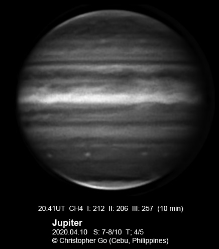 2020 Seeing was average today but transparency was poor due to haze. This SEB is pale in this region except for some dark red streaks on the mid-SEB. The NEB looks turbulent especially at the CM. The EZs is very bright in methane band.