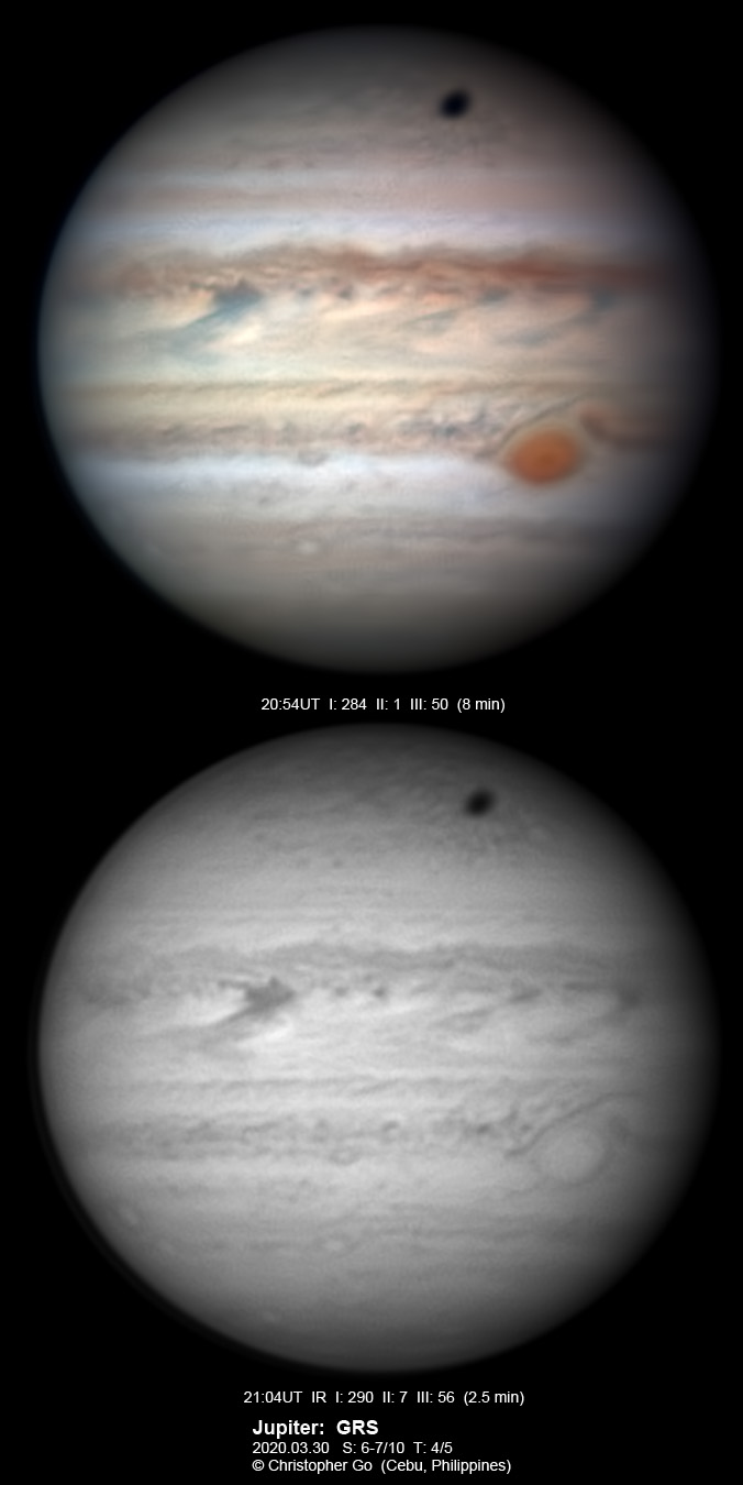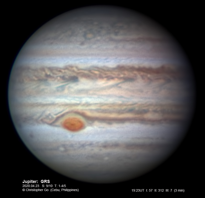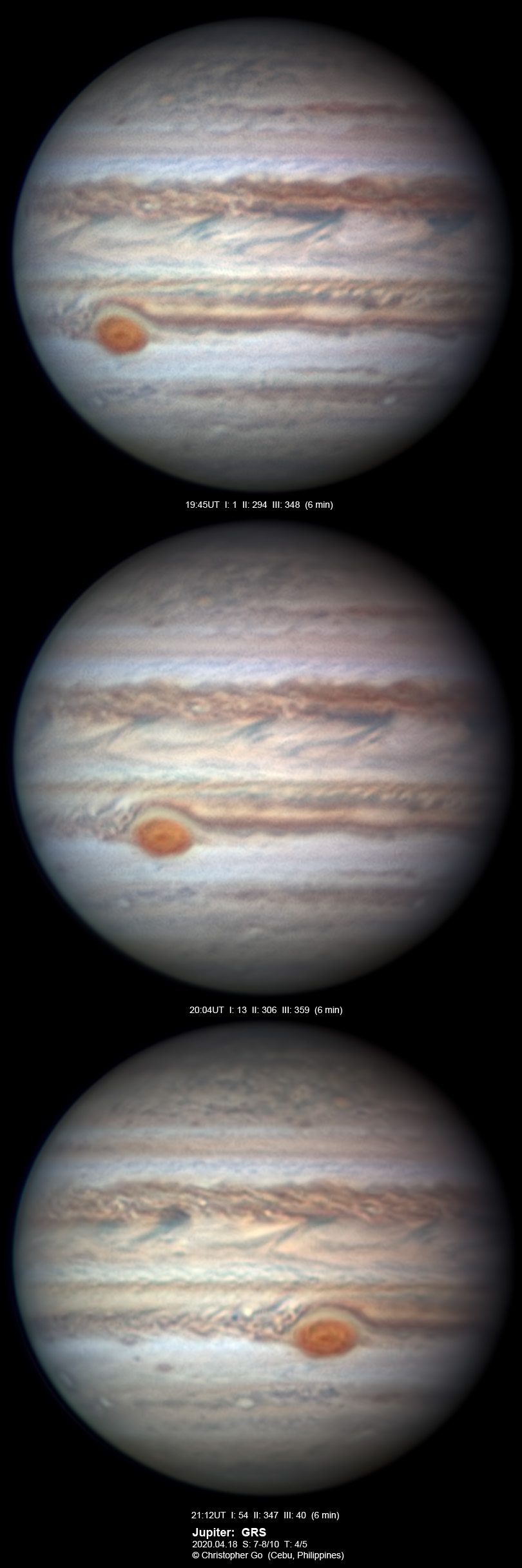 2020 I had a Facebook Live webinar with Woodland Hills this morning. These are the images we took this morning. Note that the seeing was not great. Tomorrow I will demo how these images were processed. This region shows the GRS and Oval BA. This is also the region Juno will image during PJ26 on April 10. The wake of the GRS is very turbulent. Note the oval on the STrZ. The mid-SEB is very pale! The NEB is dark. Note the interesting feature on the CM of the NEB. There is this reddish feature on top of a festoon! The South Polar Red Spot can be seen.