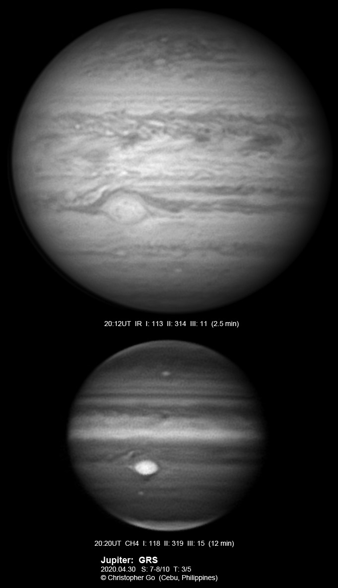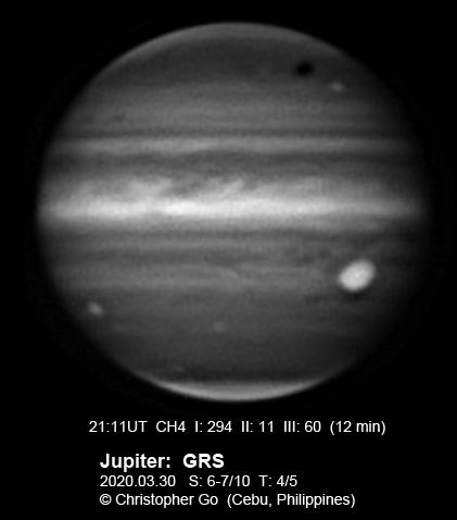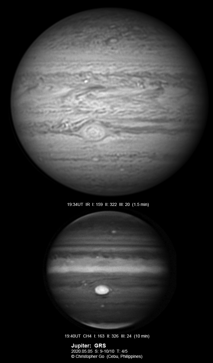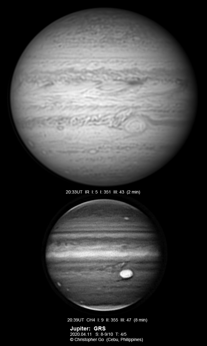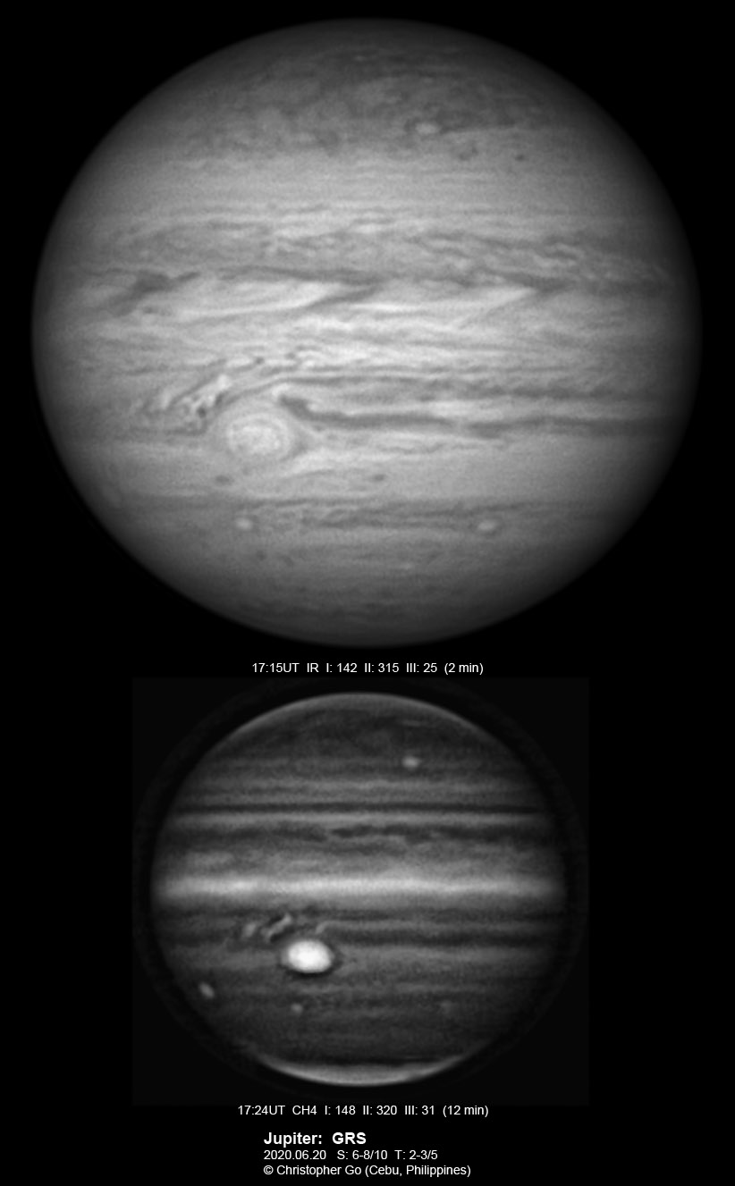 2020 I overslept today and did not wake up till 5am. I rushed to image Jupiter and fortunately the seeing was excellent. For the methane band though, the GRS was over exposed because I captured it a few minutes before sunrise. The GRS is well resolved in these images. Note the extension on the f side of the GRS. Is flaking still happening? There are bright outbreaks on the wake of the GRS. Note the bluish streak on the NTB on the lower left of the GRS. The NEB is dark and narrow in this region with a lot of rifting.