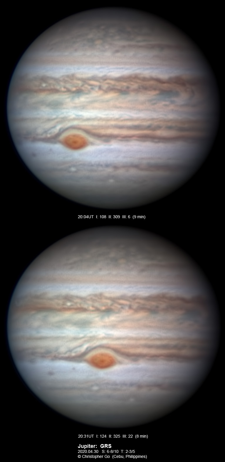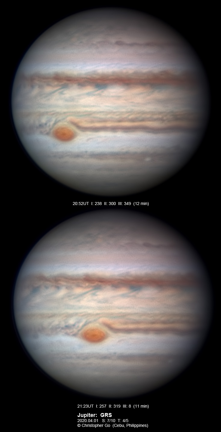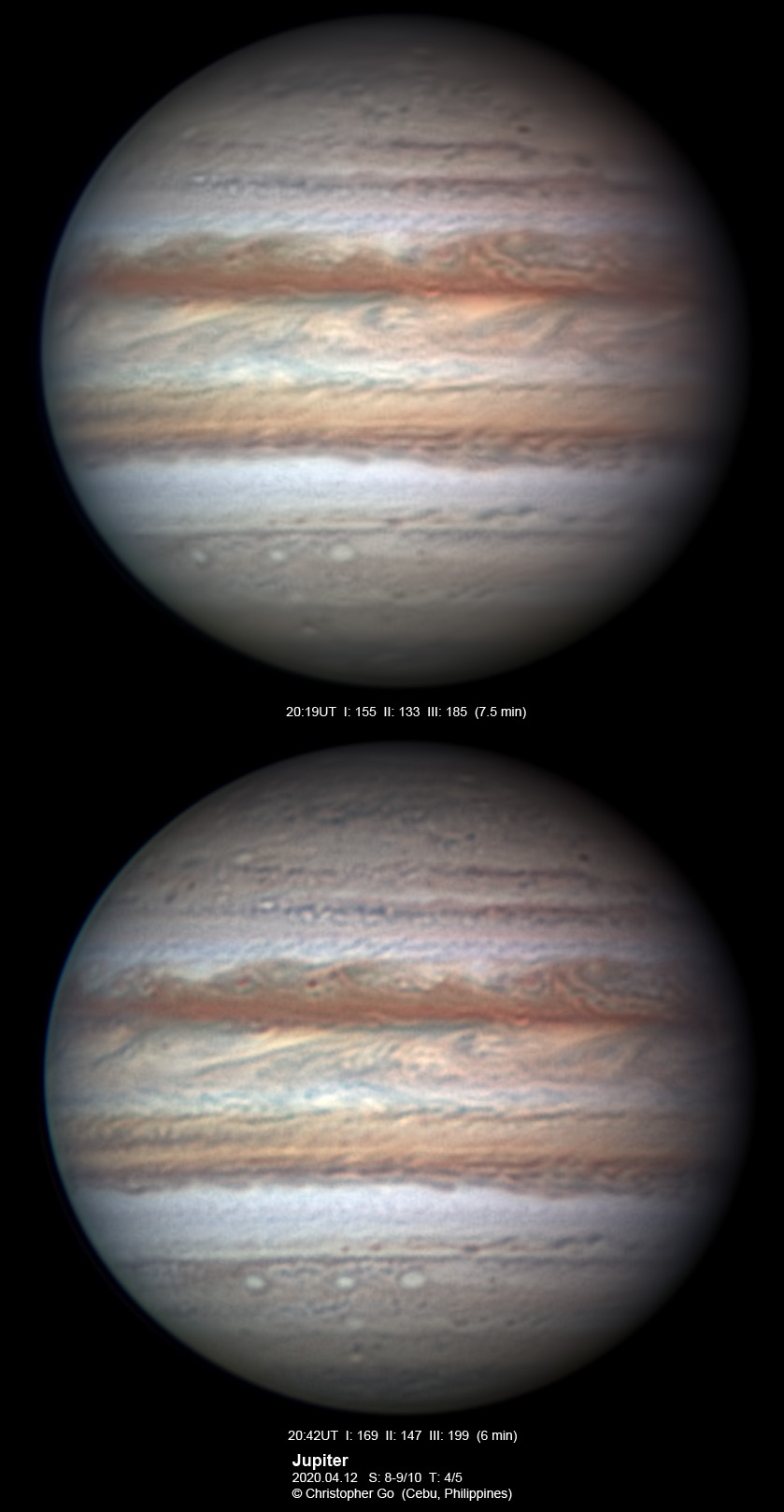 2020 Condition was excellent today. I was hoping to image Jupiter after my run with Saturn to catch the GRS at a better position. Unfortunately, clouds rolled in before I could complete my Saturn run. The GRS is rising on these images. Note the white area on the SEB preceding the GRS. There seems to be some white streaks inside it. The SEB is still very pale. The NEB has a lot of rift activity.
