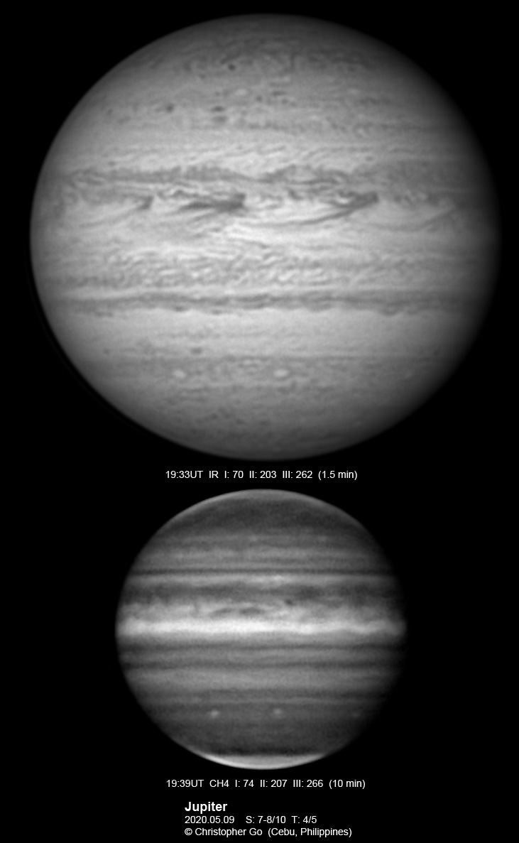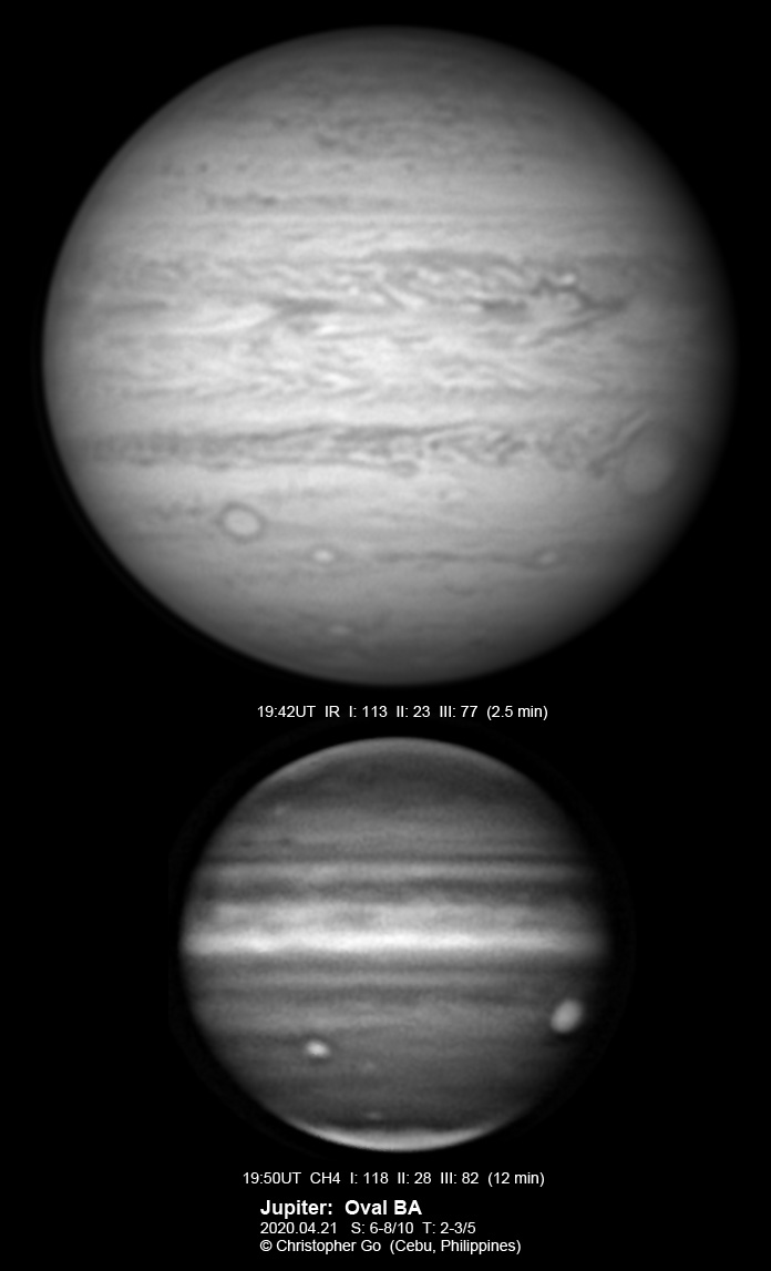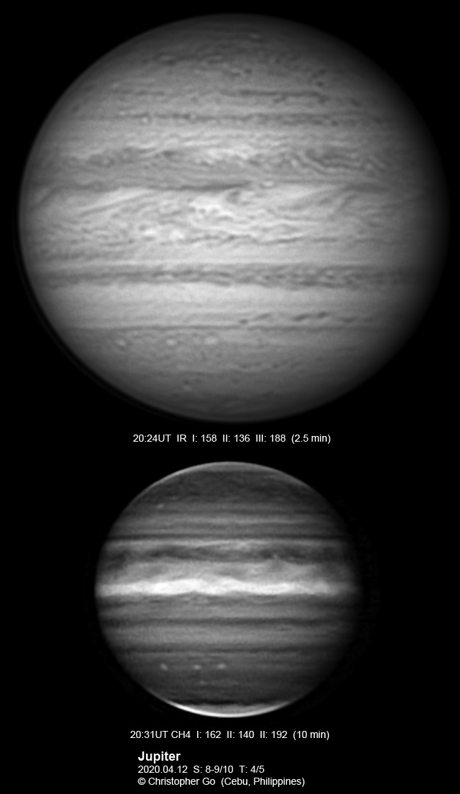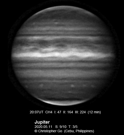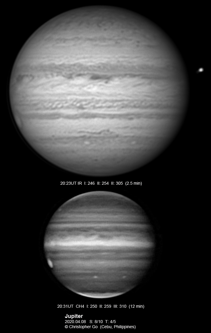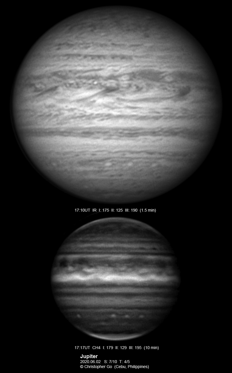 2020 Seeing was good when I started imaging. I started taking IR and CH4 images thinking that seeing would even be better when Jupiter gets higher. Unfortunately, seeing deteriorated as the sun was about to rise. Oval BA can be seen in these images. It is still white. The SEBn is very active while the rest of the SEB looks pale. The mid=EZ is very bright in methane band this year. The NEB is dark and narrow.