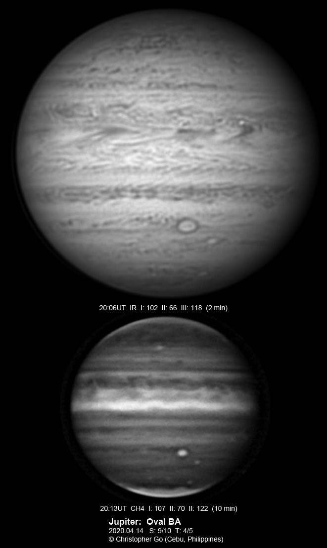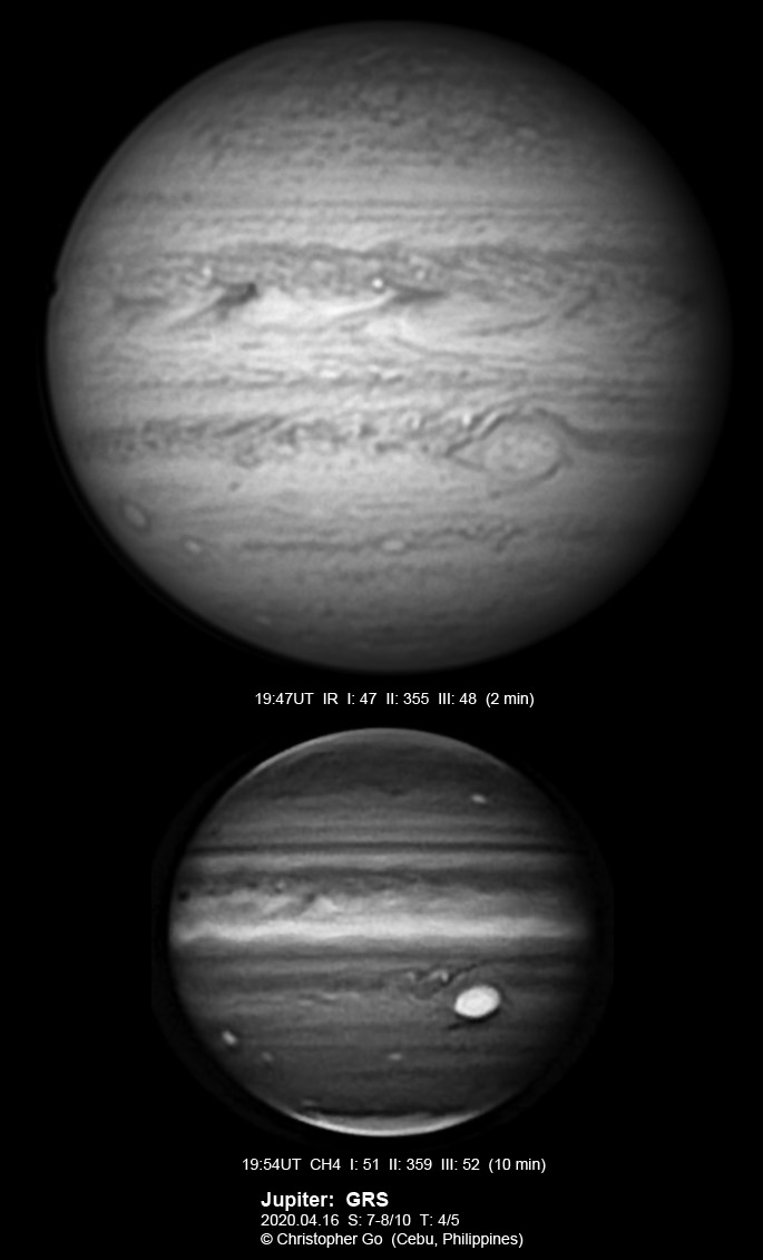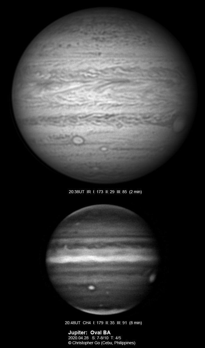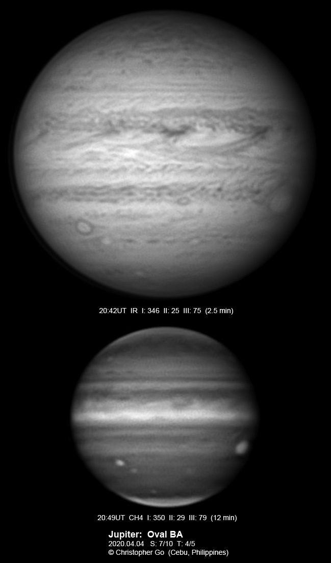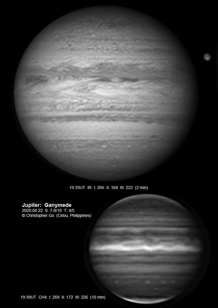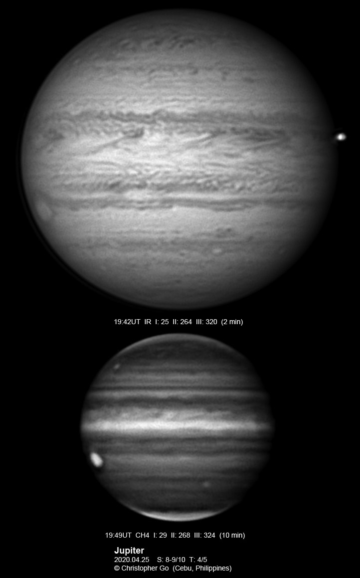2020 Seeing was good when I started imaging. I started taking IR and CH4 images thinking that seeing would even be better when Jupiter gets higher. Unfortunately, seeing deteriorated as the sun was about to rise. Oval BA can be seen in these images. It is still white. The SEBn is very active while the rest of the SEB looks pale. The mid=EZ is very bright in methane band this year. The NEB is dark and narrow.