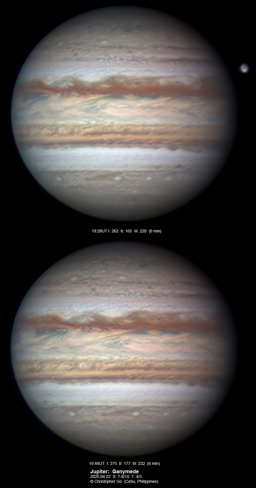 2020 Seeing was variable today. But I was a bit nervous because there were thunderclouds in the north and in the south. The area where the planets were remain clear until half an hour before sunrise. The NEB looks very strange. The southern part is dark red but the northern part looks very disturbed. Is the large white spot on the NEBn before the CM White Spot Z? Is seems that the festoons on the EZ are invading the NEB! The EZ is very bright in methane band and it has a wave pattern. The SEB is very pale. Ganymede can be seen just off Jupiter. The South Polar cap can be seen.