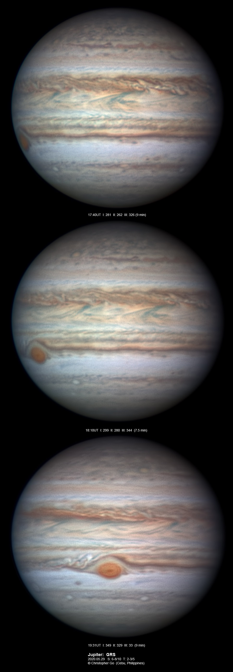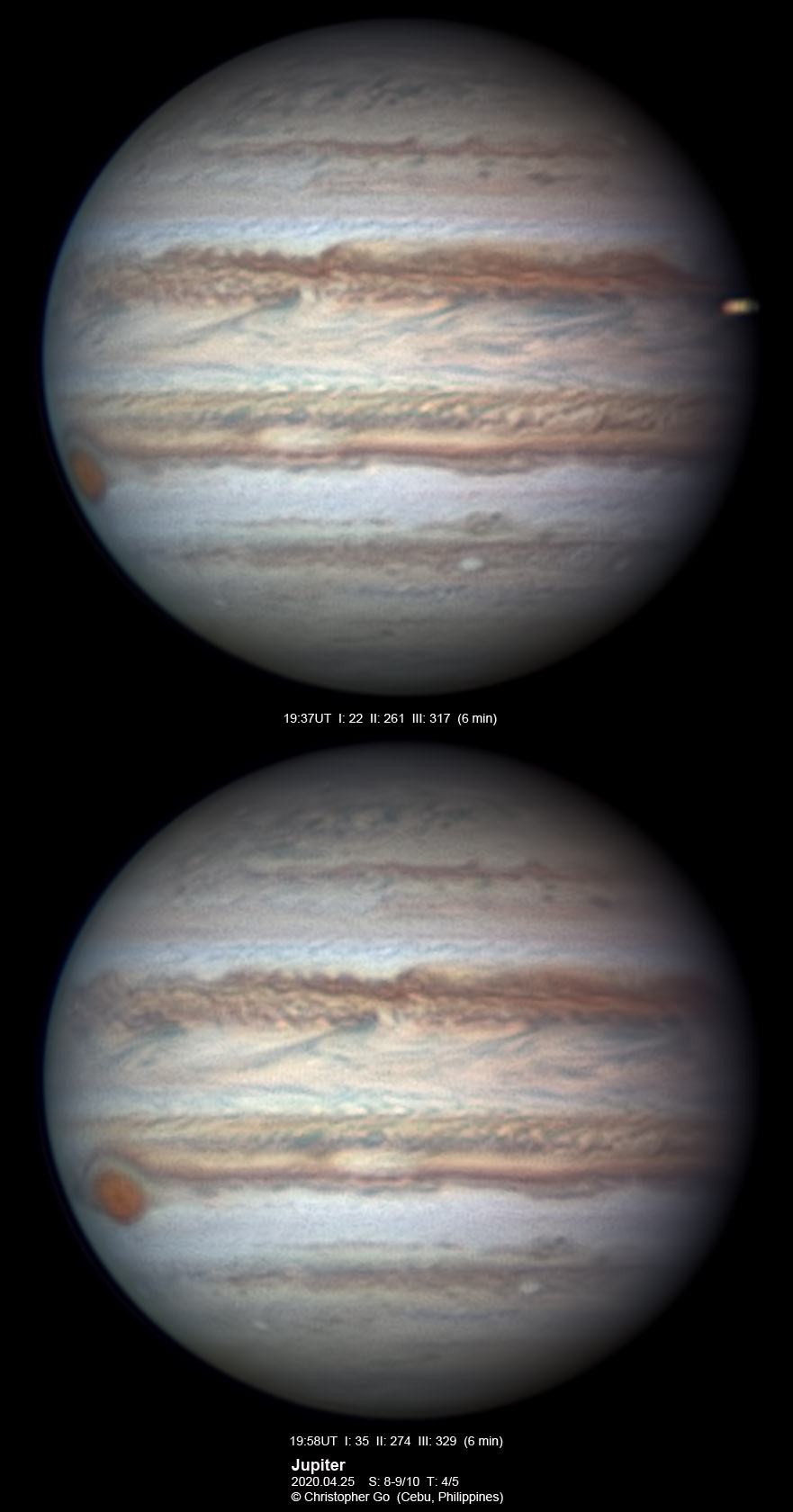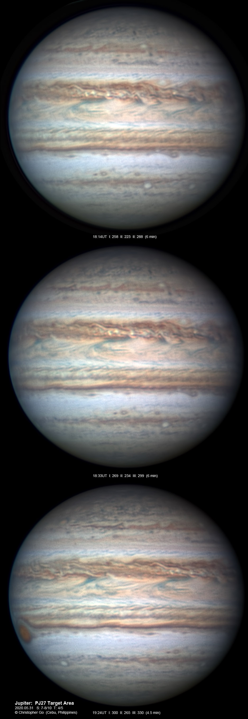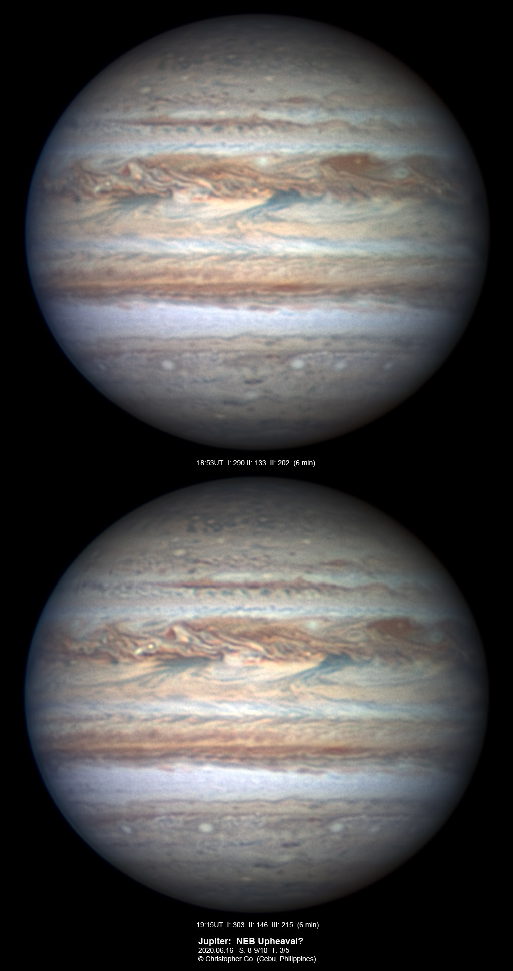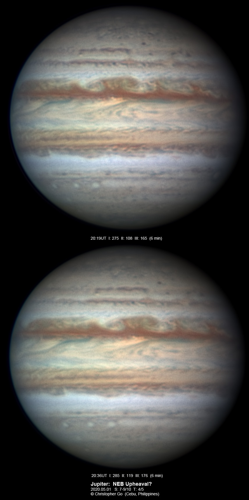 2020 Condition was variable today. I was only able to capture a set of images before clouds rolled in. The STB Sceptre can be seen rising on the left. The SEBn is turbulent but mostly the SEB is very pale. The NEB is very quiet in this region with a strong red color. The WSZ can be seen close to the CM. The feature preceding the WSZ on the NEB looks strange. Is this a cyclone?