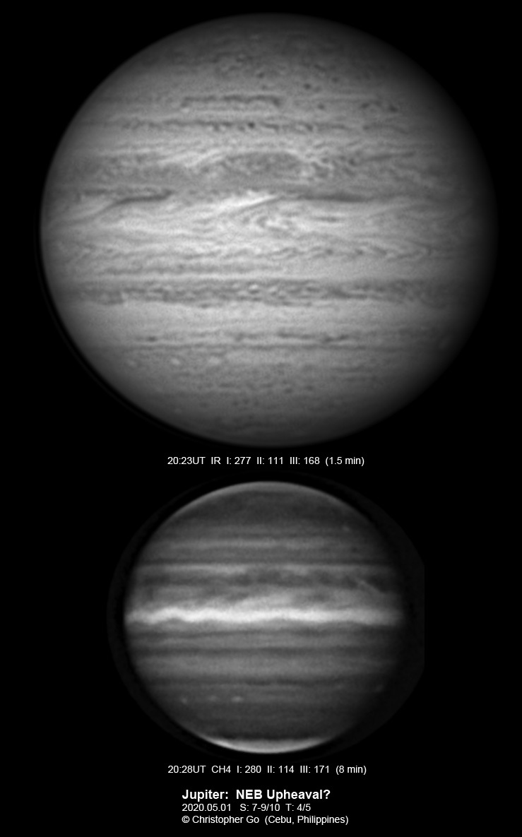 2020 Weather prediction today was suppose to be cloudy. When I woke up at 2:30am, the sky was overcast. When I woke up at around 4am, I wasn't expecting much but the sky was clear! Seeing was mostly good but with periods of instability. Here are images of Jupiter showing the chaos in the NEBn. Is the NEB undergoing one of it's periodic upheavals? The NEBs is very dark red, but the most of the northern part of the NEB is losing its clor and it looks like wind shear is disrupting this region and it is loosing its usual red color. THe NEB is very pale. The STrZ is notably bluish. The EZ is very bright in methane band and note the wave pattern on the methane band image of the EZ.