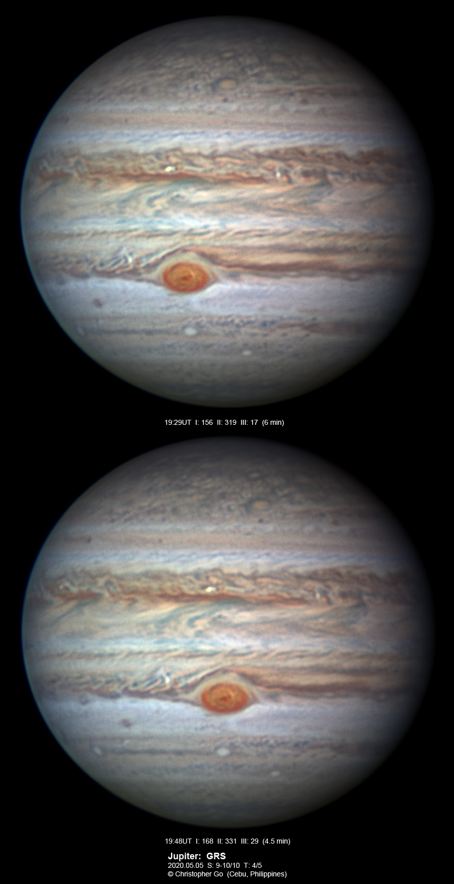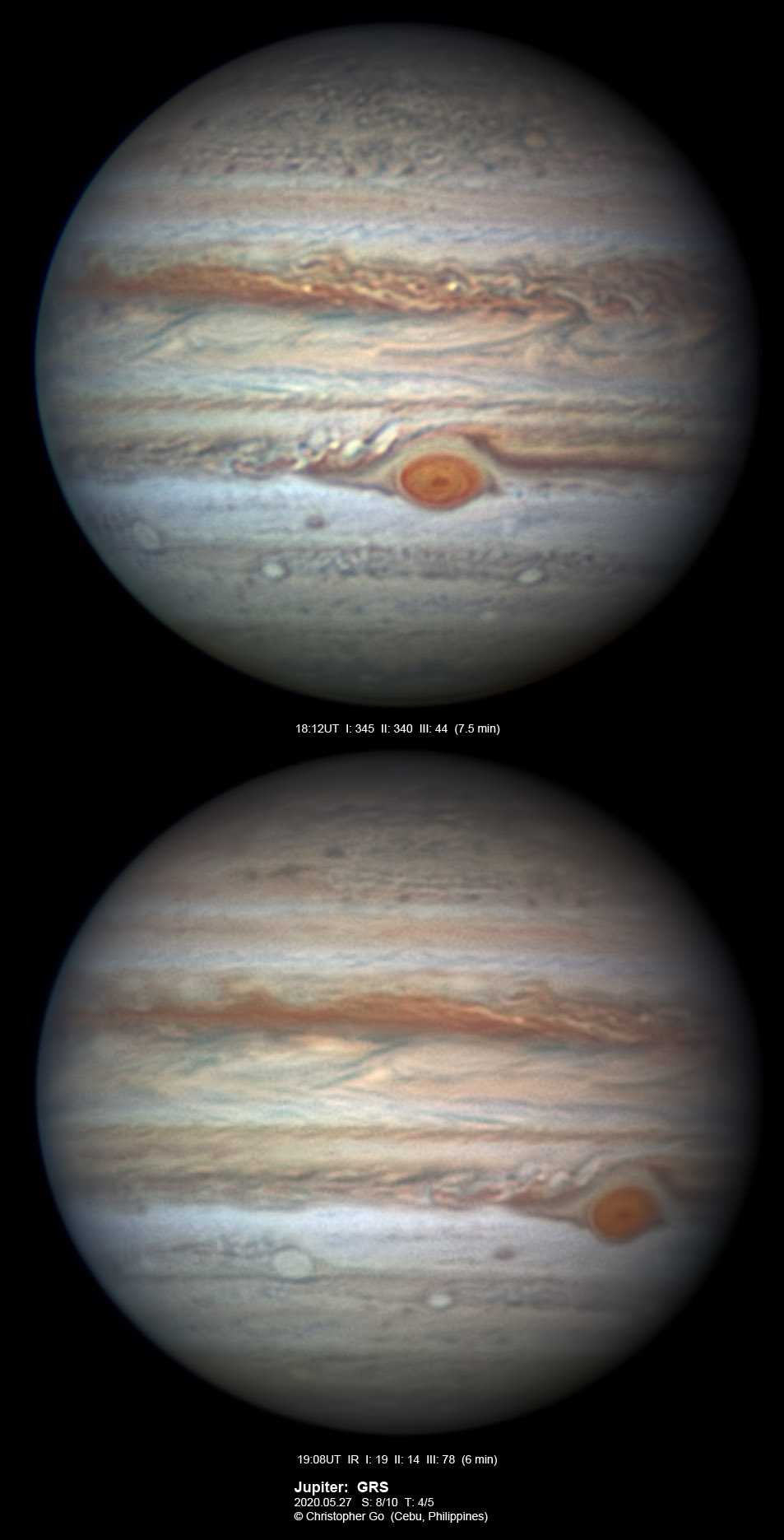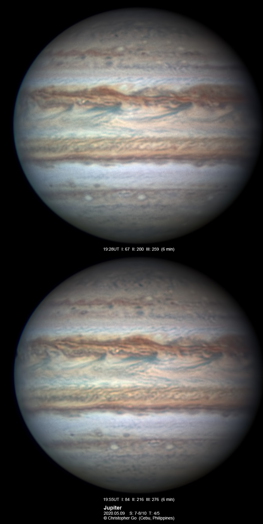 2020 I did not expect to image today because TS Vongfong (Ambo) is just to the east of us. Surprisingly, the sky was mostly clear except for the eastern horizon where thunderclouds were looming. Seeing was variable today. The GRS is prominent on these images. Note the extension on the p side which looks like a flake. There is also an oval that is about to enter the GRS halo. The wake of the GRS has a very bright outbreak. The NEB is very active with complex rifts and some outbreaks. The NNTZ LRS and the other north temperate red spot can be seen.