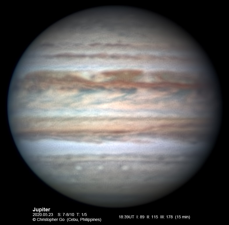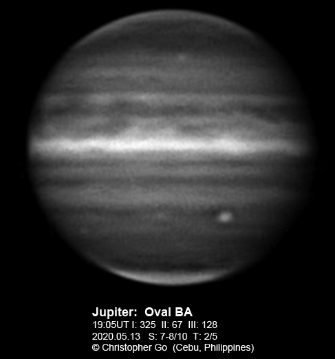2020 The outer bands of Typhoon Vongfong (Ambo) has reached us. I was fortunate to get a short clearing before the sky was overcast. Transparency was very poor due to thin clouds. Seeing was fair. Oval BA is still pale and a hint of the inner dark ring can be seen. The SEB has lost its color and is no pale red. The NEB is very chaotic. I have never seen it like this before. Is the NEB fading? Is it undergoing an upheaval?