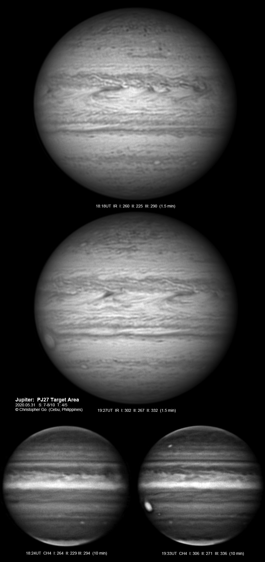 2020 The sky was clear today but seeing was variable due to N winds. These images show the Juno's PJ27 target area. The NEB is very active in this region with a lot of outbreaks and complex rifting. The SEB shows the turbulence of the GRS. On my second run, the methane band shows the bright outburst spot on the p side of the GRS which Clyde Foster discovered yesterday.