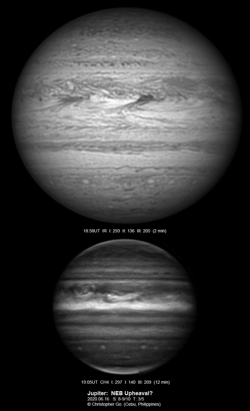2020 It had been cloudy here for the last few days. It cleared up this morning. Seeing was excellent but transparency was poor due to thin clouds. The NEB is very chaotic in this region. There are a lot of complex rifts. The methane band image shows a brightening on the NEBs close to the CM and two bright outbreaks. On the f side of this feature is a strange looking activity on the NEB. THe SEB is quiet in this region. It also looks faded here.