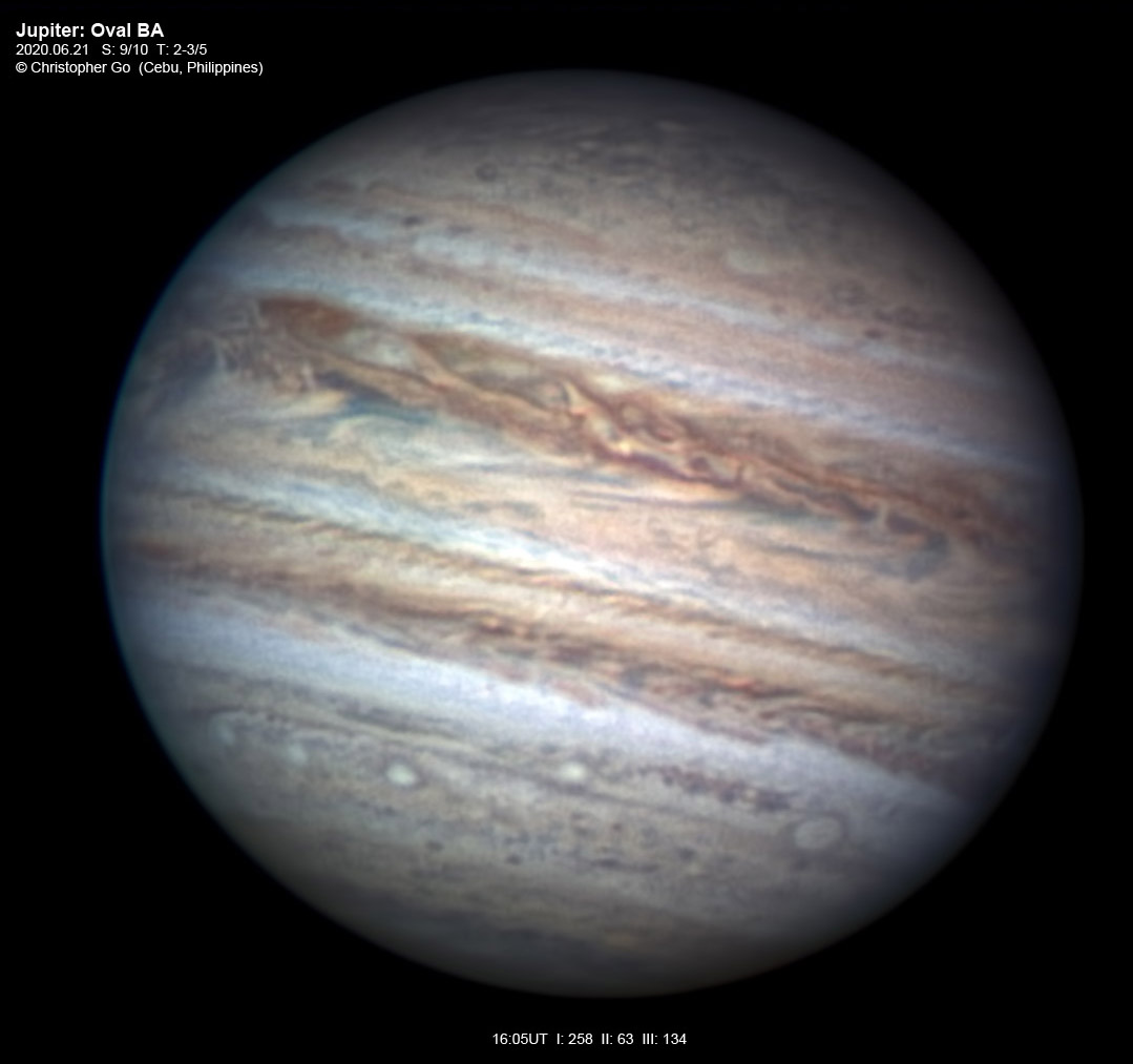2020 I overslept today and did not wake up till 4:20am! I was not able to catch the GRS today. Seeing was only average today. The GRS is setting on the right. Oval BA is prominent in these images. A dark ring can be seen inside Oval BA. The South Polar Red Spot is prominent below Oval BA. The NEBn is very disturbed! While the SEB is very pale!