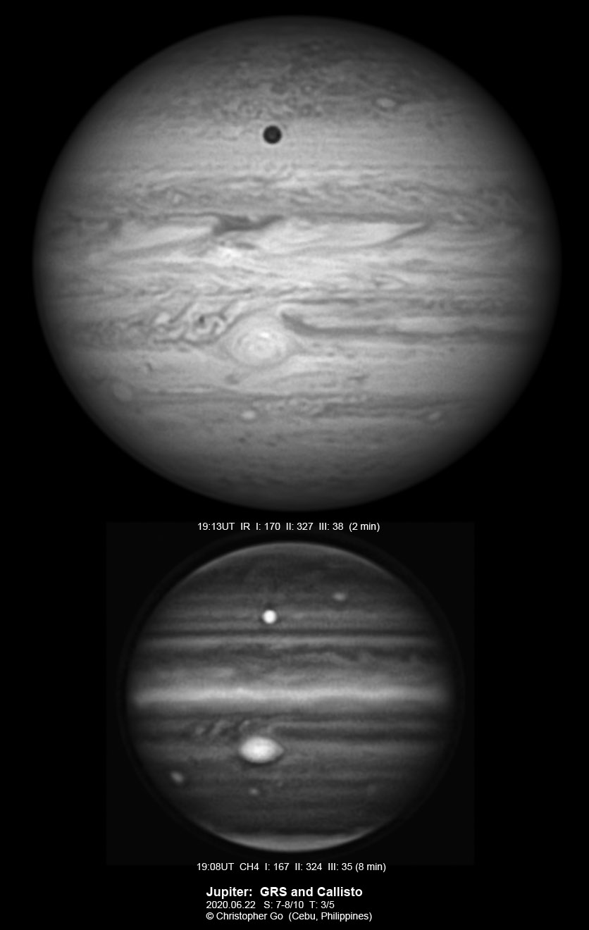 2020 I was planning to image at around midnight but it was raining hard during that time. Went back to sleep. Woke up at close to 2am to find the sky has cleared. Went to image but clouds suddenly appeared. Since the GRS was rising, I waited for close to 35 min for the sky to clear. I was not disappointed. Seeing was average although transparency was poor. This image shows a very rare treat. Callisto is in transit with the GRS. That dark spot is Callisto not a shadow! I have not imaged a Callisto transit in years. The GRS looks very interesting today. Note the bright spot on the north inside the GRS! The flake on the GRS is now on the p side. The wake of the GRS shows a very complex turbulence. Note the very dark feature in the wake. The chimney above the GRS is now open. SE of the GRS is the area of Clyde's spot. Two spots can be seen though these are dark in methane band. The dark spots SW of the GRS looks like two dark cyclones. Oval BA can be seen rising on the left. The dark ring is well resolved. The NEB still looks very strange especially the light NEBn. The NNTZ LRS is prominent.
