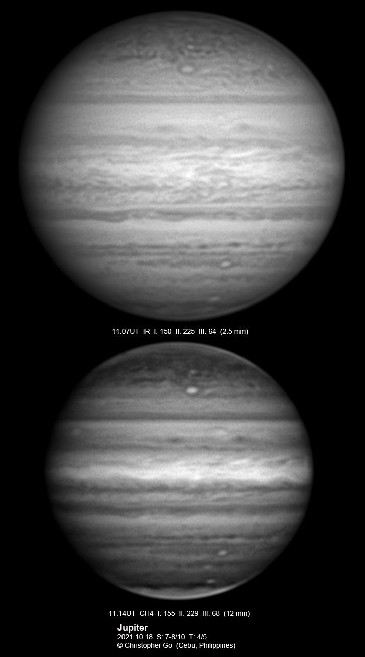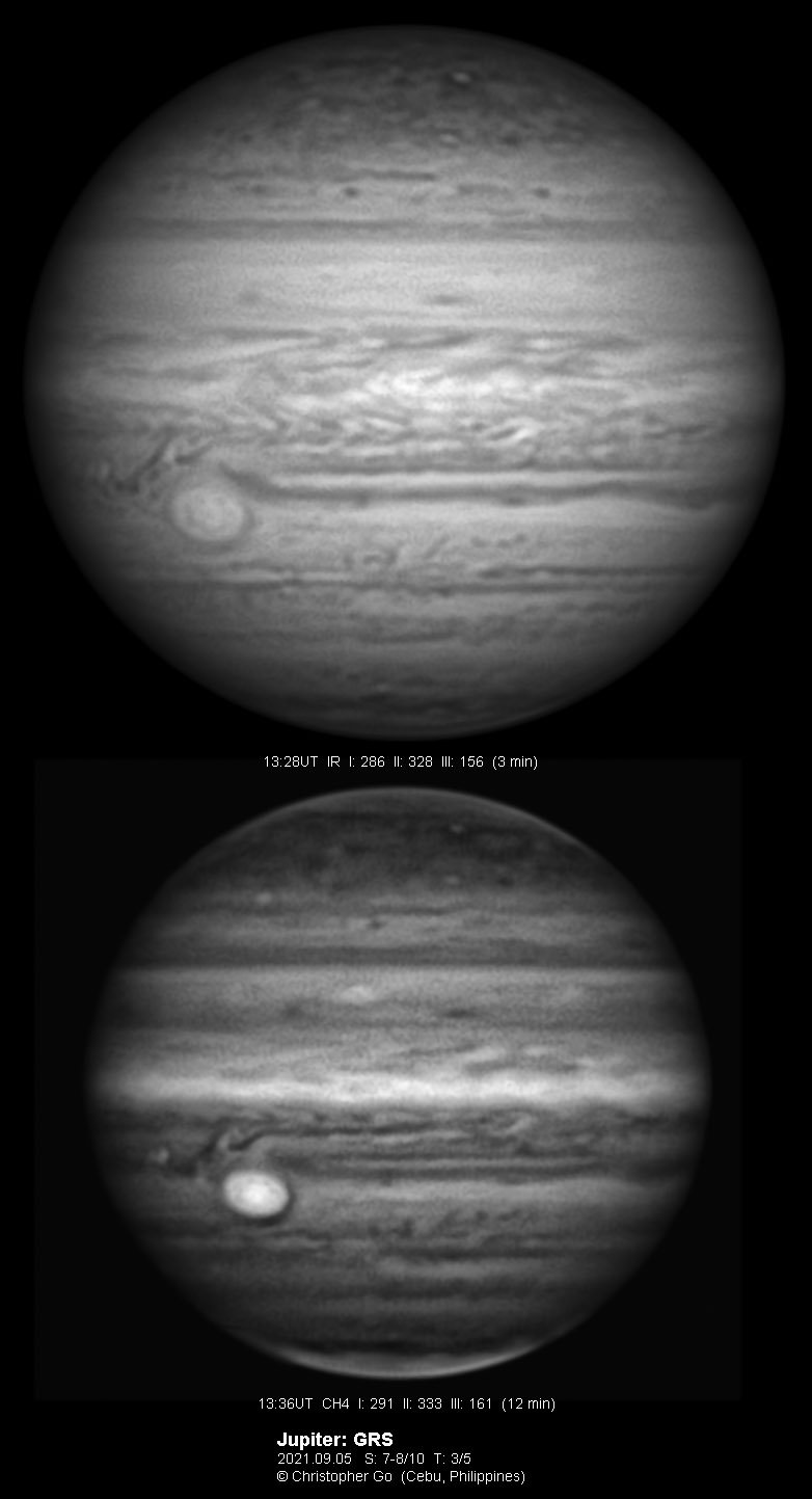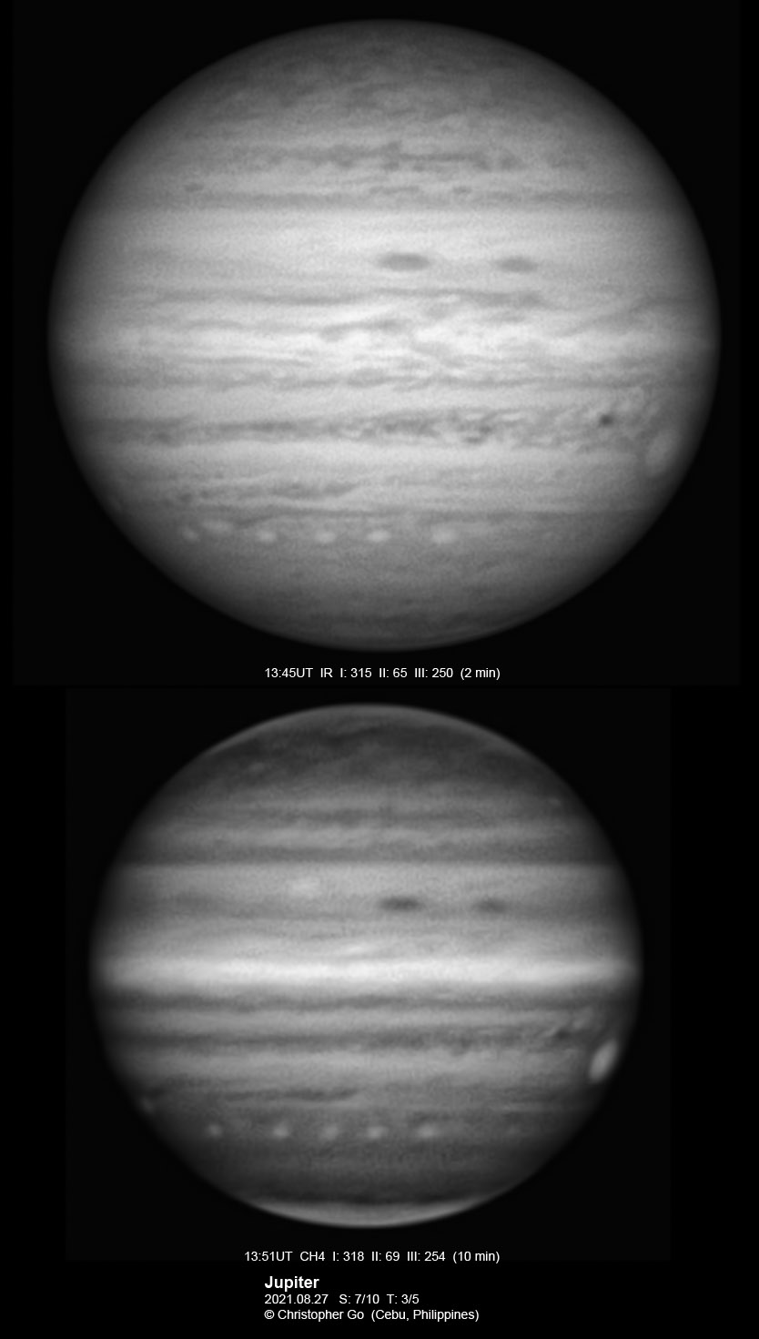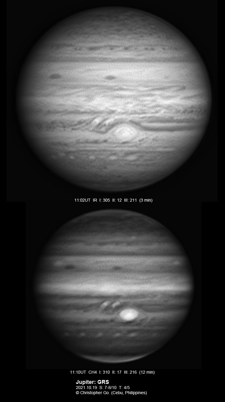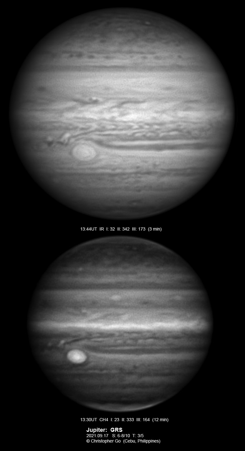 2021 I never expected to image today because there was a huge cloud covering the entire eastern/central Visayas due to a low pressure area. Surprisingly, the sky cleared! I have been praying the Memorare for clear skies tomorrow but it came a day early! Seeing was very good except towards the end of my imaging run. These images show the GRS which is well resolved! Note the two bright outbreaks on the wake of the GRS and a very dark features between these two outbreaks. The remnant of the STB outbreak has become dark in visible light but there are some bright areas at IR especially at the methane band. The STB seem to have darkened like the rest of the southern part of Jupiter. The Mid-EZ still has the reddish band while the NEB is very pale!