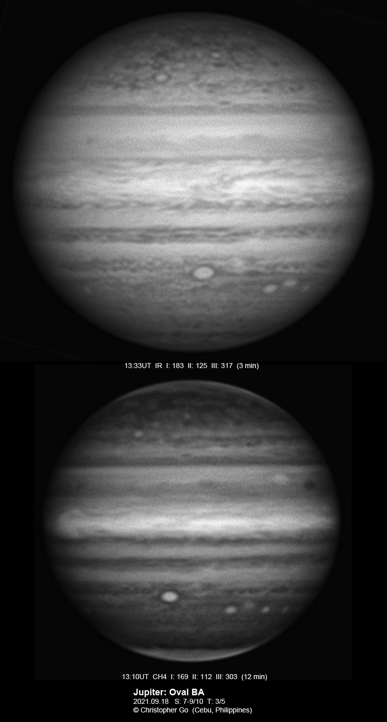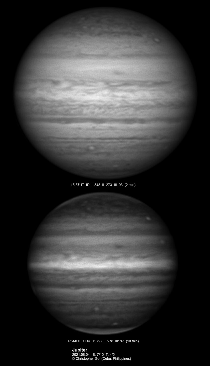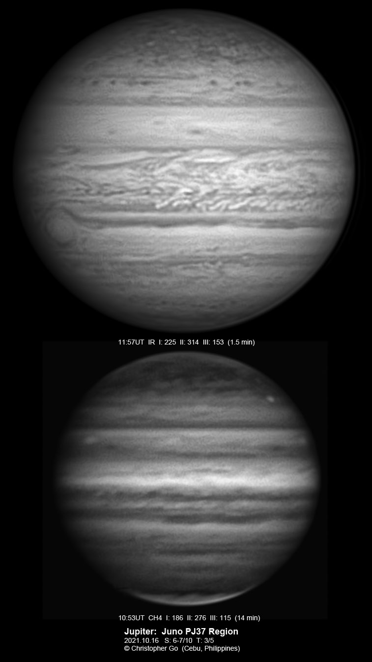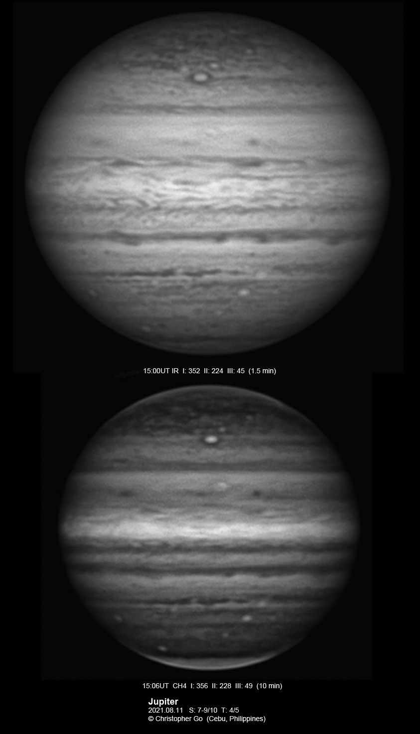 2021 I never expected to image today because there was a huge cloud covering the entire eastern/central Visayas due to a low pressure area. Surprisingly, the sky cleared! I have been praying the Memorare for clear skies tomorrow but it came a day early! Seeing was very good except towards the end of my imaging run. These images show the GRS which is well resolved! Note the two bright outbreaks on the wake of the GRS and a very dark features between these two outbreaks. The remnant of the STB outbreak has become dark in visible light but there are some bright areas at IR especially at the methane band. The STB seem to have darkened like the rest of the southern part of Jupiter. The Mid-EZ still has the reddish band while the NEB is very pale!