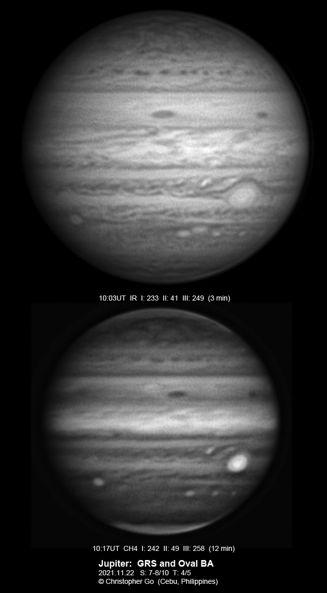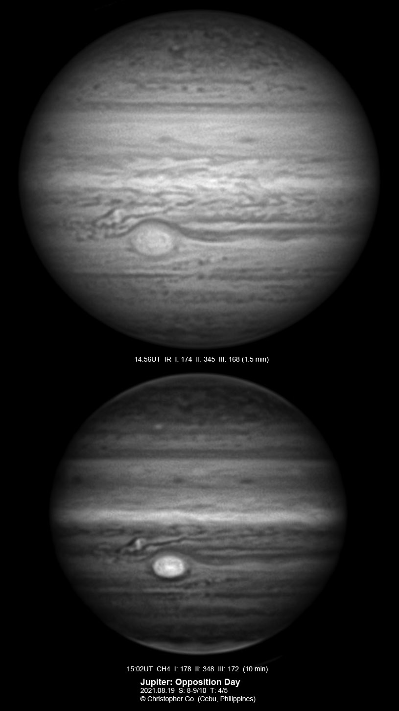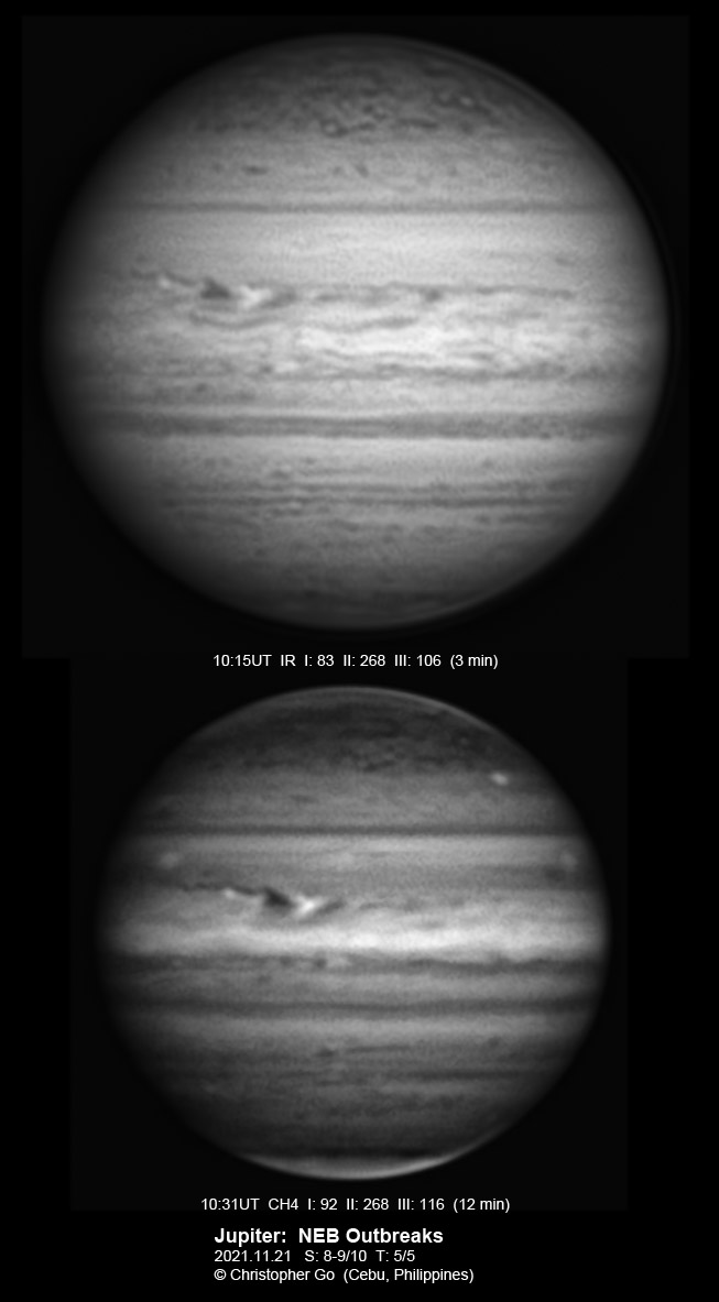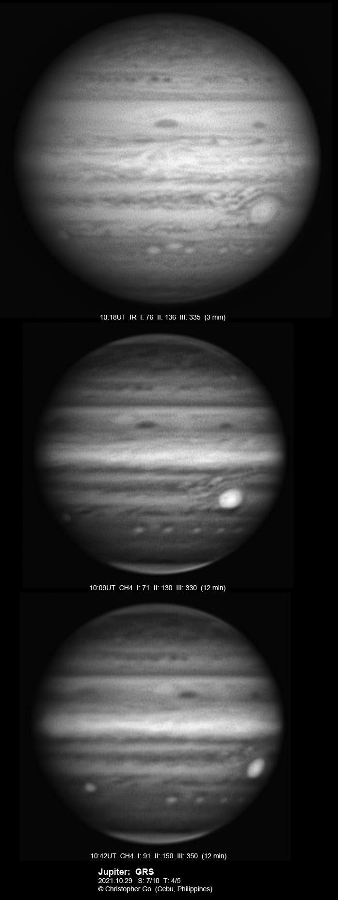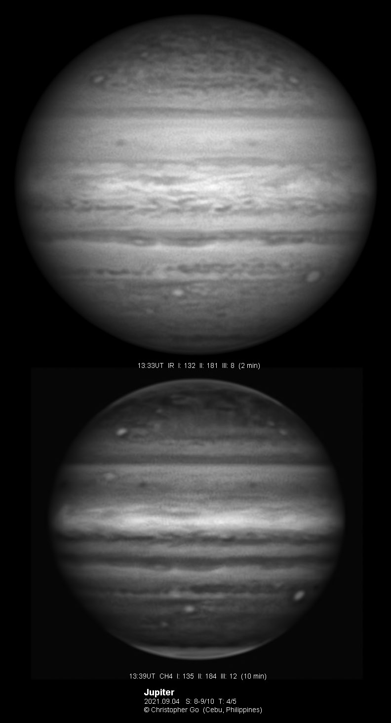 2021 I never expected to image today because there was a huge cloud covering the entire eastern/central Visayas due to a low pressure area. Surprisingly, the sky cleared! I have been praying the Memorare for clear skies tomorrow but it came a day early! Seeing was very good except towards the end of my imaging run. These images show the GRS which is well resolved! Note the two bright outbreaks on the wake of the GRS and a very dark features between these two outbreaks. The remnant of the STB outbreak has become dark in visible light but there are some bright areas at IR especially at the methane band. The STB seem to have darkened like the rest of the southern part of Jupiter. The Mid-EZ still has the reddish band while the NEB is very pale!