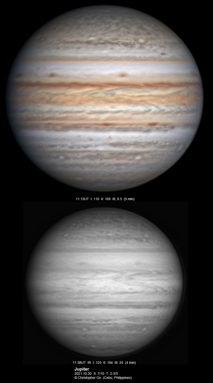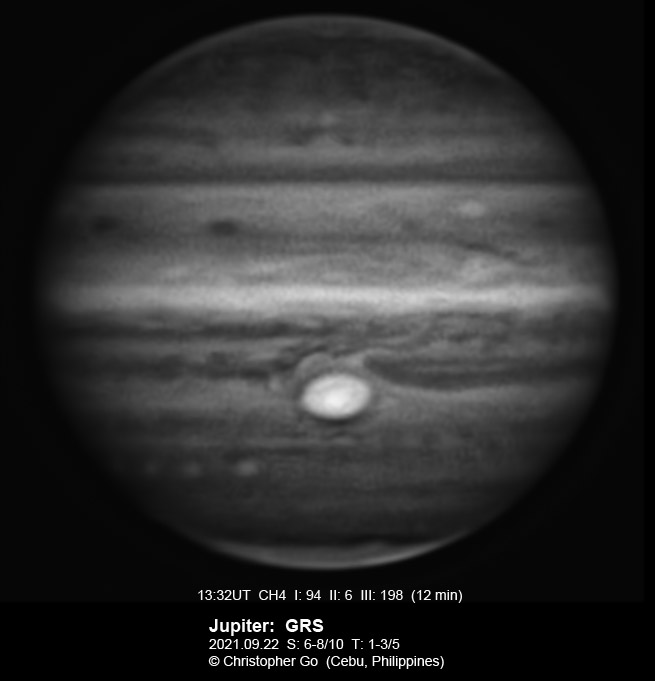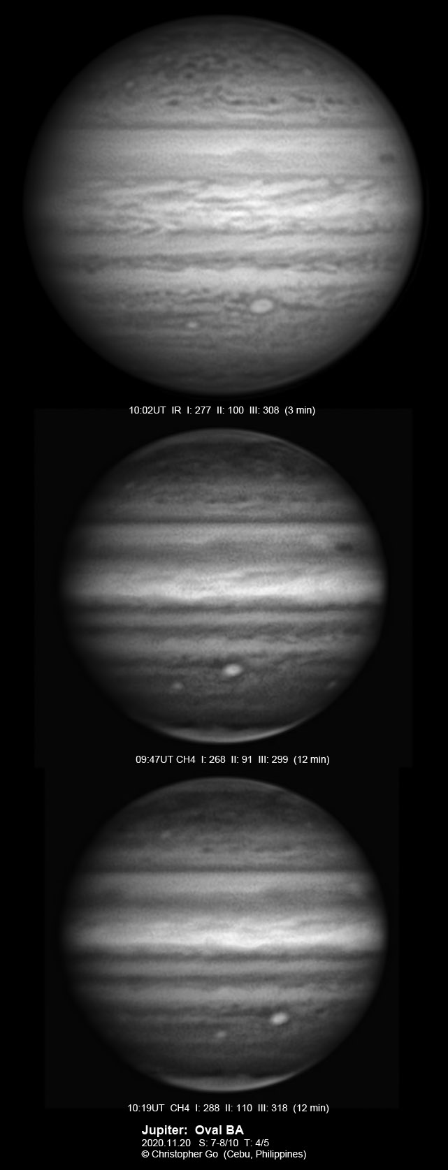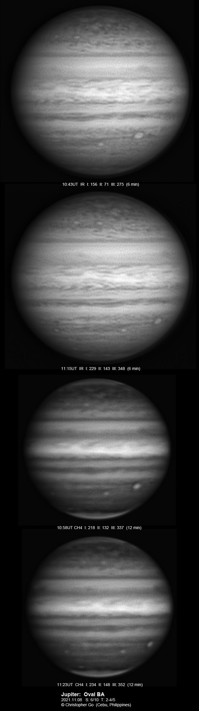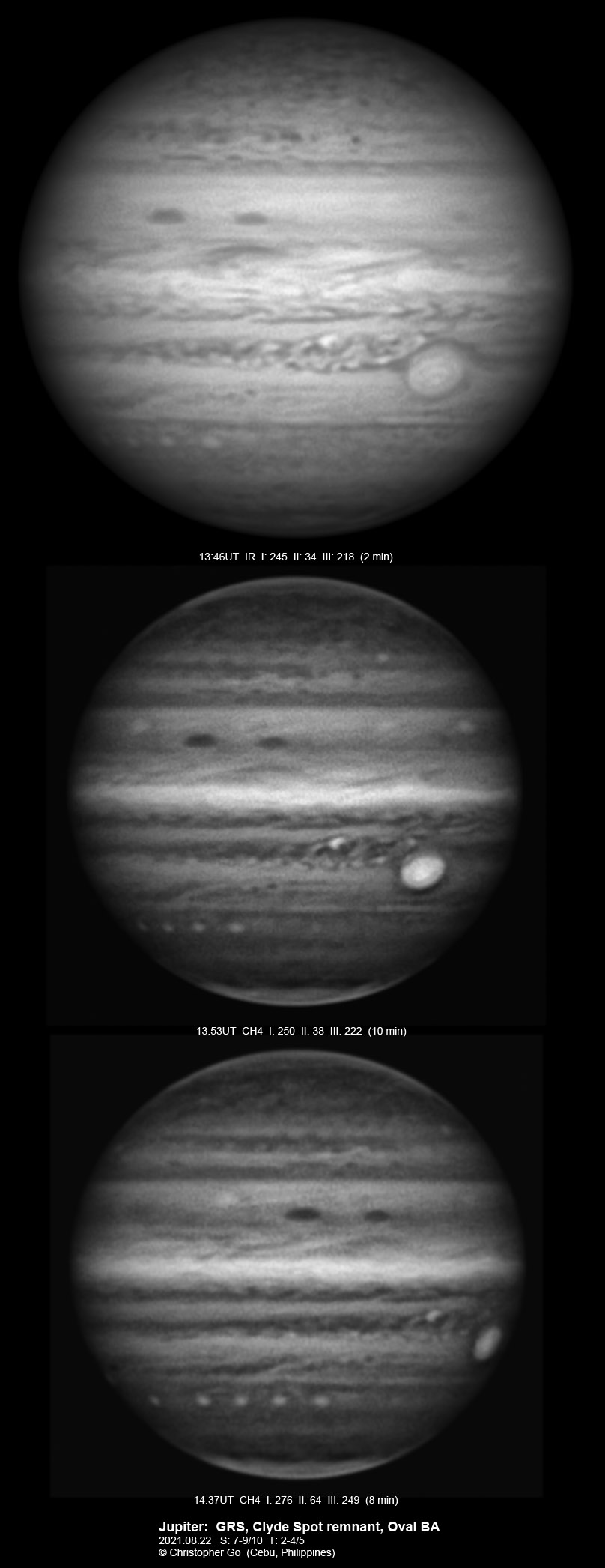 2021 I never expected to image today because there was a huge cloud covering the entire eastern/central Visayas due to a low pressure area. Surprisingly, the sky cleared! I have been praying the Memorare for clear skies tomorrow but it came a day early! Seeing was very good except towards the end of my imaging run. These images show the GRS which is well resolved! Note the two bright outbreaks on the wake of the GRS and a very dark features between these two outbreaks. The remnant of the STB outbreak has become dark in visible light but there are some bright areas at IR especially at the methane band. The STB seem to have darkened like the rest of the southern part of Jupiter. The Mid-EZ still has the reddish band while the NEB is very pale!