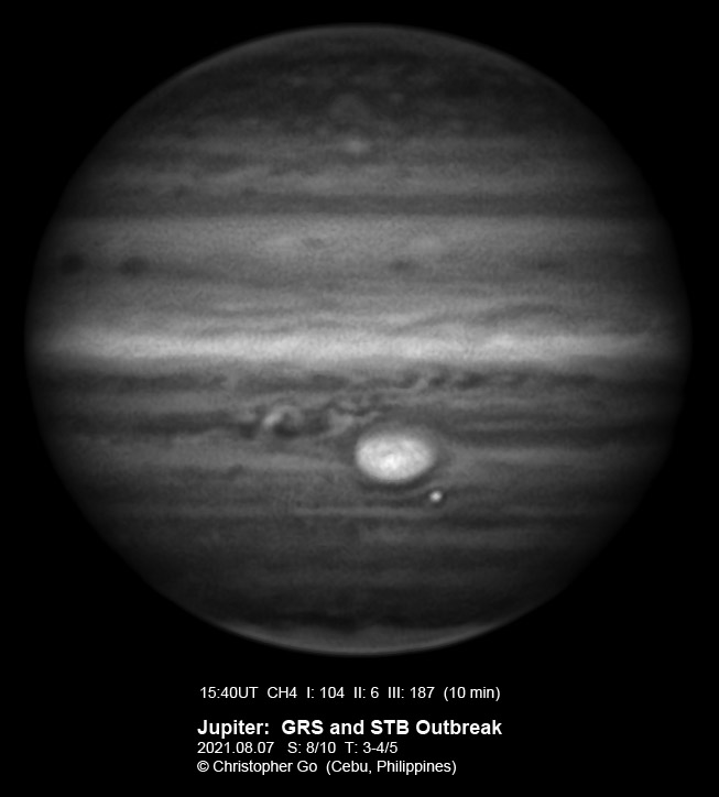 2021 We had horrible weather during the last two days due to a low pressure area close to our location. Today I had a short clearing. I had to image early to catch the GRS. Jupiter was only around 45 deg when I took these images. The STB outbreak has faded and is not as bright as when I discovered on August 7. But it is still bright in methane band. Dark features are forming around the outbreak like what happened last year during the formation of Clyde's Spot! The GRS is well resolved. Note the bright outbreak on the wake of the GRS. Note the features inside the GRS both on the color image and on the methane band image.