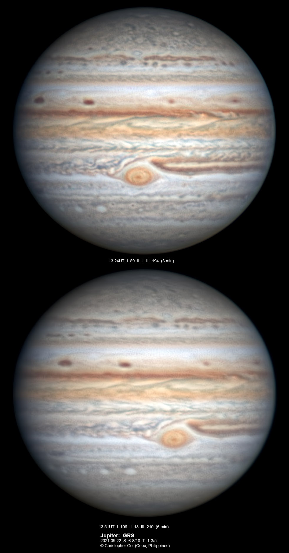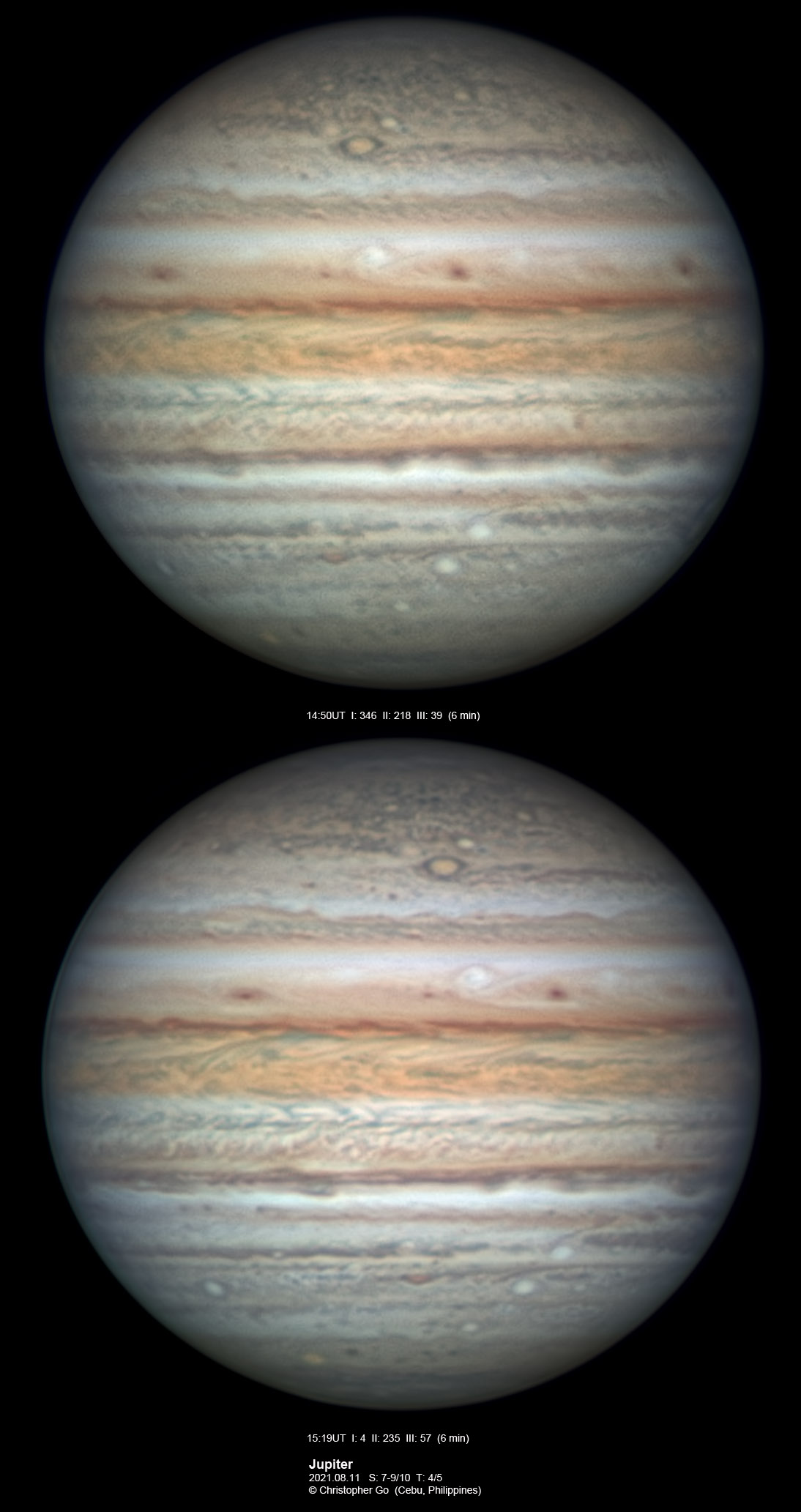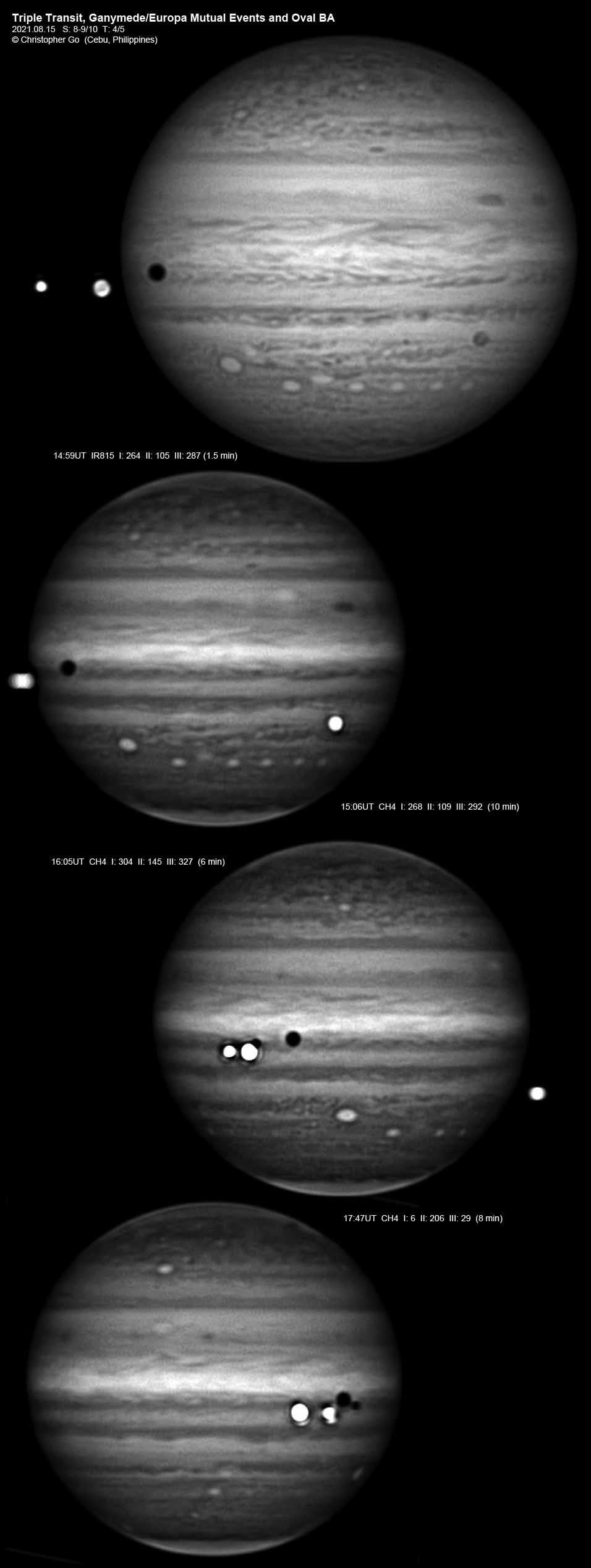 2021 The day I have been waiting for all year has finally come. Today we had a grand slam event. A very rare triple transit on Jupiter with the moons Callisto, Ganymede and Europa in transit. As a bonus, a partially eclipsed Io was seen just before it went behind Jupiter. After the triple transit there was very rare event when Ganymede occulted Europa followed by Ganymede eclipsing Europa! Seeing the shadow of Ganymede over Europa was surreal! Tonight was exceptional. Everything went PERFECTLY. Seeing was incredible and the sky was totally clear! There was a low pressure area over Luzon right now and it was mostly cloudy all day! But it just cleared during the start of the grand slam event! My friend Val Abapo who was imaging around 30 miles south of me did not have the perfect seeing I had. It was incredible that the seeing held up at around 8-9/10 througout my imaging run! I guess praying many Memorare on the Feast of the Assumption really helped! Other than the mutual events, Oval BA is prominent and it still has a pale orange color. Note the cyclone NE of Oval BA. Below is the link to the animation video: