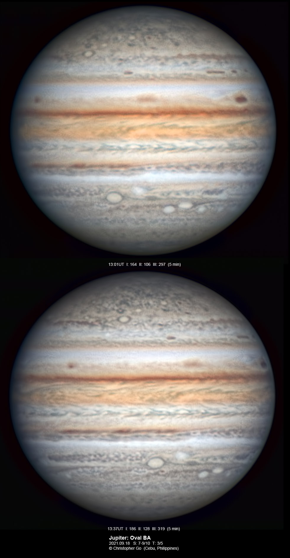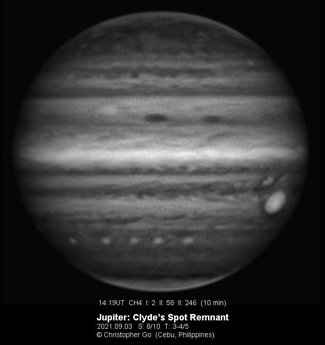 2021 It was a cloudy and rainy day. But the sky cleared when evening came. Transparency was poor due to haze but seeing was good. Oval BA can be seen in these images. It is still very pale with a faint orange ring. The STB is very active. Note the remnant of Clyde's spot which shows a strange black feature. The NEB and SEB are very pale in this region. Note the methane bright feature on the EZ rising on the left.