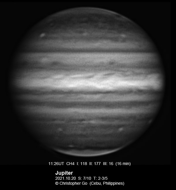 JUPITER 2021 SEASON By Christopher Go All images were taken using a Celestron C14 mounted on an Astrophysics AP900GTO mount. A QHY 290M camera was used is these images. RGB is done using a set of Chroma Technology RGB filters on a Starlight Xpress Motorized filter wheel. Methane band images are done using a Chroma Methane Band filter (889nm 18nm bandpass). UV images are done using a Astrodon UV filter. Amplification is done using an Astrophysics Advance Convertible Barlow working at 2.0X. Image acquisition was done using Torsten Edelmann's Firecapture 2.5beta 64bit software. All images are NORTH UP! Processing was done using AutoStakkert! and Registax. These images were taken at Banilad, Cebu City, Philippines. For more information on the names of various belts and zones of Jupiter and the meaning of the abbreviations I use please check the Sky and Telescope Jupiter Observing Guide. All images of this site are my property. If you wish to publish it on your site or print, please email me for permission. |