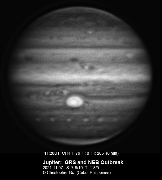 2021 We had a horrible monsoon weather the past week. This was due to two typhoons in our region that enhanced the SW monsoon. I had a short break this evening. Seeing was variable but transparency was poor due to clouds and haze. The STB area preceding the GRS looks interesting. Note the remnant of last month's STB Outbreak. It seems to be interacting with the reddish band to it's south. The GRS is well resolved in the second color image. The chimney above the GRS seems close again. The outbreaks on the wake of the GRS are very active. Note the large methane bright feature on the EZ on the eastern edge. The NEB is very pale. Note the two bright features on the NEBs/EZn above the GRS. These feature however are not bright in methane band.