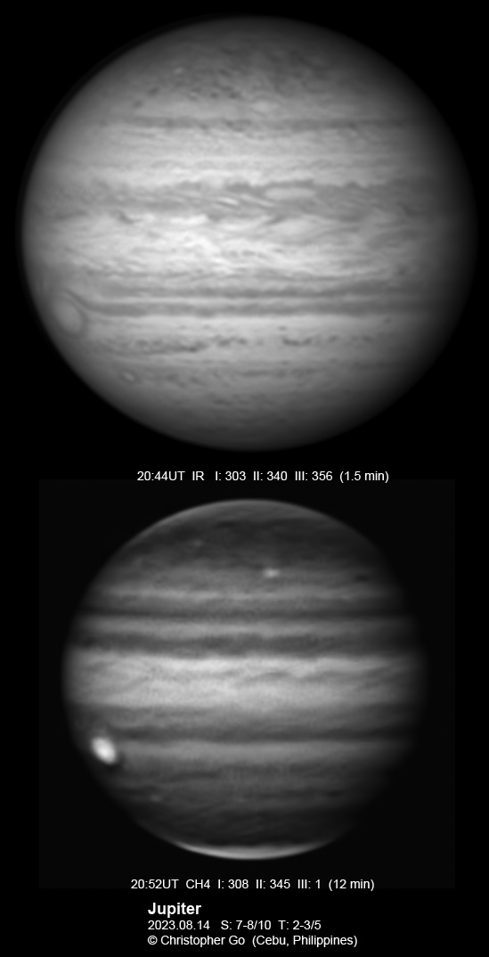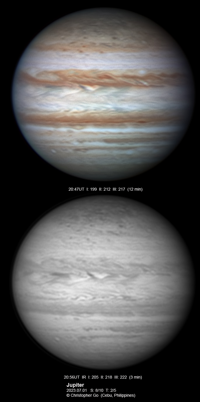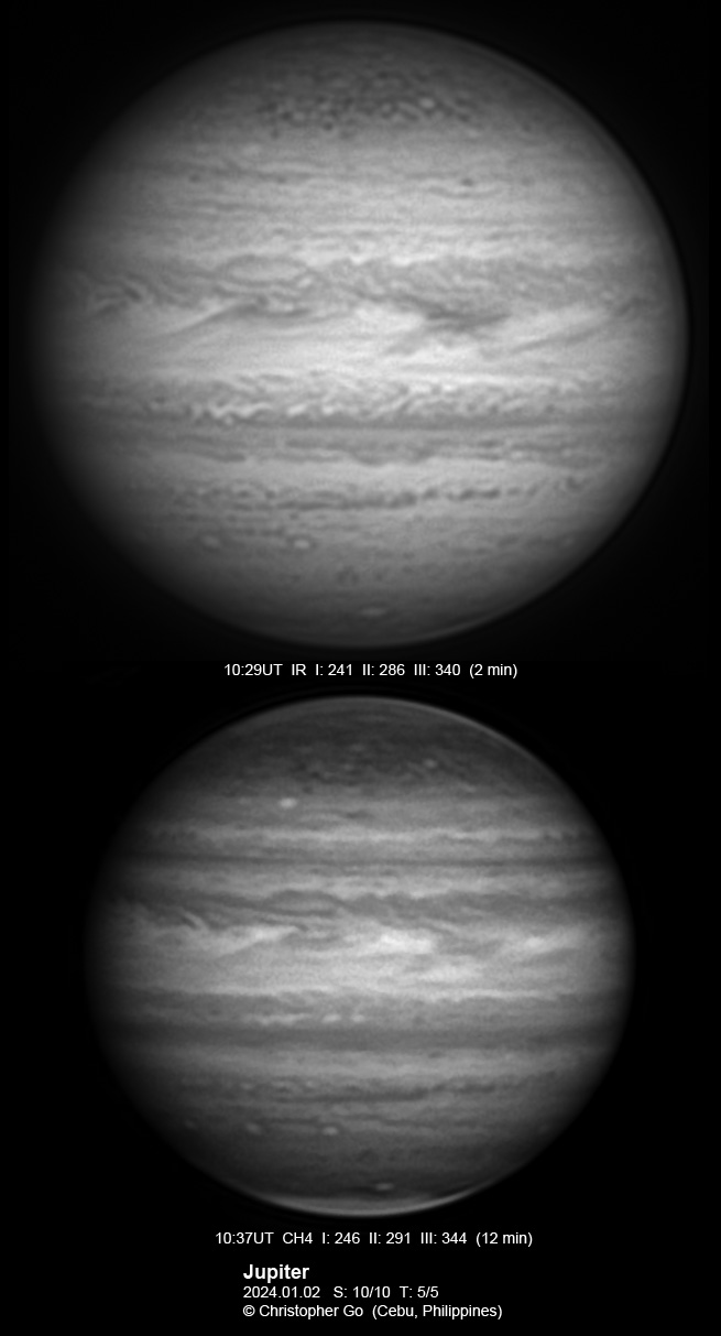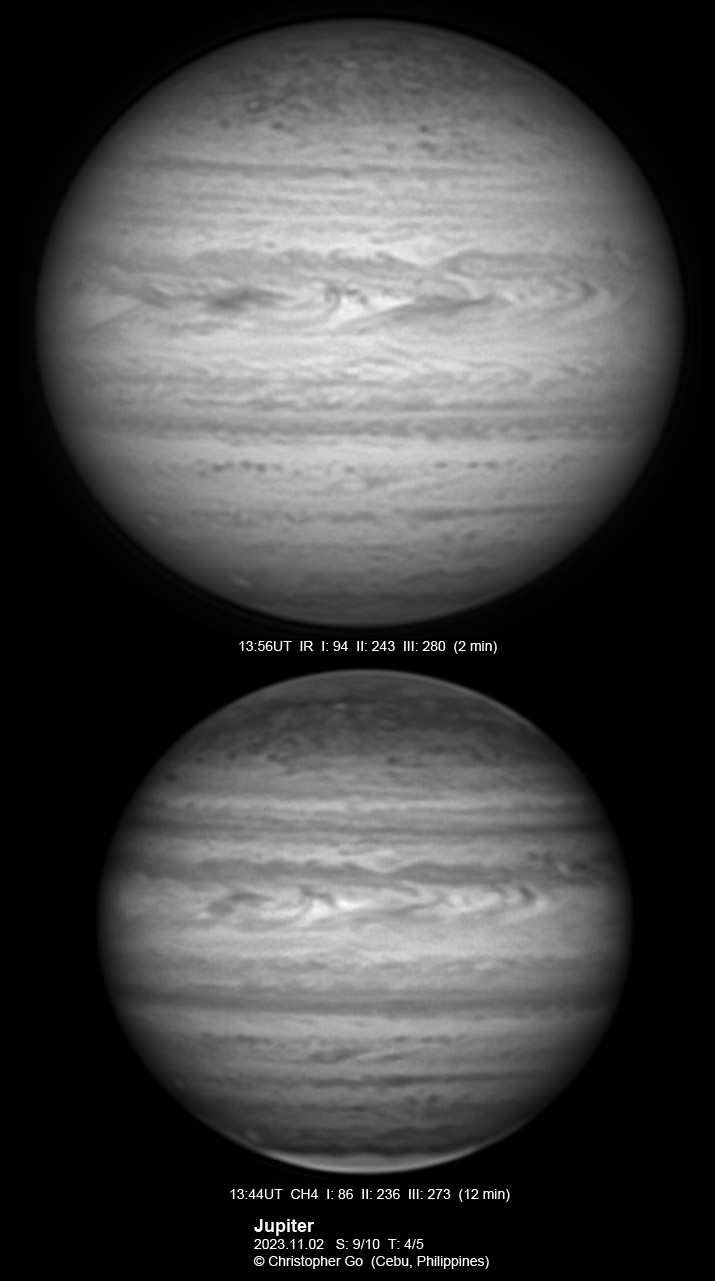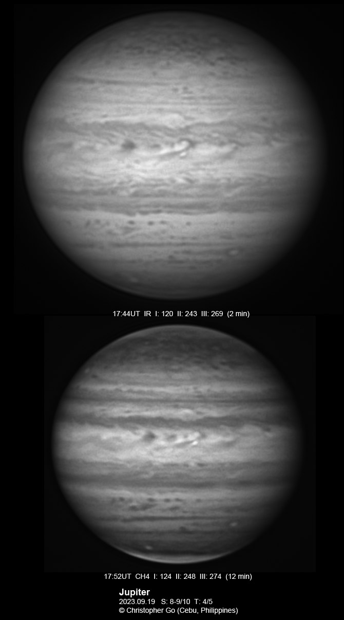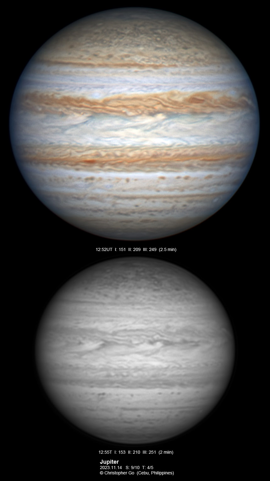 JUPITER 2023 SEASON By Christopher Go All images were taken using a Celestron C14 mounted on an Astrophysics AP900GTO mount. A QHY5III678M and a QHY5III585C camera were used is these images. RGB is done using a set of Chroma Technology RGB filters on a Starlight Xpress Motorized filter wheel. Methane band images are done using a Chroma Methane Band filter (889nm 18nm bandpass). UV images are done using a Astrodon UV filter. Amplification is done using an Astrophysics Advance Convertible Barlow working at 2.0X. Image acquisition was done using Torsten Edelmann's Firecapture 2.7 64bit software. All images are NORTH UP! Processing was done using AutoStakkert! and Registax. These images were taken at Banilad, Cebu City, Philippines. For more information on the names of various belts and zones of Jupiter and the meaning of the abbreviations I use please check the Sky and Telescope Jupiter Observing Guide. All images of this site are my property. If you wish to publish it on your site or print, please email me for permission. |