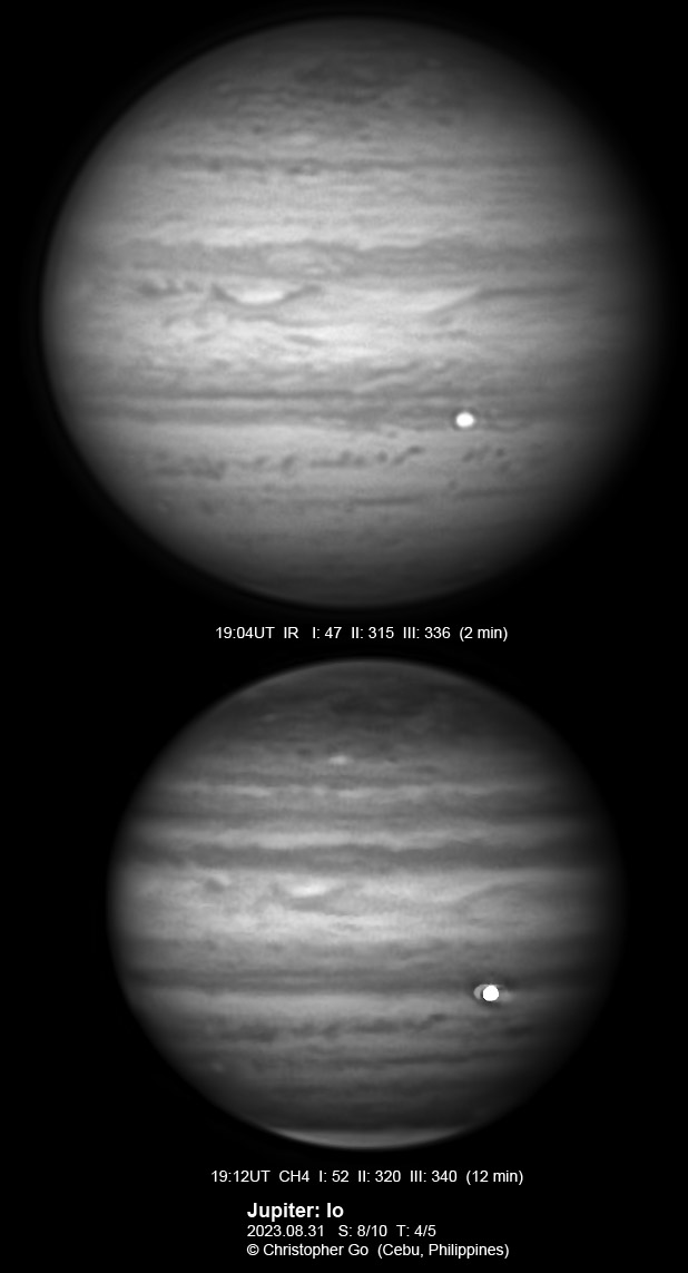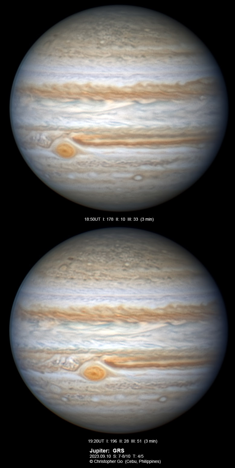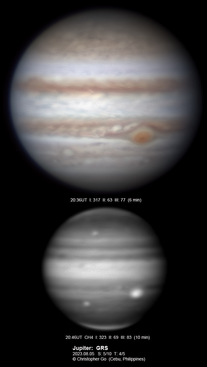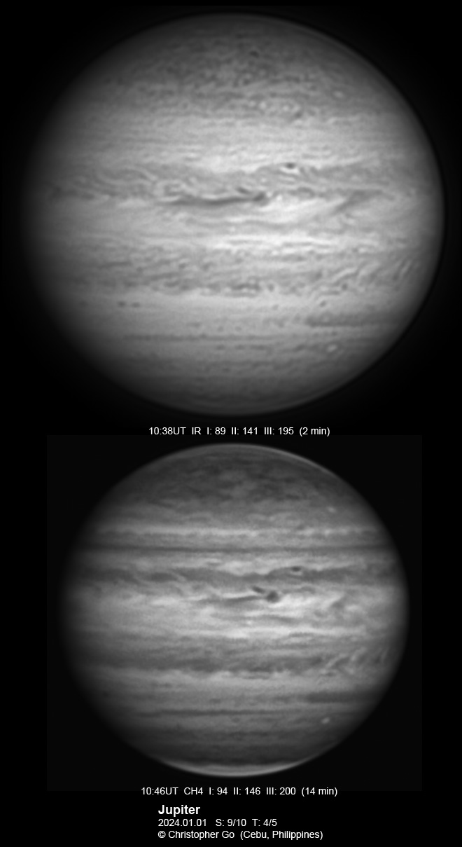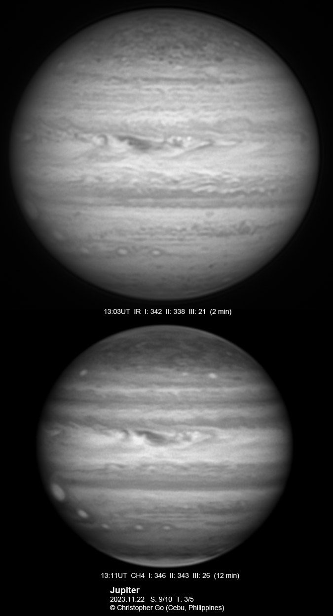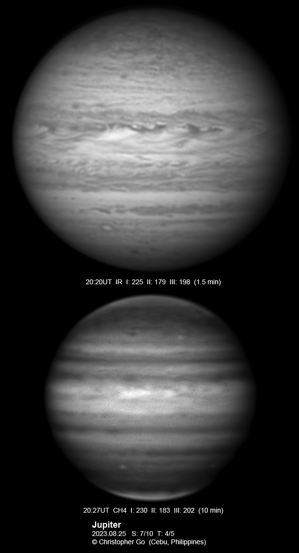 JUPITER 2023 SEASON By Christopher Go All images were taken using a Celestron C14 mounted on an Astrophysics AP900GTO mount. A QHY5III678M and a QHY5III585C camera were used is these images. RGB is done using a set of Chroma Technology RGB filters on a Starlight Xpress Motorized filter wheel. Methane band images are done using a Chroma Methane Band filter (889nm 18nm bandpass). UV images are done using a Astrodon UV filter. Amplification is done using an Astrophysics Advance Convertible Barlow working at 2.0X. Image acquisition was done using Torsten Edelmann's Firecapture 2.7 64bit software. All images are NORTH UP! Processing was done using AutoStakkert! and Registax. These images were taken at Banilad, Cebu City, Philippines. For more information on the names of various belts and zones of Jupiter and the meaning of the abbreviations I use please check the Sky and Telescope Jupiter Observing Guide. All images of this site are my property. If you wish to publish it on your site or print, please email me for permission. |