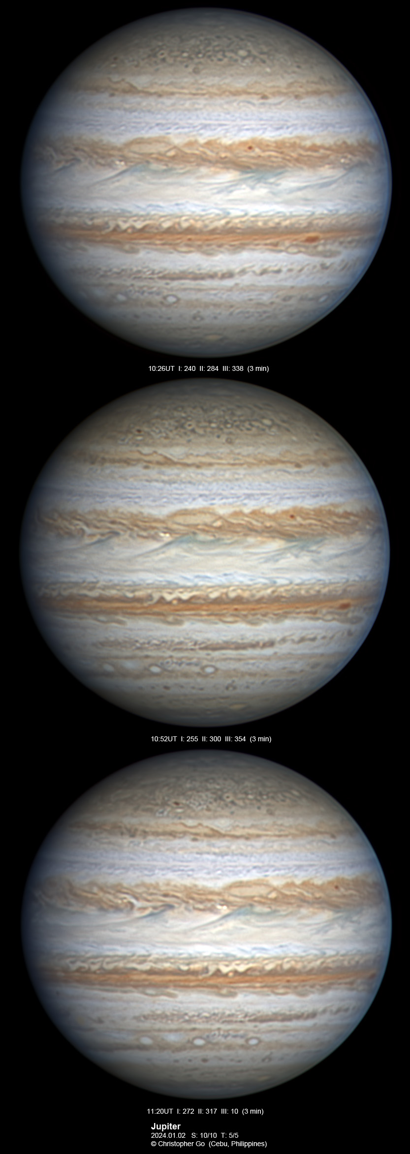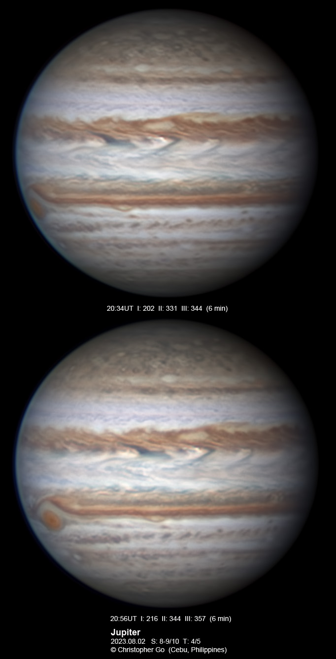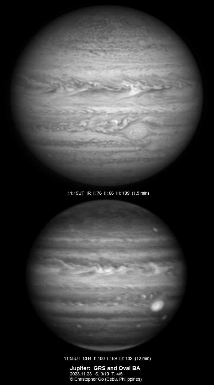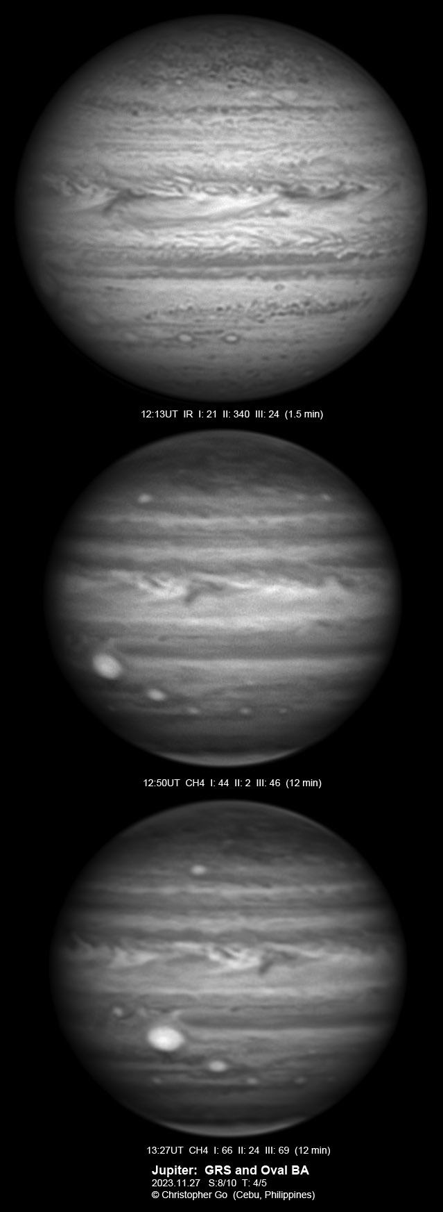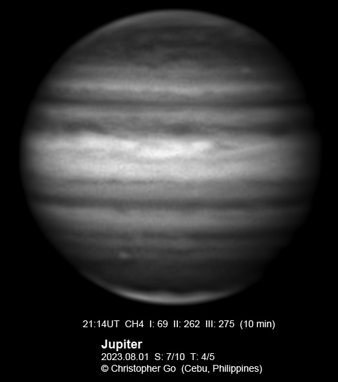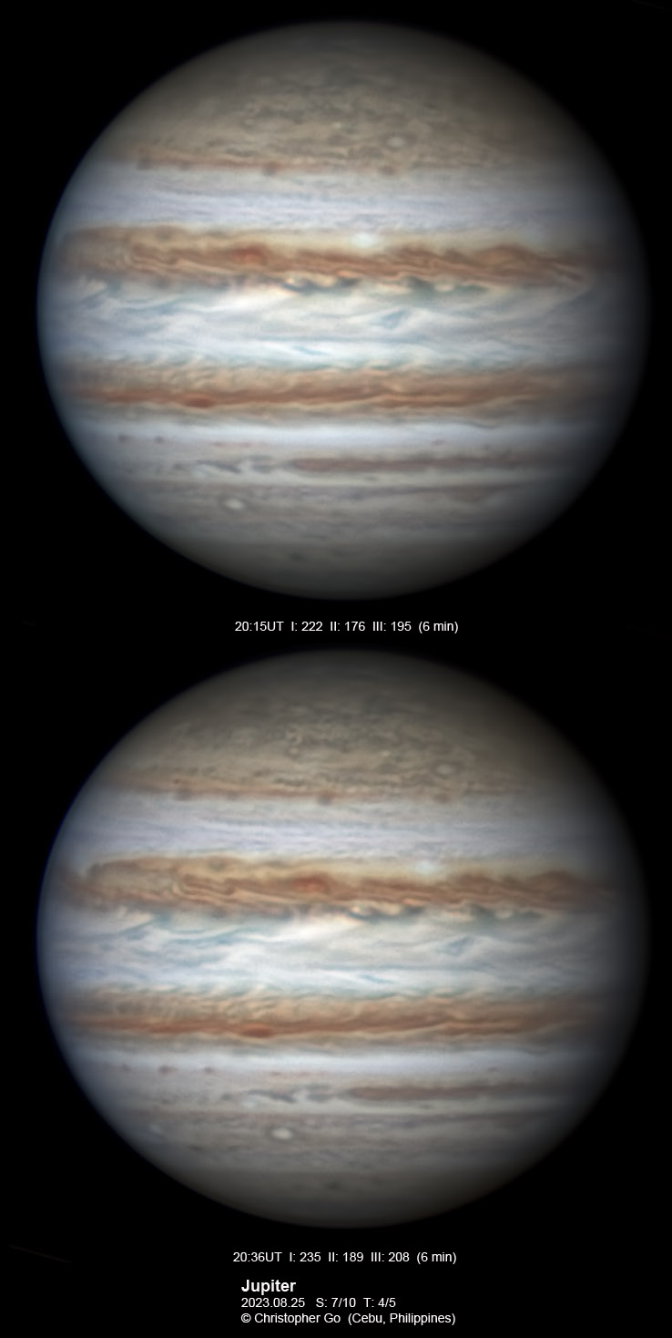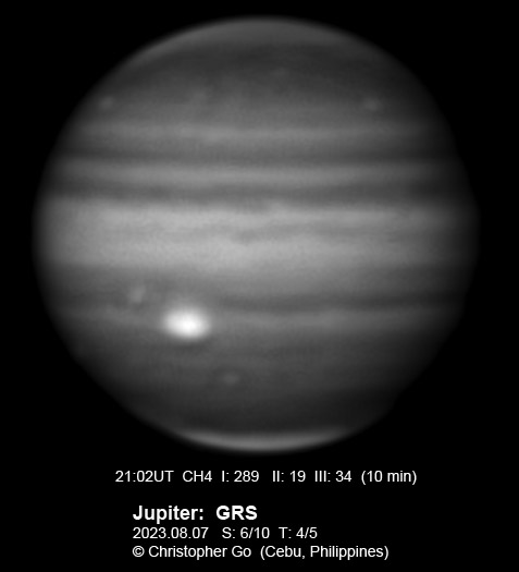 JUPITER 2023 SEASON By Christopher Go All images were taken using a Celestron C14 mounted on an Astrophysics AP900GTO mount. A QHY5III678M and a QHY5III585C camera were used is these images. RGB is done using a set of Chroma Technology RGB filters on a Starlight Xpress Motorized filter wheel. Methane band images are done using a Chroma Methane Band filter (889nm 18nm bandpass). UV images are done using a Astrodon UV filter. Amplification is done using an Astrophysics Advance Convertible Barlow working at 2.0X. Image acquisition was done using Torsten Edelmann's Firecapture 2.7 64bit software. All images are NORTH UP! Processing was done using AutoStakkert! and Registax. These images were taken at Banilad, Cebu City, Philippines. For more information on the names of various belts and zones of Jupiter and the meaning of the abbreviations I use please check the Sky and Telescope Jupiter Observing Guide. All images of this site are my property. If you wish to publish it on your site or print, please email me for permission. |