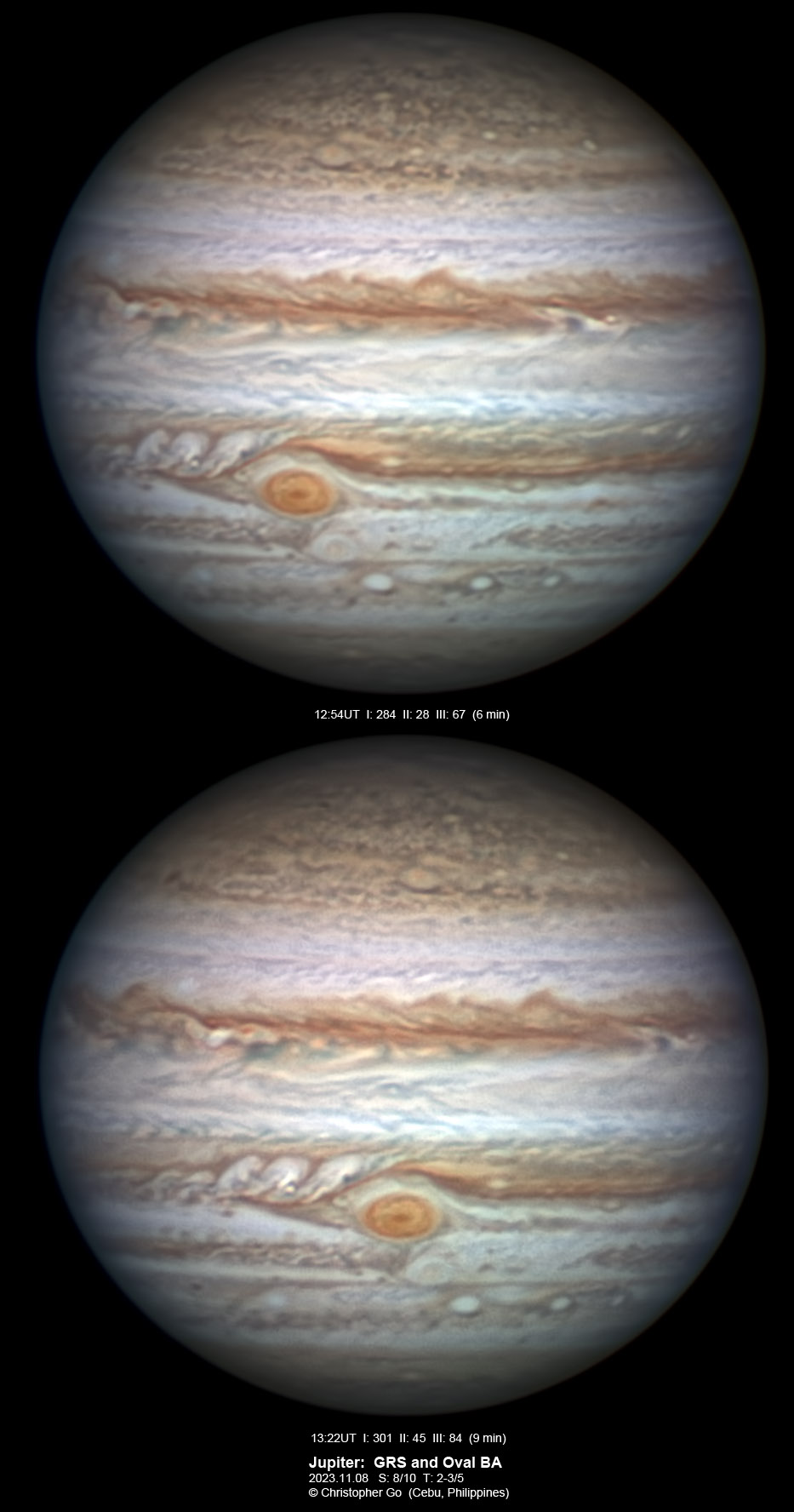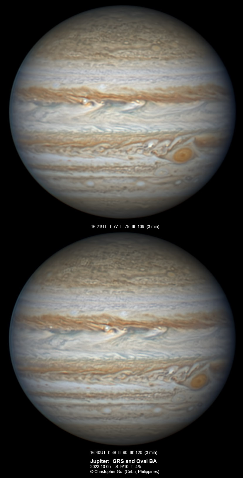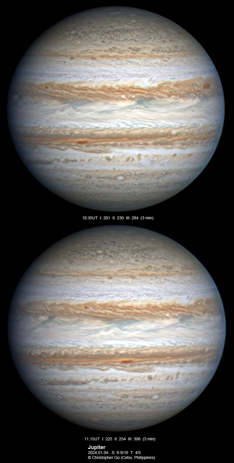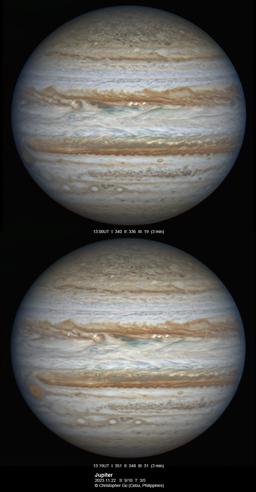 JUPITER 2023 SEASON By Christopher Go All images were taken using a Celestron C14 mounted on an Astrophysics AP900GTO mount. A QHY5III678M and a QHY5III585C camera were used is these images. RGB is done using a set of Chroma Technology RGB filters on a Starlight Xpress Motorized filter wheel. Methane band images are done using a Chroma Methane Band filter (889nm 18nm bandpass). UV images are done using a Astrodon UV filter. Amplification is done using an Astrophysics Advance Convertible Barlow working at 2.0X. Image acquisition was done using Torsten Edelmann's Firecapture 2.7 64bit software. All images are NORTH UP! Processing was done using AutoStakkert! and Registax. These images were taken at Banilad, Cebu City, Philippines. For more information on the names of various belts and zones of Jupiter and the meaning of the abbreviations I use please check the Sky and Telescope Jupiter Observing Guide. All images of this site are my property. If you wish to publish it on your site or print, please email me for permission. |